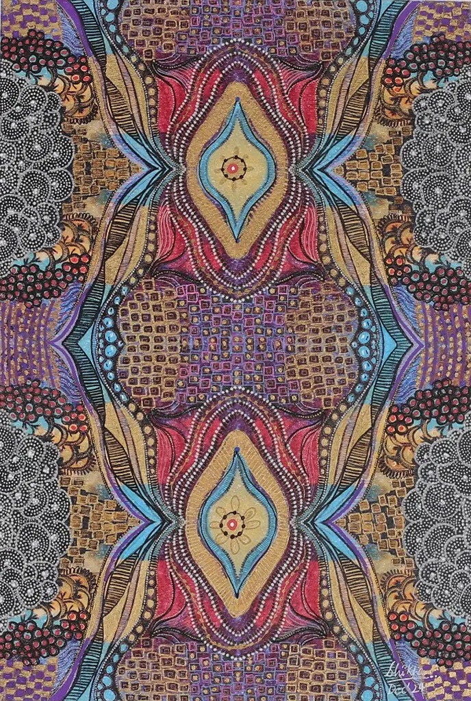 Evoking traditional Indian designs, colorful abstract shapes are decorated with intricate motifs. Inspired by the sign of the rooster from the Chinese zodiac, Shikha Kaistha paints this beautiful composition.