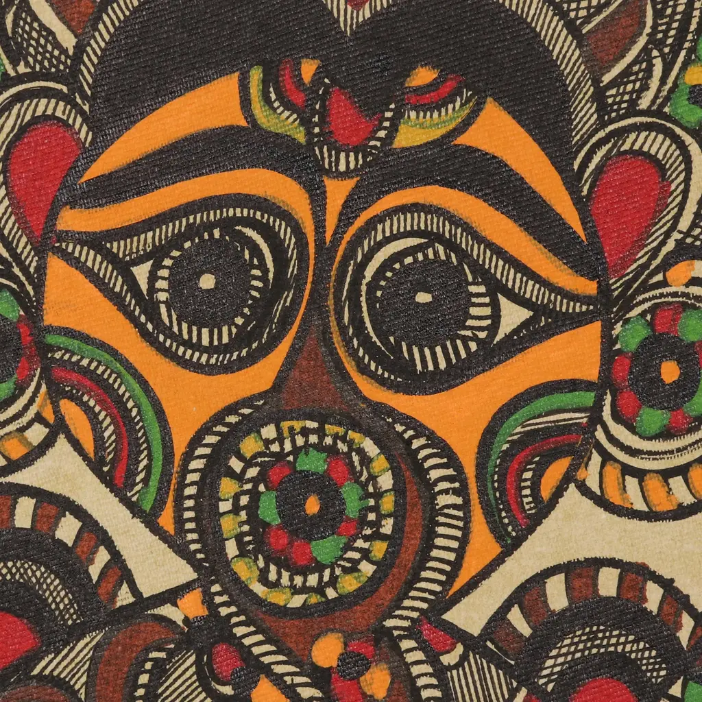 Devendra Kumar Jha works with natural vegetable dyes on handmade paper to create this stunning Madhubani painting. Madhubani, a traditional style of Indian painting, features eye-catching geometric shapes created with fingers, twigs, brushes, nib-pens, and matchsticks. This painting depicts Lord Ganesha, the Hindu god of intellect and wisdom, surrounded by consorts and trees.