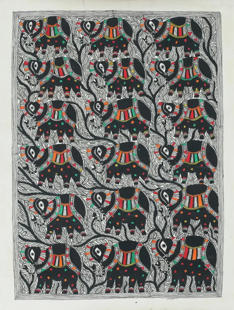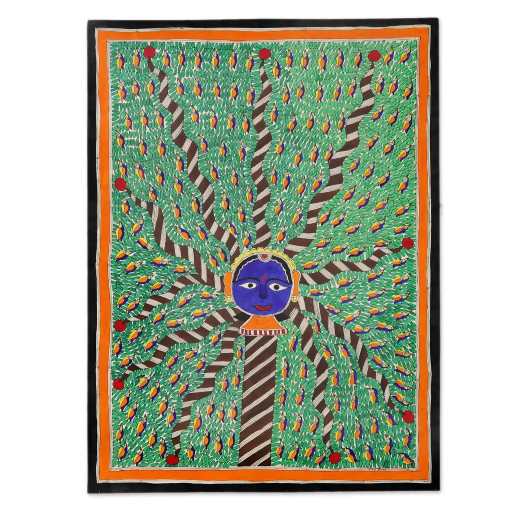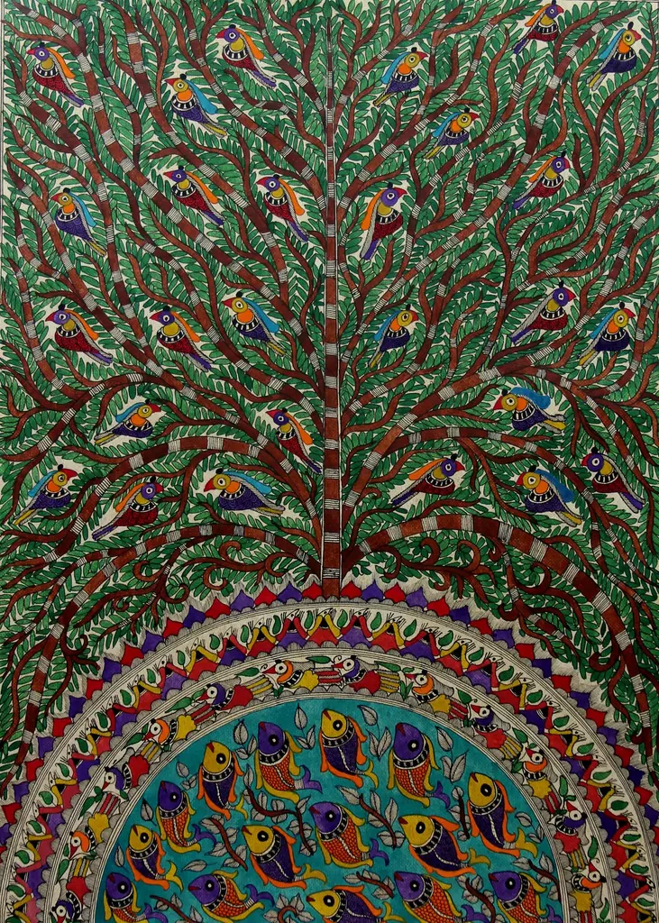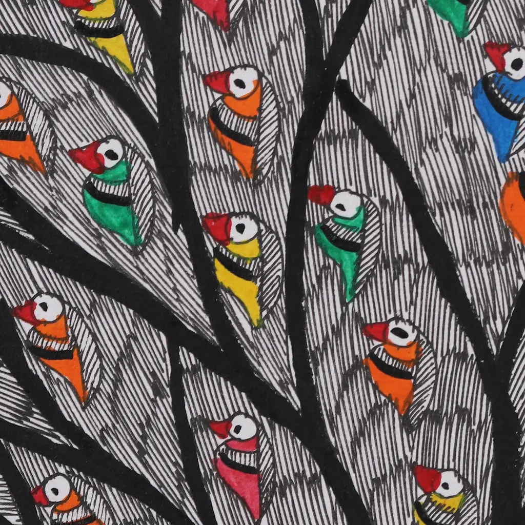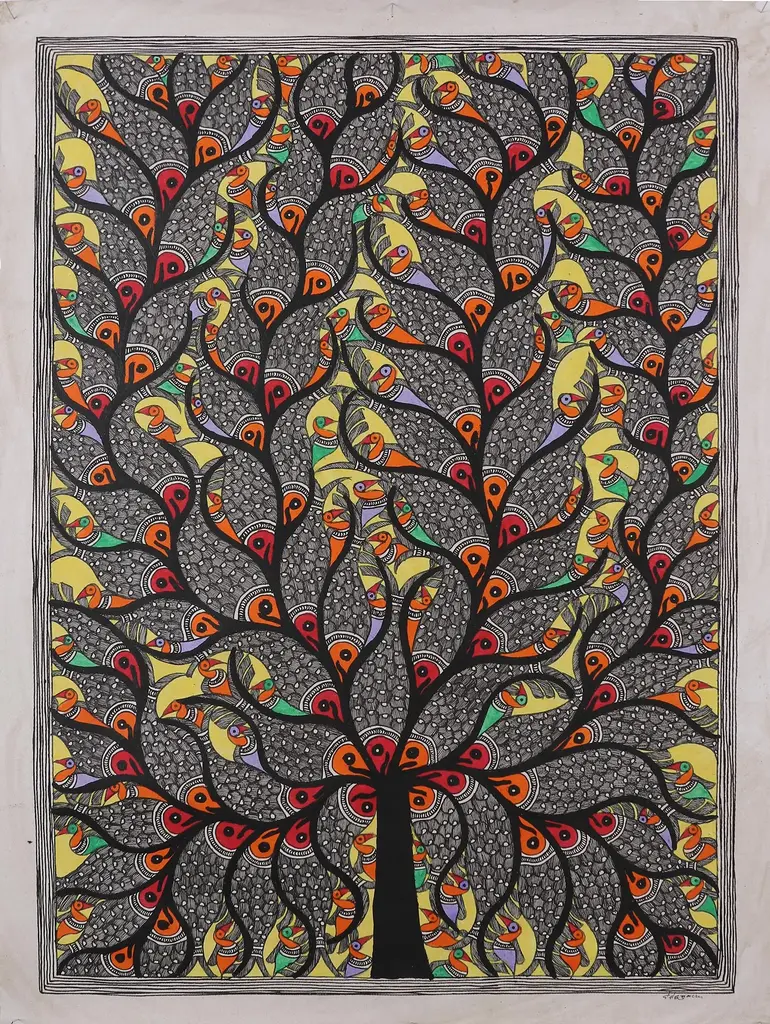 Resting on the branches of a black tree, colorful parrots are diligently painted by hand with vegetable dyes on handmade paper. Devendra Kumar Jha and Family create this painting in the traditional style of Madhubani art, which originates in the Mithila region of India and is typically reserved for women.