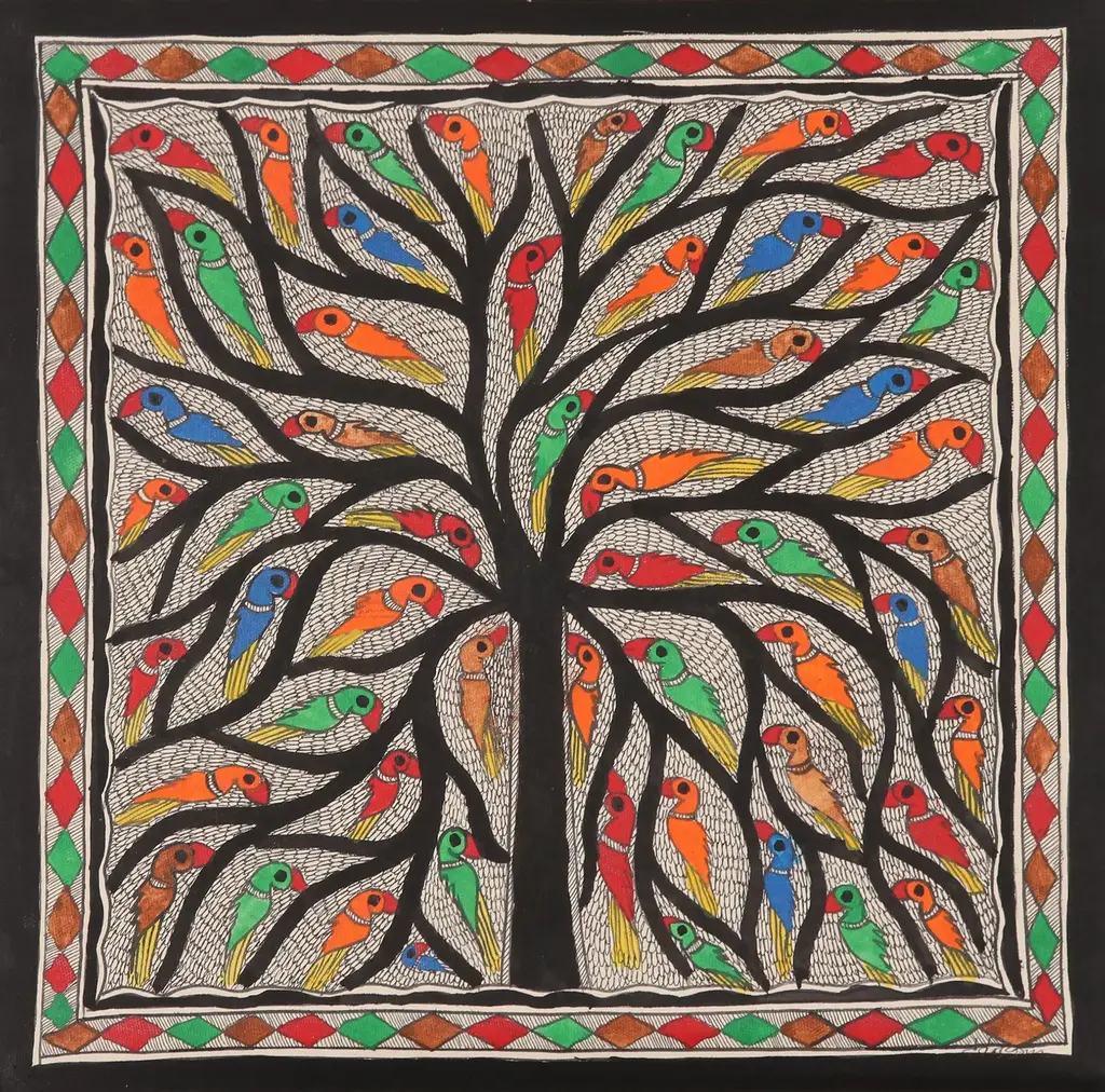 Signed Madhubani Painting Of Parrots In A Tree From India- Parrot Harmony