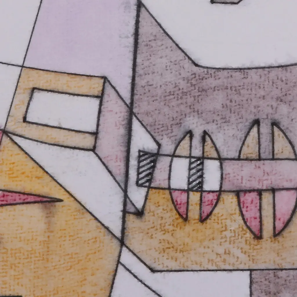 Faces, abstract figures, and the image of a horse all bend and weave together in this striking composition by Indiana artist Sunil Jaiswal. He paints this scene in a stunning cubist style with black outlines and muted colors.