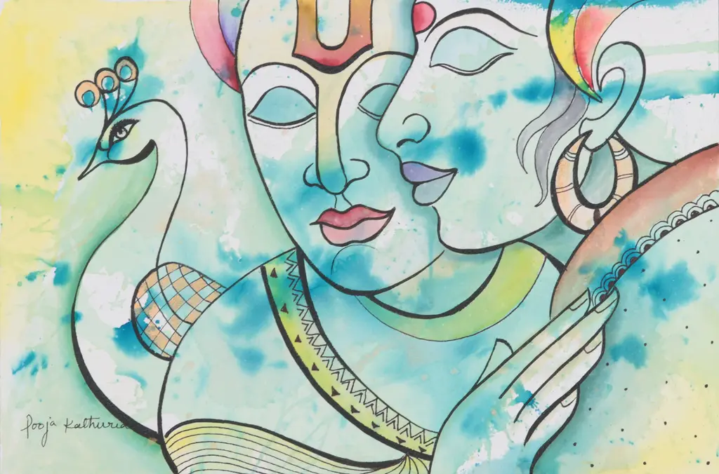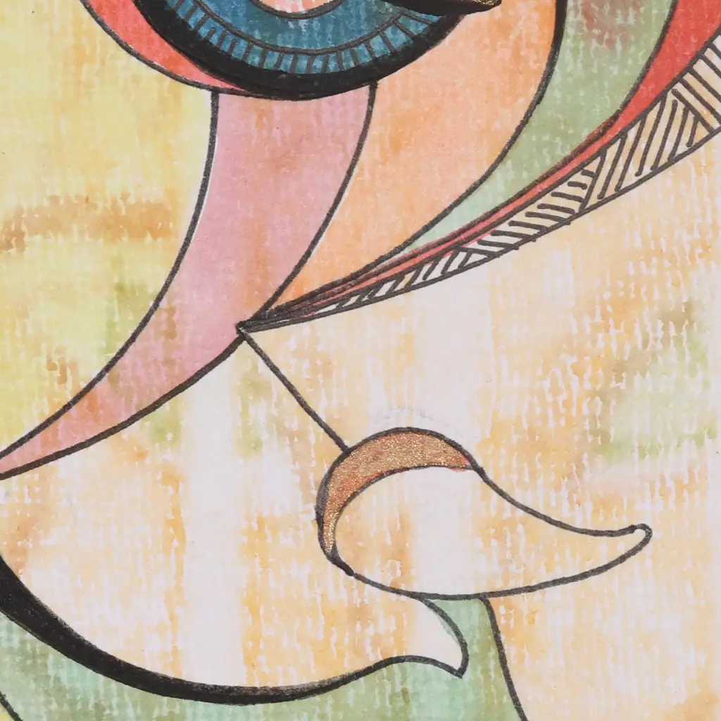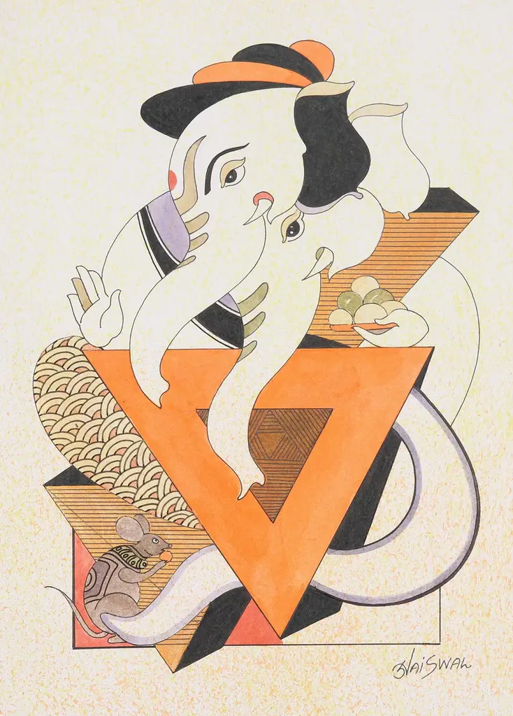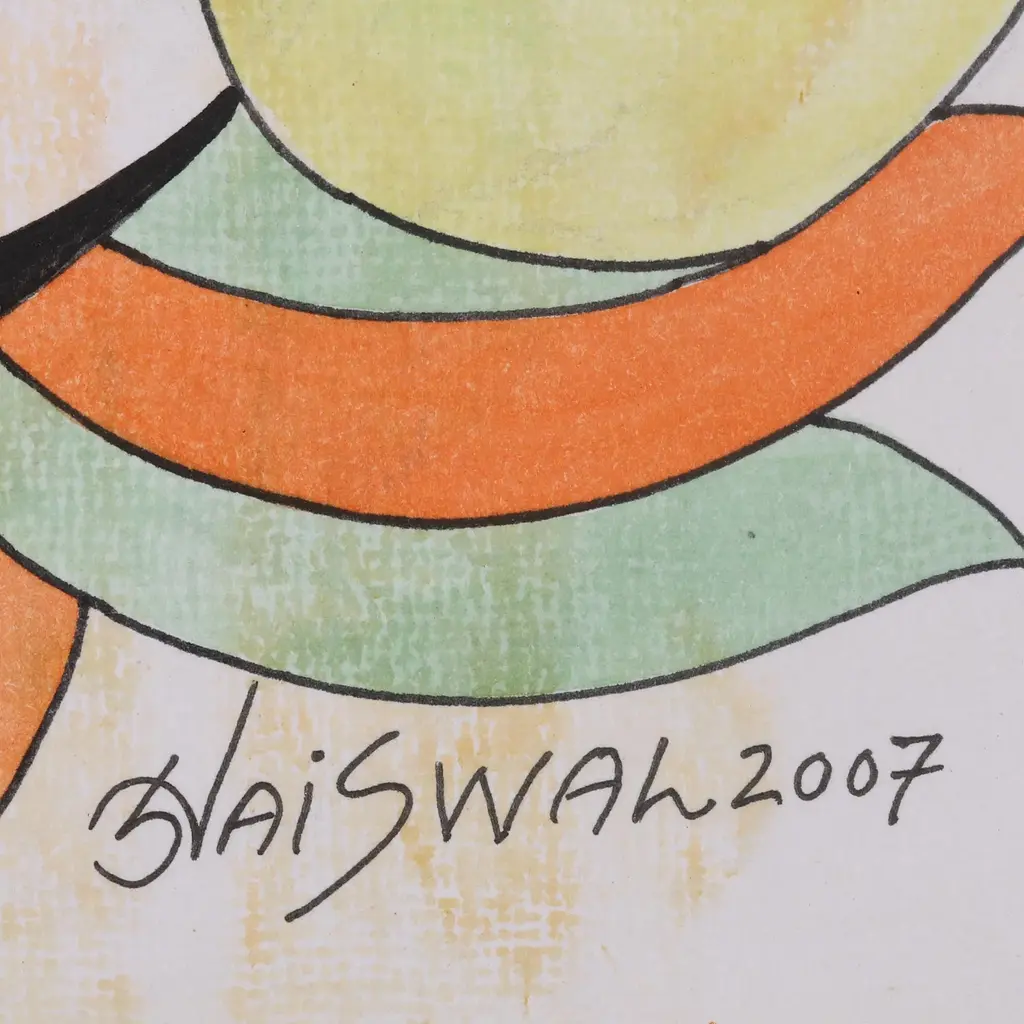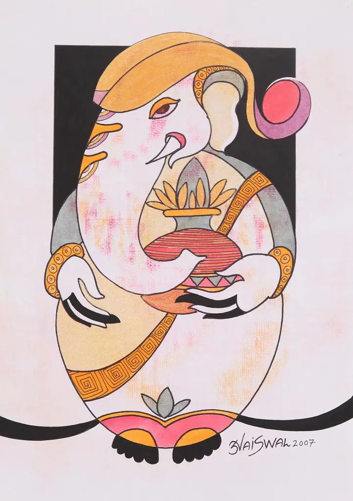 Working in an expressionist style that evokes Indian folk art techniques, Sunil Jaiswal paints this multimedia composition. He uses watercolor, acrylic, and ink on handmade paper to create this stunning depiction of the Hindu god Ganesha. Decorated with beautiful colors and intricate motifs atop a lotus flower, the elephant-headed god holds one hand in a symbol of peace with a bowl of his favorite dessert, laddu, in the other hand. This posture is known as Lalitasana, or "sitting posture."