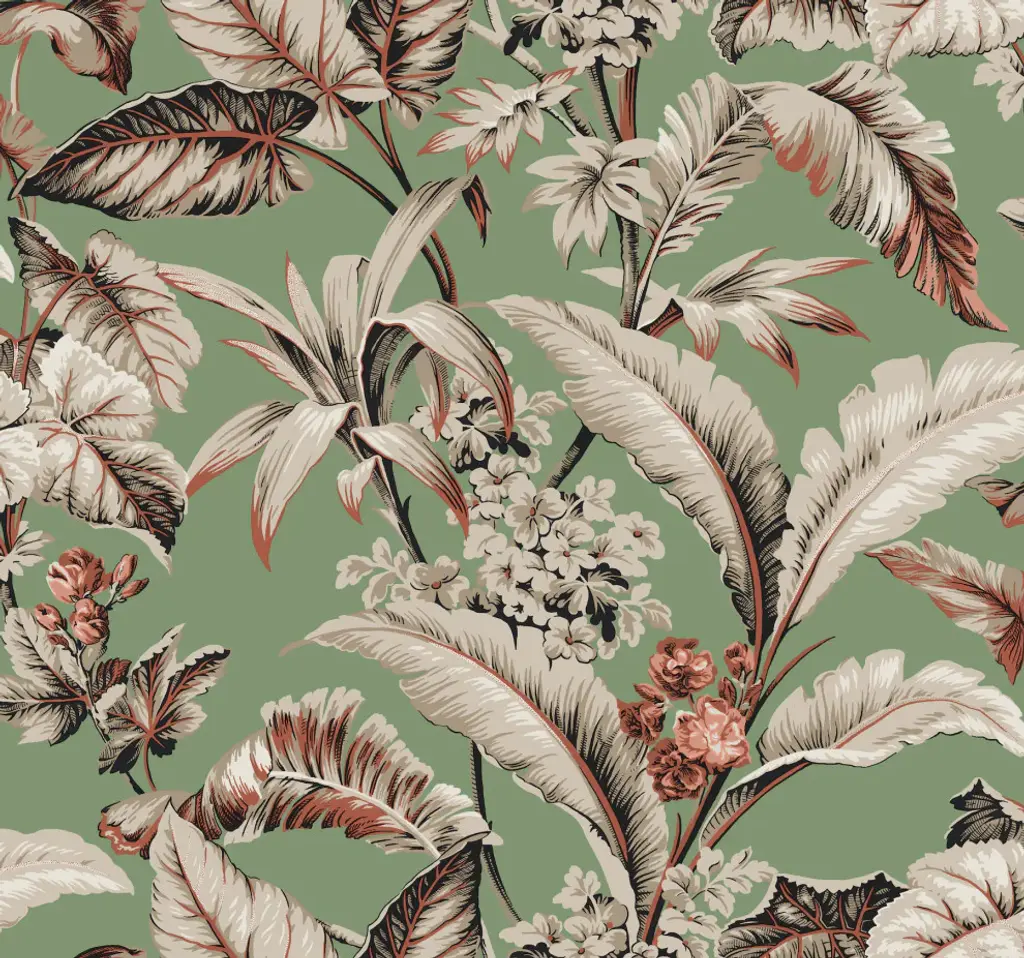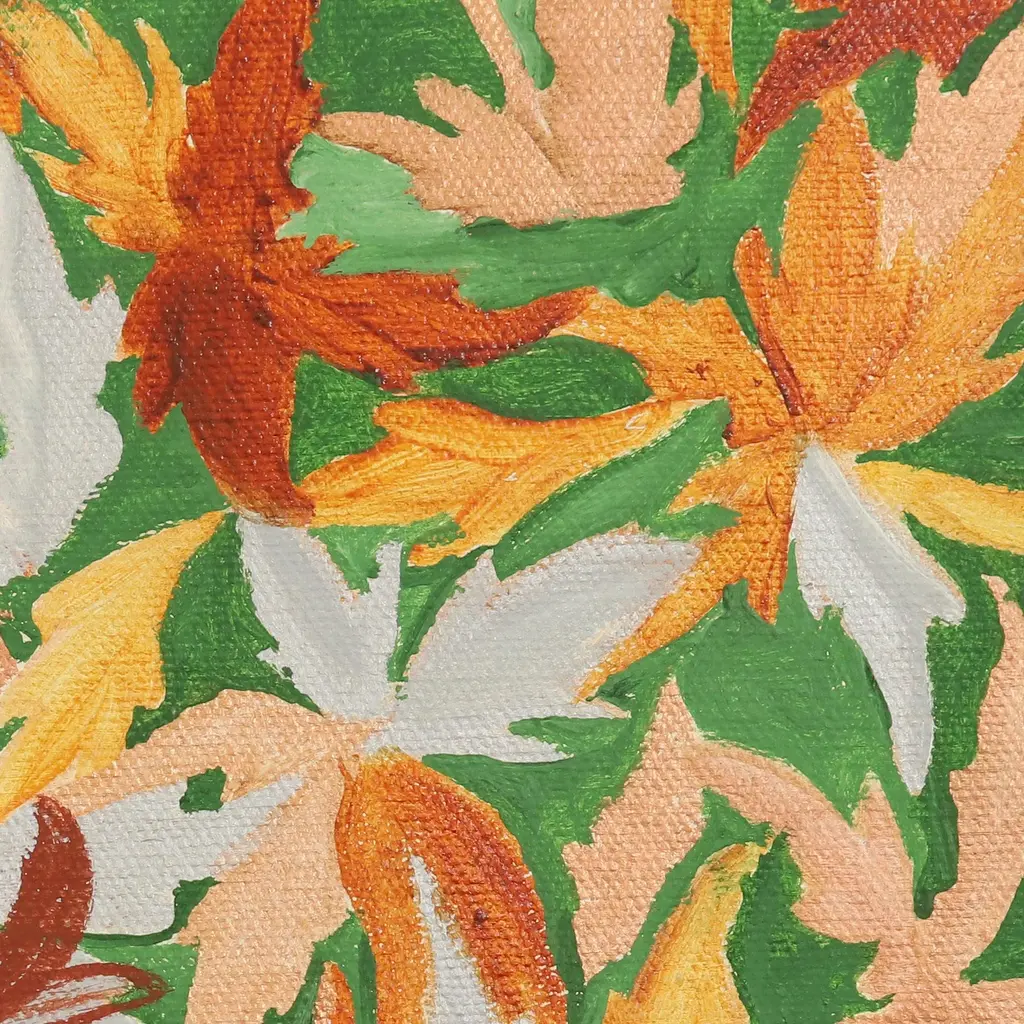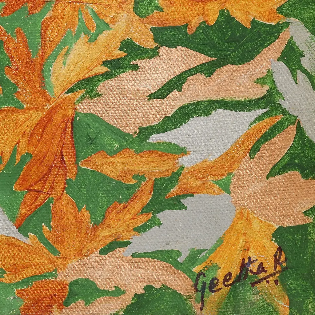 In celebration of nature, Indian artist Geetha paints a composition that captures the liveliness of spring. Against a background of green, she paints freshly fallen leaves from the chinar, or Old World sycamore tree in tones of brown, orange, and white.