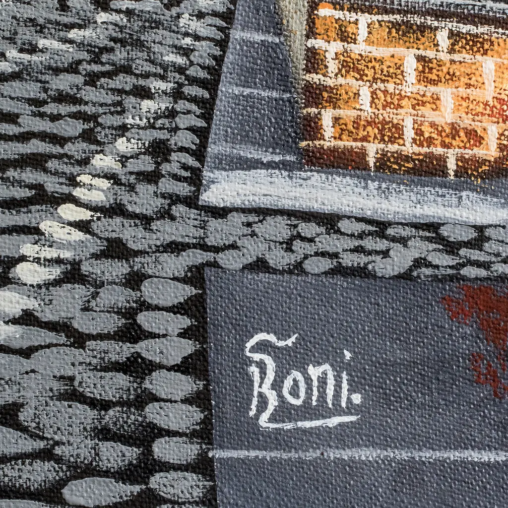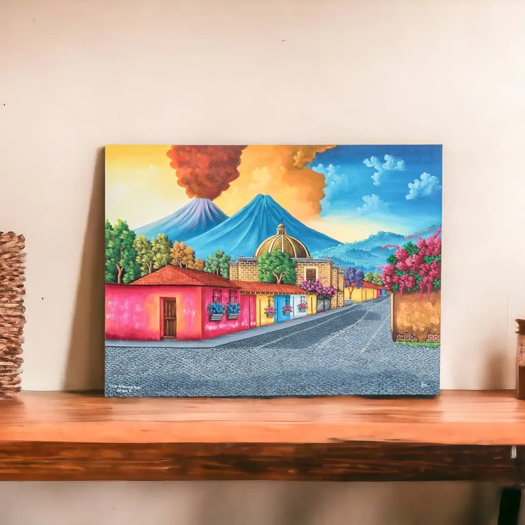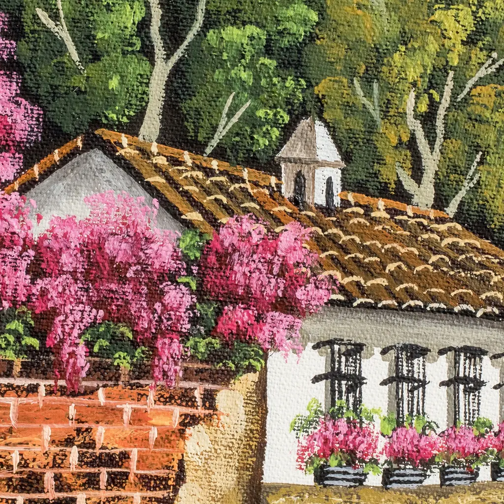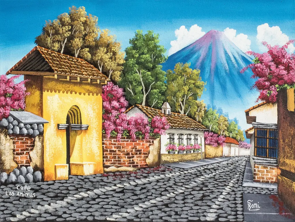 Bright bougainvilleas tumble over yellow stucco walls along a cobblestone lane. In the distance, a volcano stands vigil. "Antigua is inspiring. This is one of its prettiest streets. The colonial-style cobblestone streets attract visitors from everywhere, and Volcan del Agua is like a guardian," Boni says. He shares the beauty of this beloved city in oil on canvas. Titled "Calle de las Ánimas II" in Spanish.
