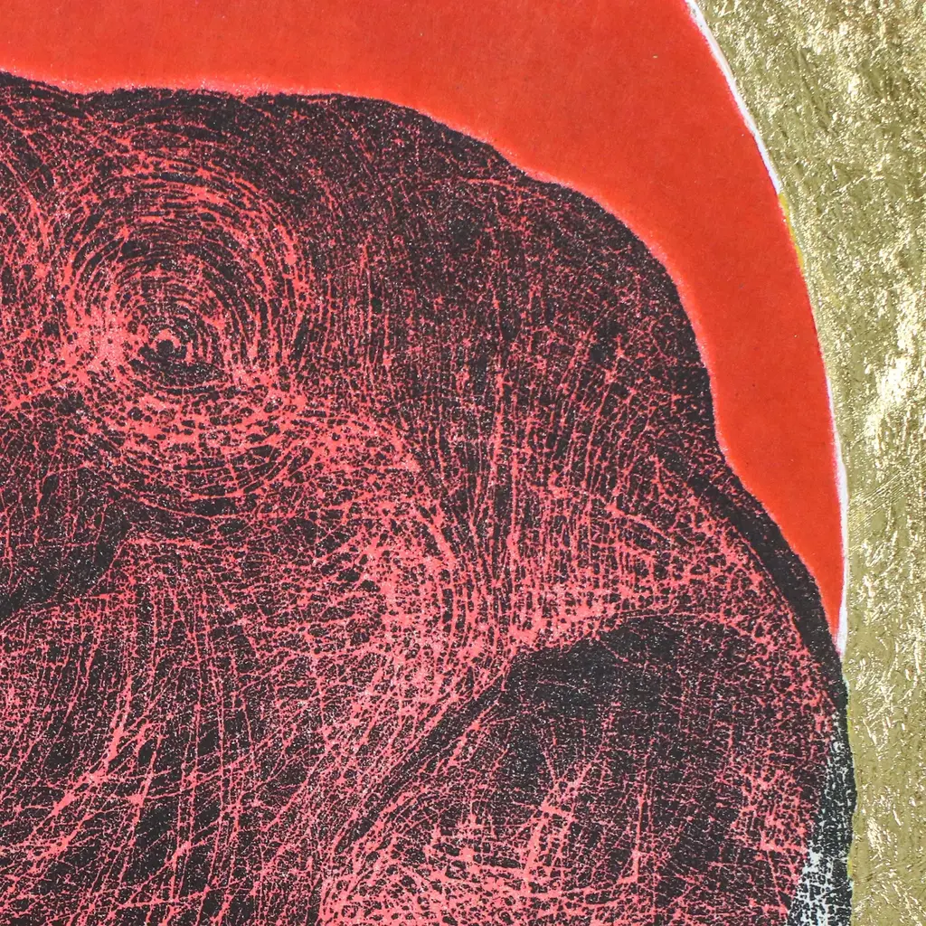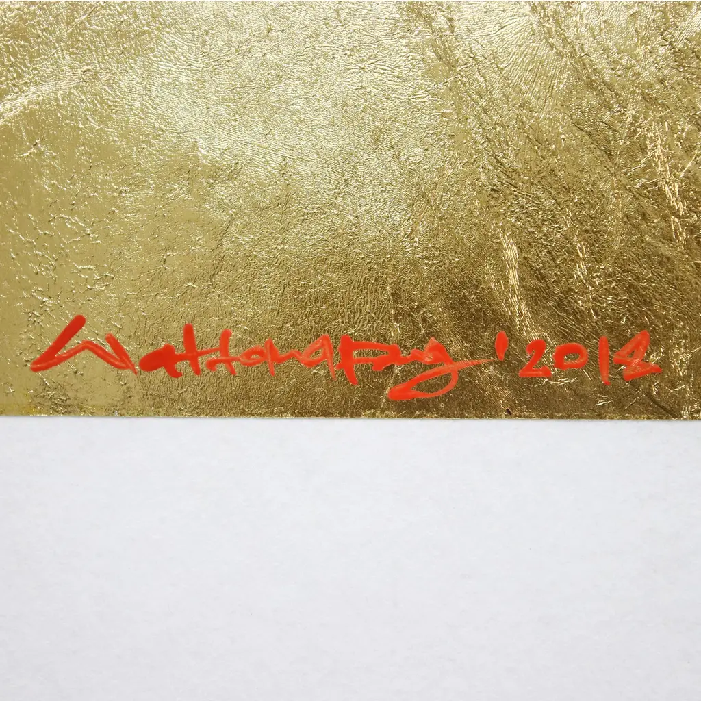 This painting is part of Thai artisan Det's concept "Elephant beauty from my mind." Against a stark red sun in a horizontal composition, an elephant in black and white with realistic details raises its trunk towards the sky. Det reflects on how the sun strikes happiness in humans and elephants alike, surrounding the red sun with gleaming gold foil.