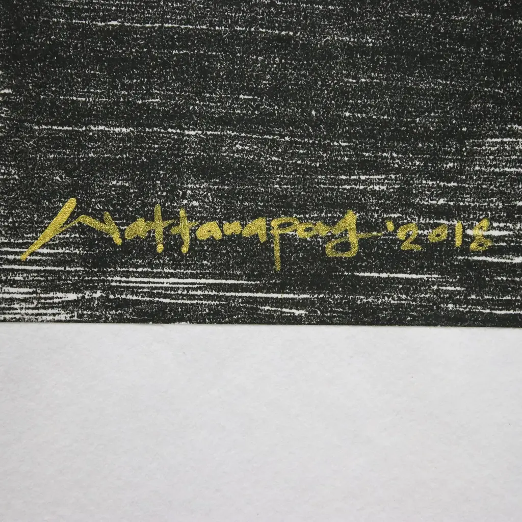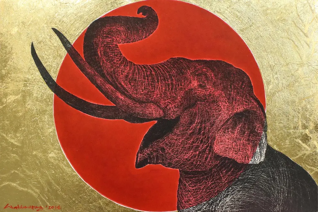 Inspired by the romantic air of the full moon, Thai artist Det paints this lovely composition. In black and white, an elephant is captured in a realist style, opening its mount wide and lifting its trunk towards the sky against the Thai landscape. The full moon is captured in gleaming gold foil.