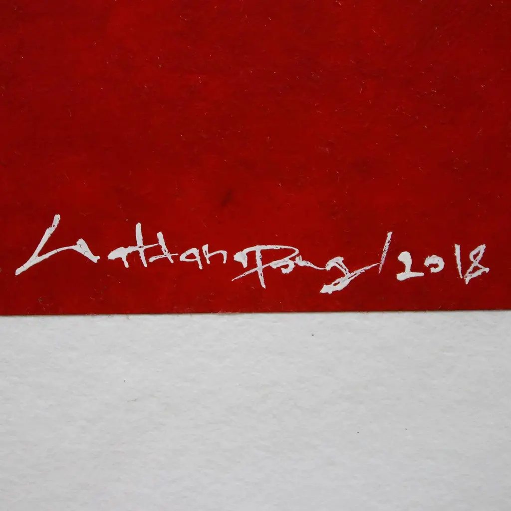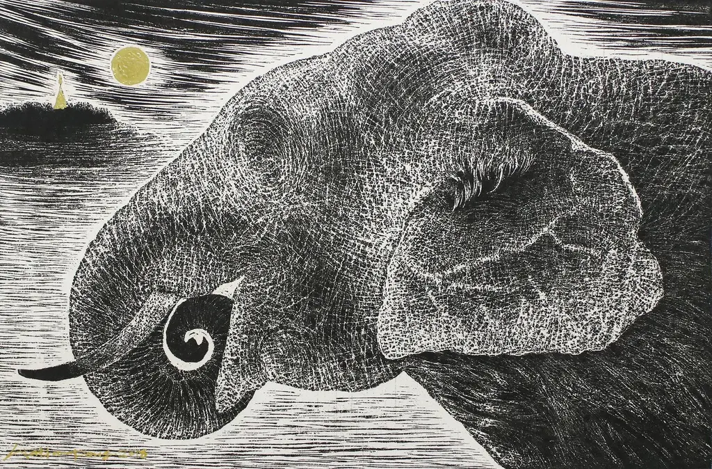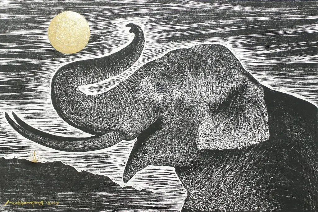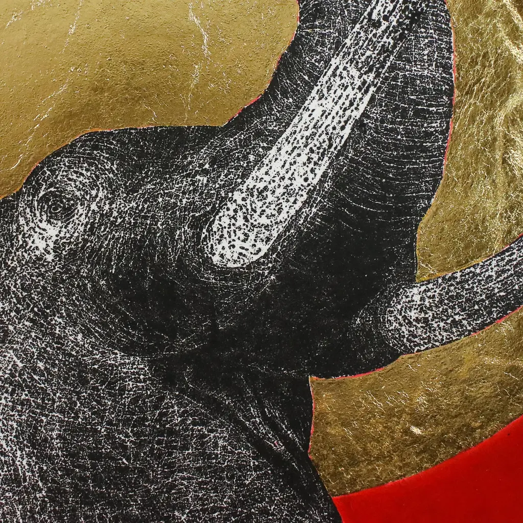For this painting, Thai artist Det reflects on elephants' unique way of showing happiness. Instead of smiling as people do, they open their mouths wide and sing with their voice. Det paints the realistic image of an elephant in black and white, silhouetted against a gleaming sun in gold foil. A stark red background completes this striking vertical composition.