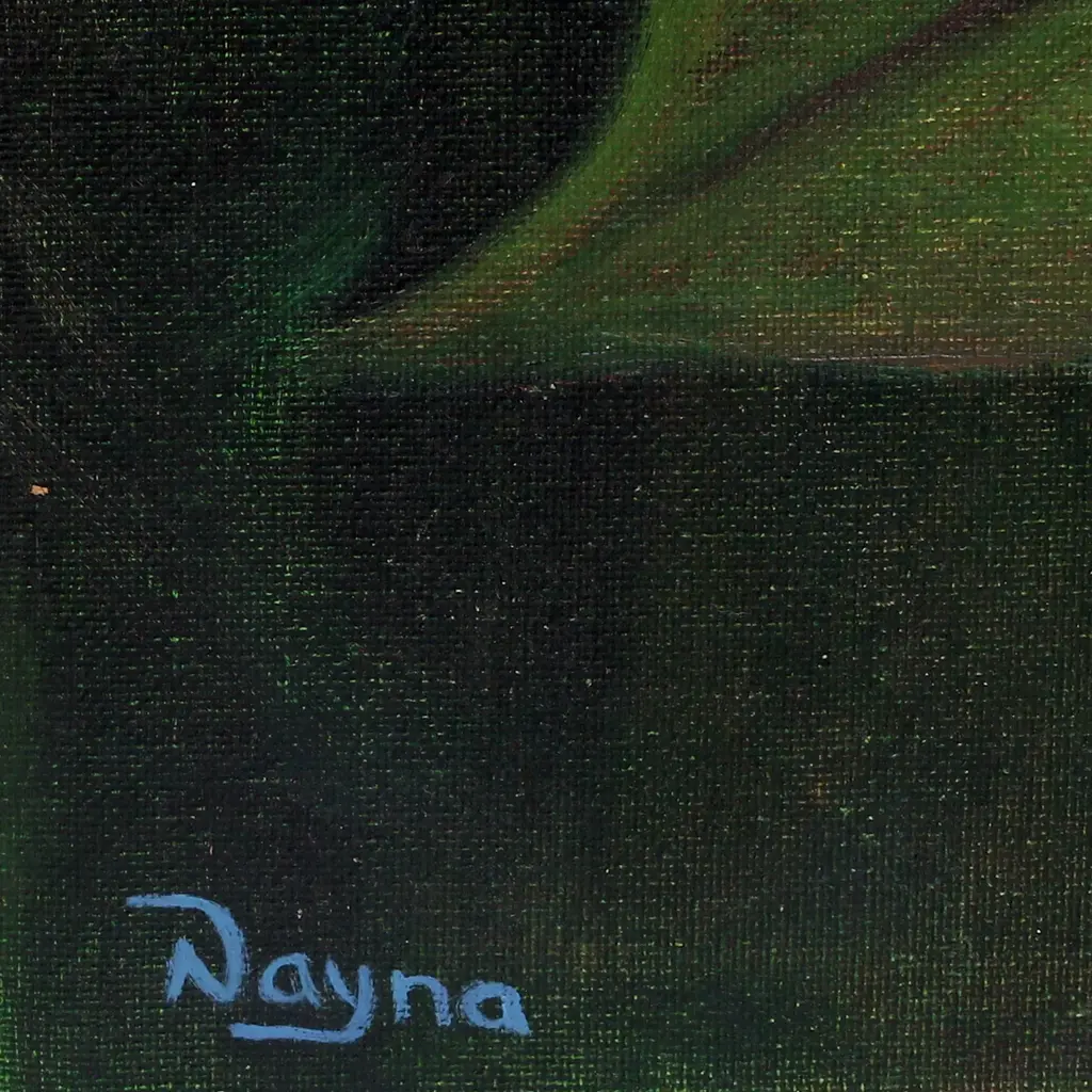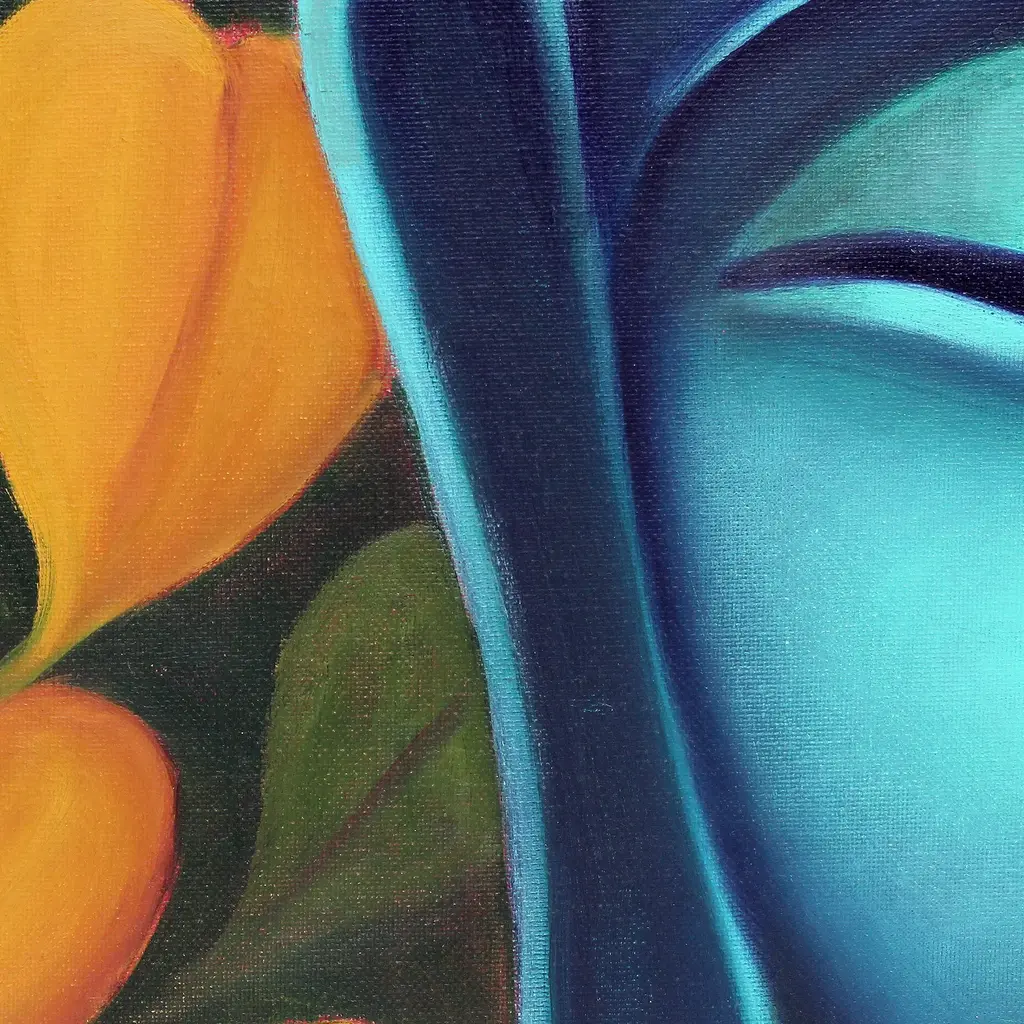 In this striking painting, the face of Buddha rests on the right of the canvas in tones of blue, with falling Autumn leaves in the background for a fantastic and spiritual composition. India's Nayna Tuli paints this piece, inspired by the concept of Moksha, or release from the cycle of life and death according to Hindu traditions.