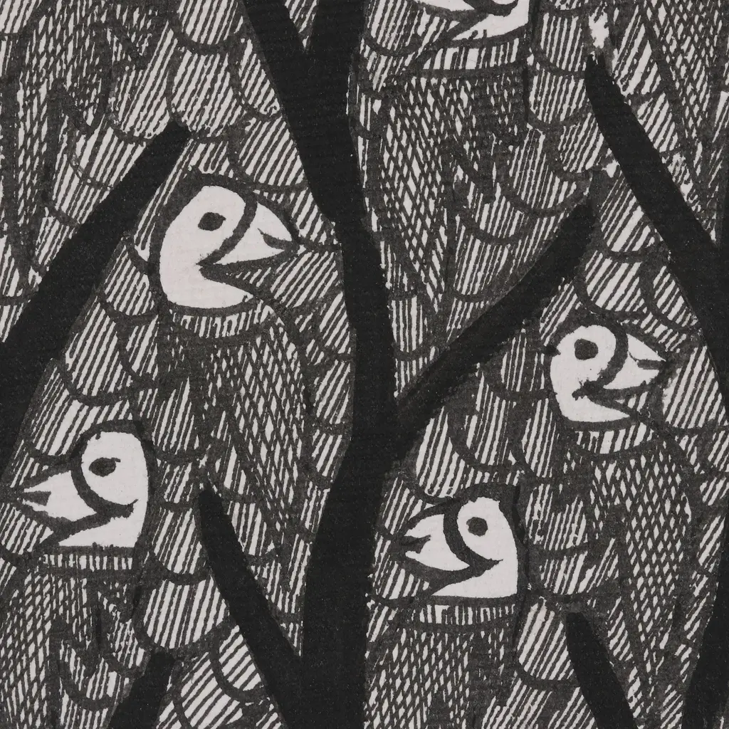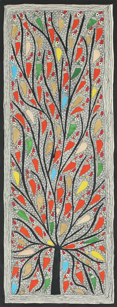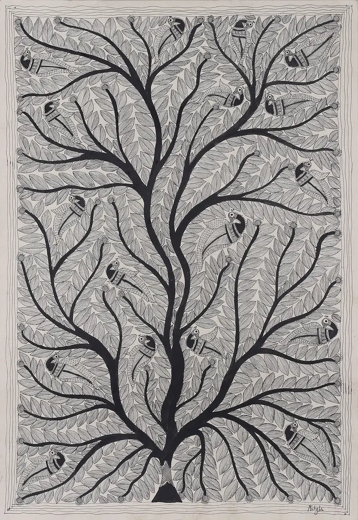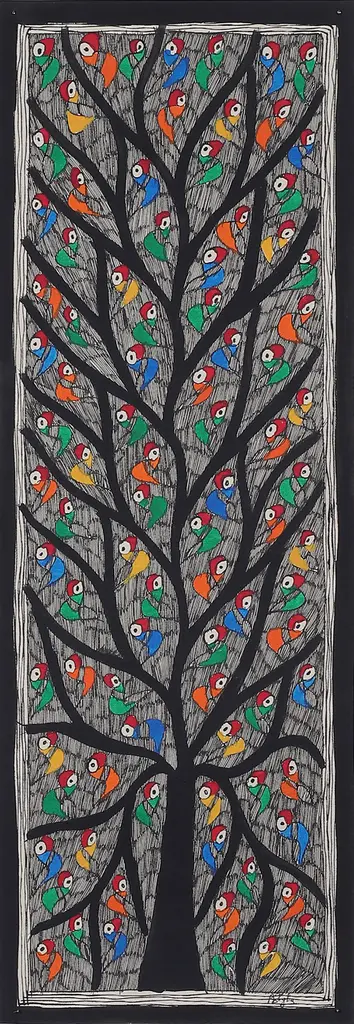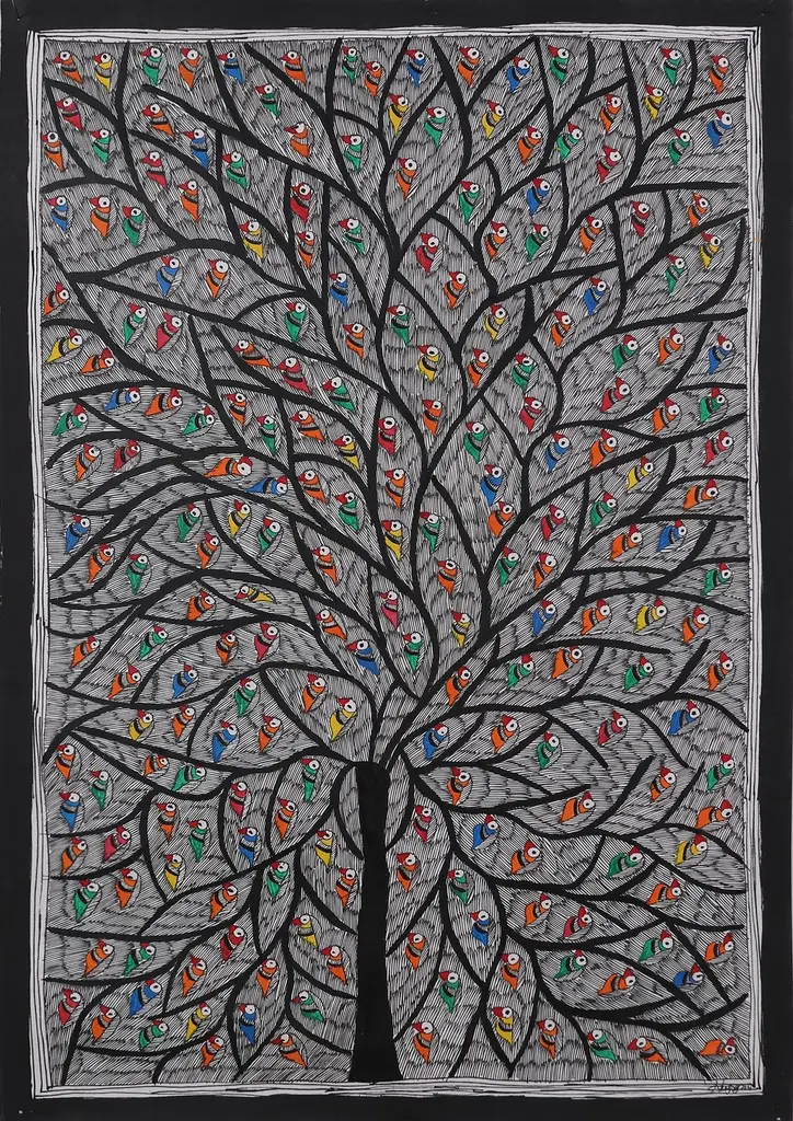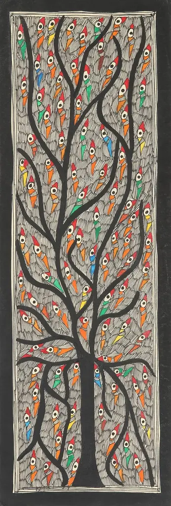India's Devendra Kumar Jha and Family craft a stunning composition in a palette of dark tones. This Madhubani painting features a tree surrounded by a myriad of parrots. Each detail is meticulously painted with vegetable dyes on handmade paper, making a unique piece of art.