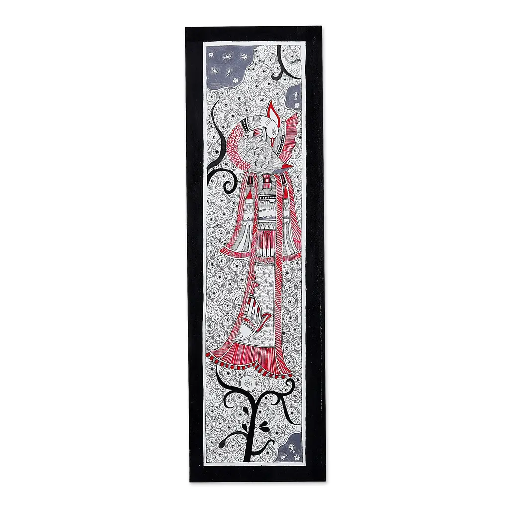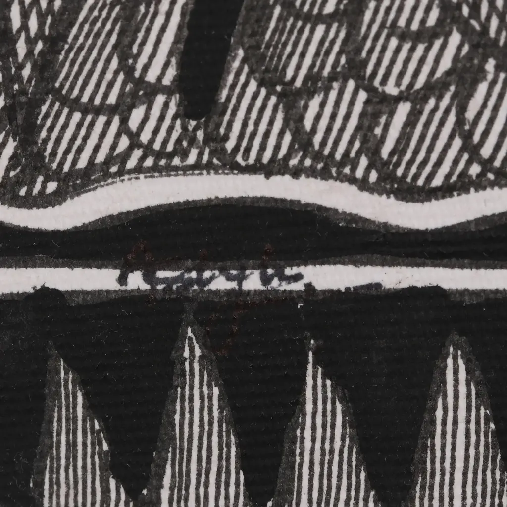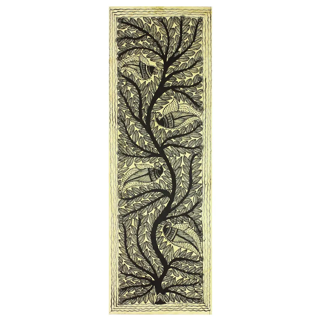 India's Devendra Kumar Jha and Family craft a stunning composition in a palette of dark tones. This Madhubani painting features a tree surrounded by a myriad of parrots. Each detail is meticulously painted with vegetable dyes on handmade paper, making a unique piece of art.