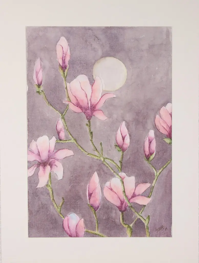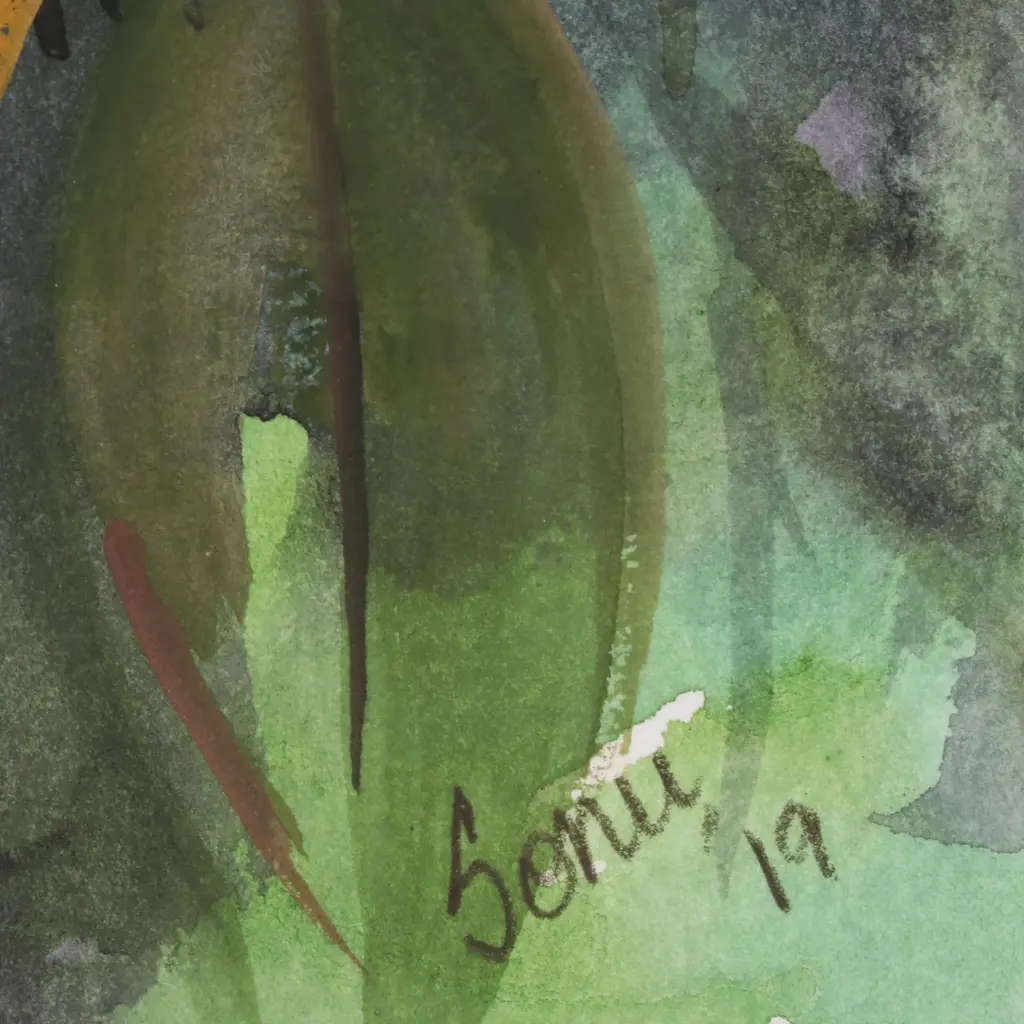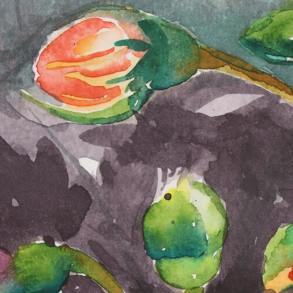 Surrounded by young buds, a majestic rose blossom spreads its yellow-orange petals. Indian artist Sonu Chopra uses watercolors to paint this realist composition, which captures the flowers in extreme close-up. This painting arrives in a mat board passe-partout.