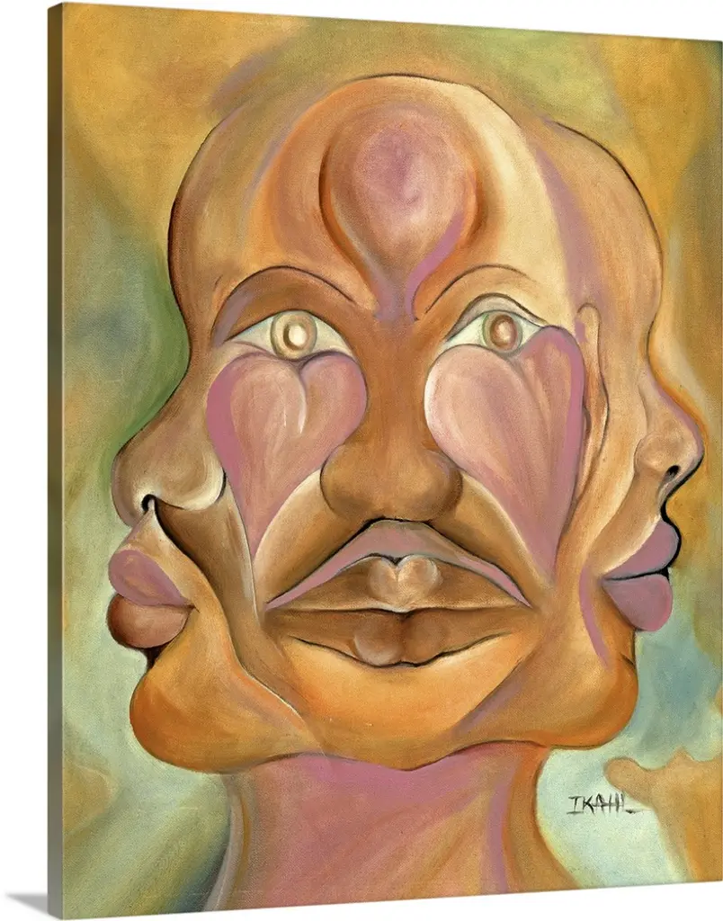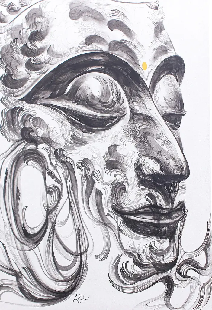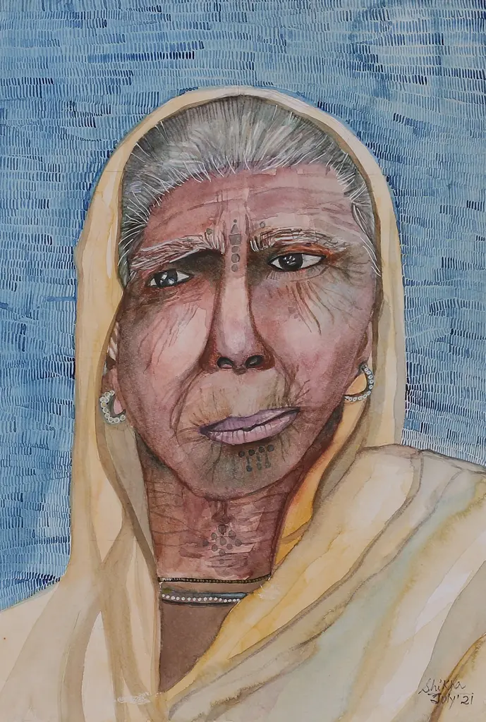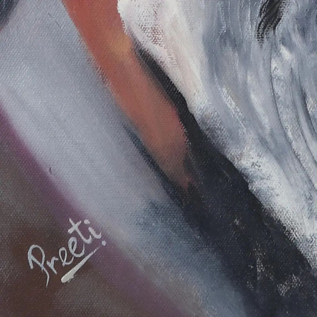 Gazing off to the side, a Hindu sadhu is the subject of this painting from India. Preeti Gupta paints this reverent composition, capturing her subject's bearded, painted face in profile. In Hindu cultures, a sadhu is a person who has renounced a worldly life.
