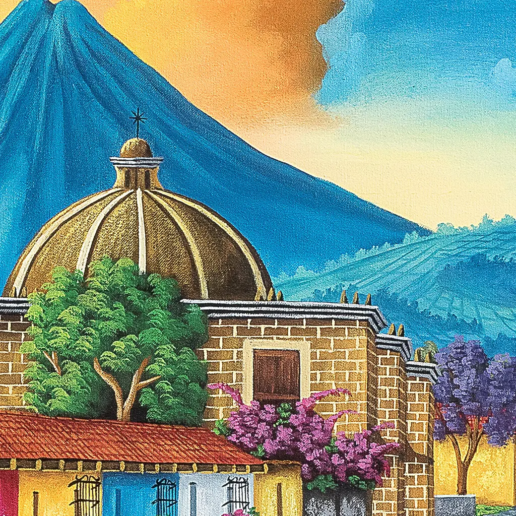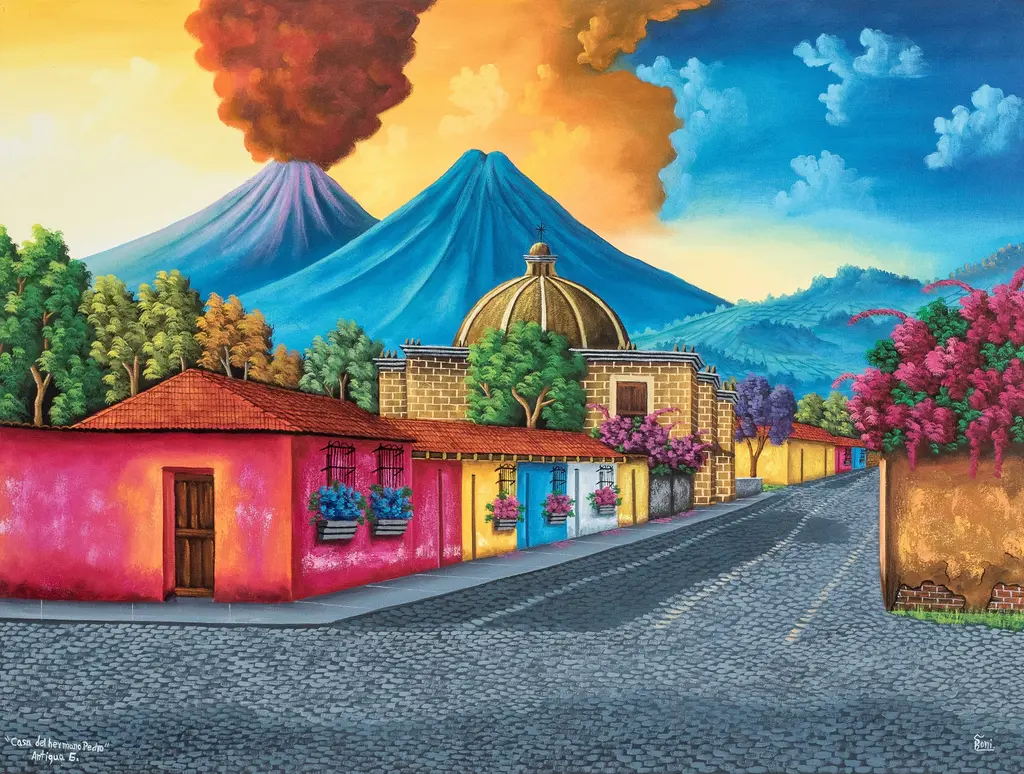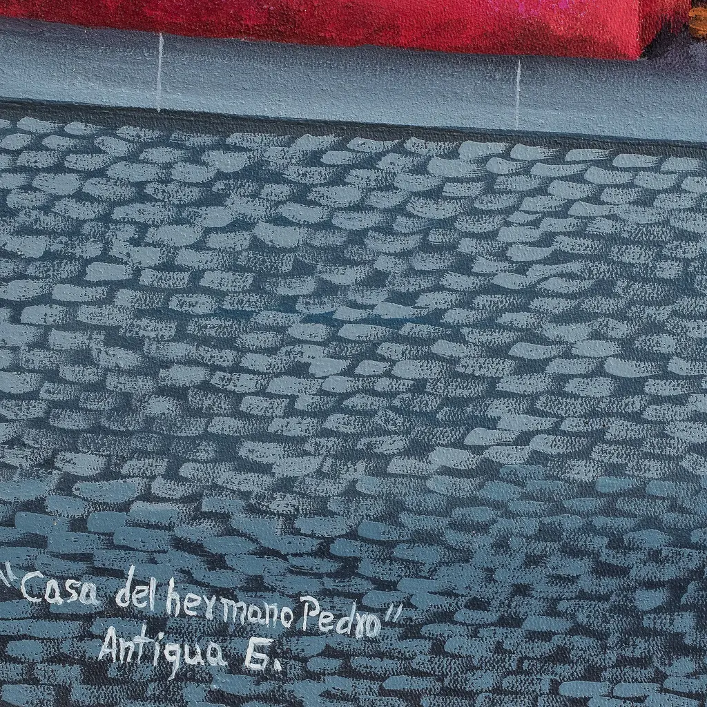 A colorful palette brings the charming streets of Guatemala to life, honoring the country's cultural wealth. Artist Boni paints every detail with oil, depicting a volcano in the distance and the traditional house of Hermano Pedro, a famous religious figure proclaimed the first saint of the region.Titled Casa del Hermano Pedro, this painting comes stretched and signed.