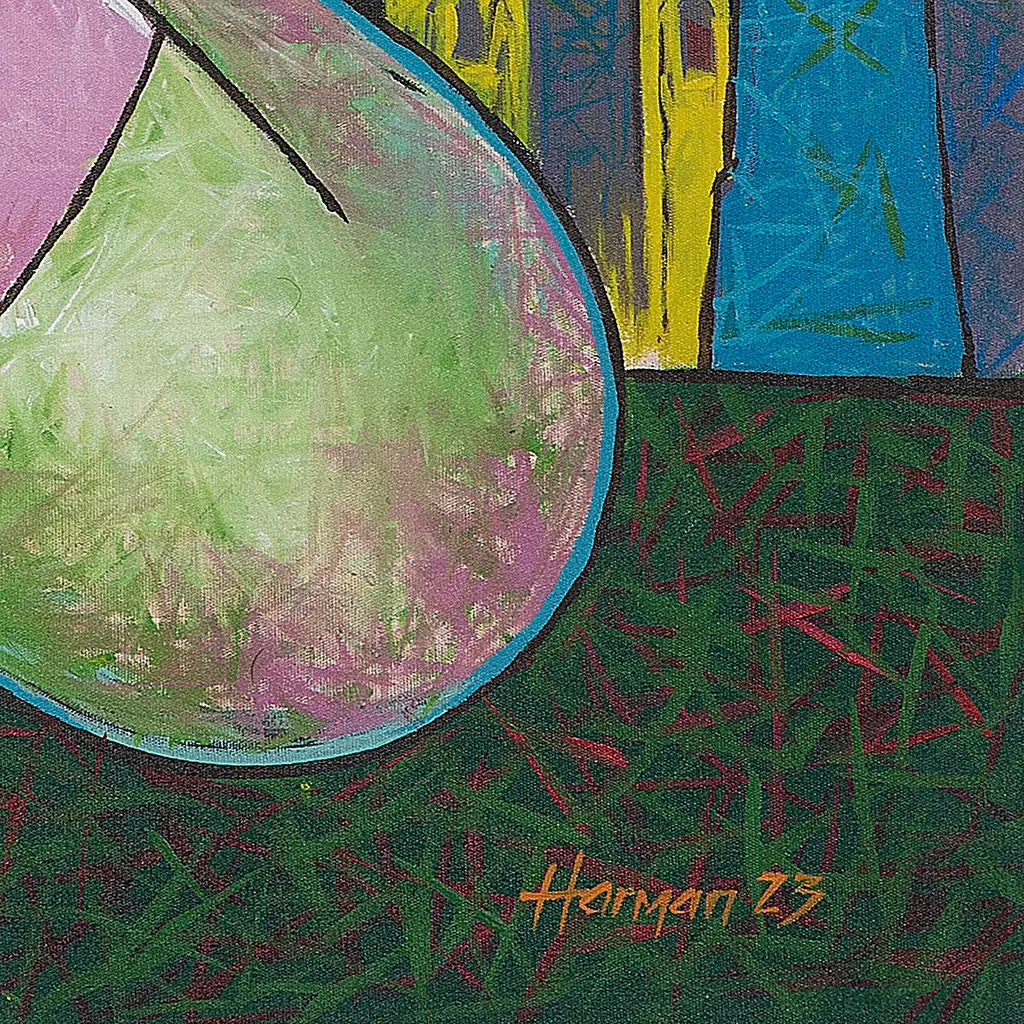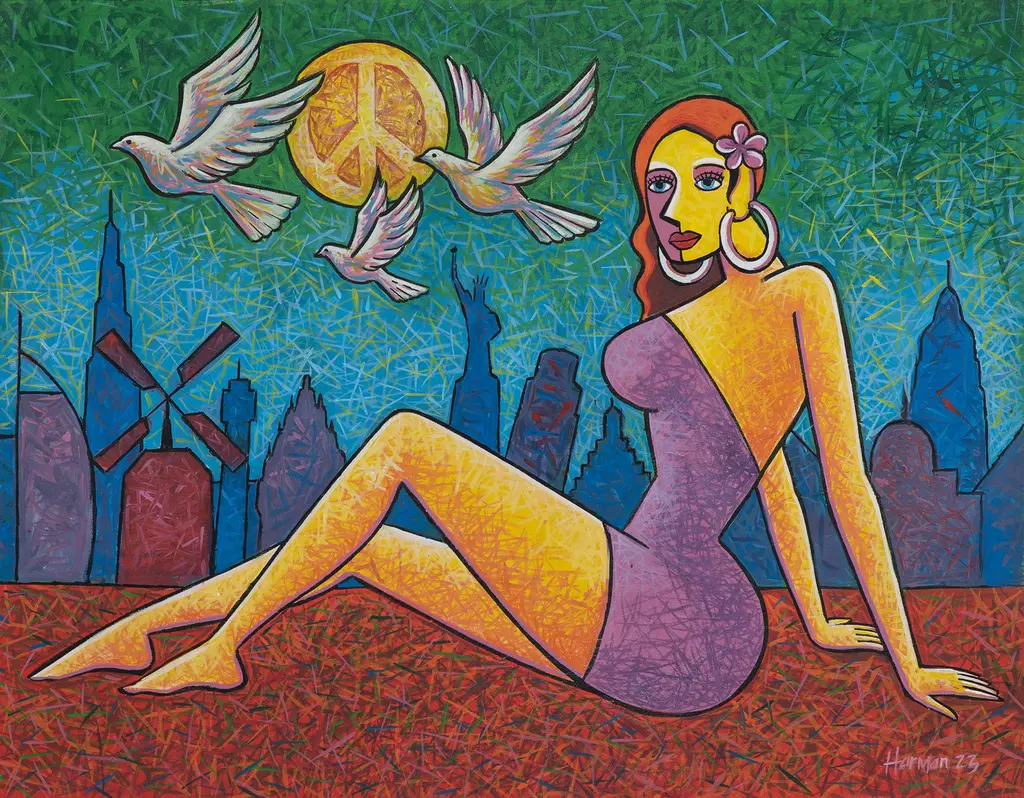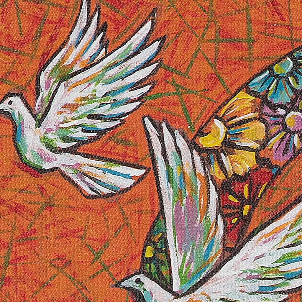 "Life is not seeking victory and fighting to kill each other, but playing beautiful and peaceful melodies to create a flowery world," says Harman while finishing a stunning expressionist composition that calls for peace and love. The Balinese artisan uses sharp brushstrokes and acrylic to depict a woman looking at the doves that fly around a floral peace symbol. Aimed to create an inspirational ambiance, this painting comes unstretched and signed.