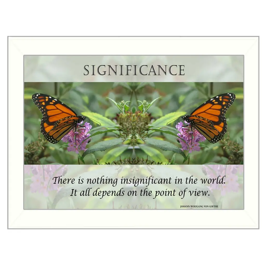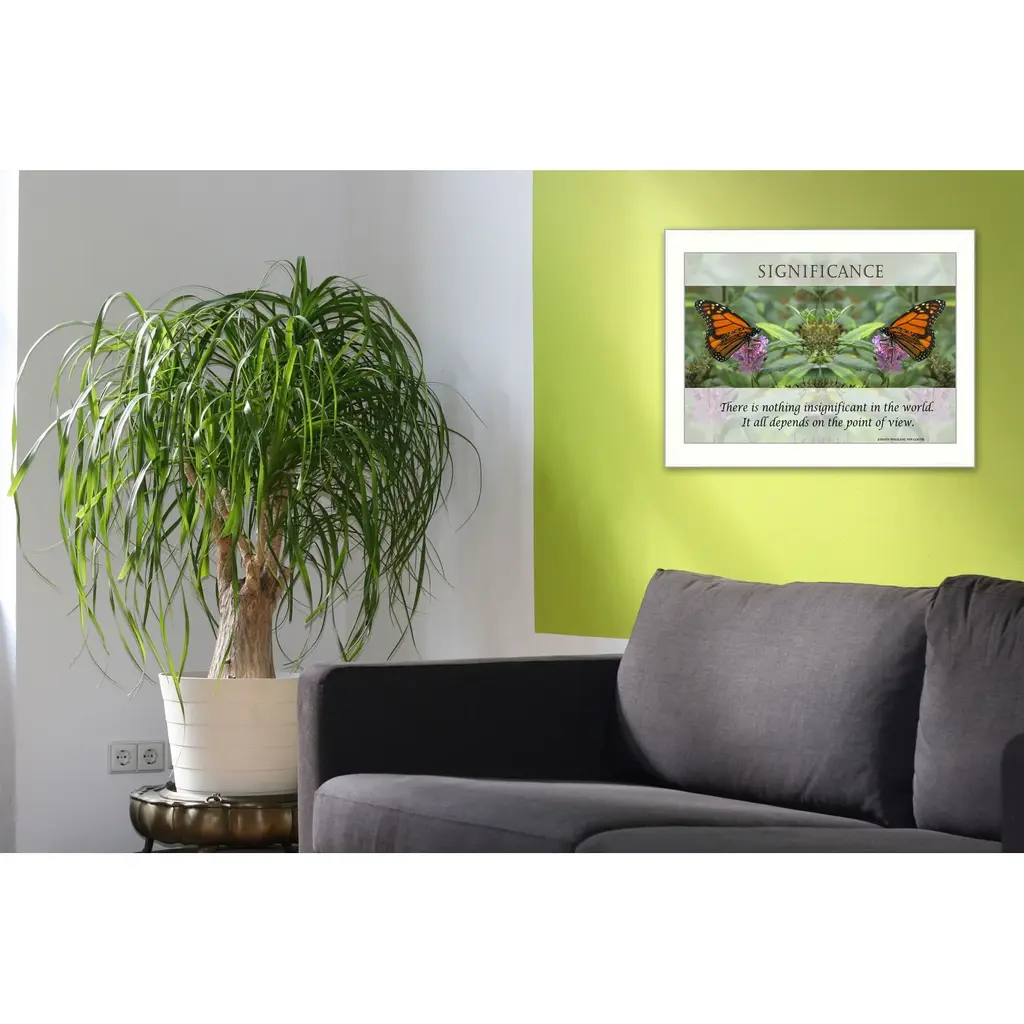 This significance 2 white framed print living room wall art will add a beautiful decorative accent to your decor. This butterfly inspired art will be a great addition to your space. This print is a visual artistic expression that allows you to decorate your space in style. Reproduced for you on paper, this hanging decorative accent will be a trendy and fashionable way to dress your walls. Adding this hanging wall art to your space to make your room feel more finished and attractive. Utilize this opportunity to create a focal point in the room with this fabulous wall decor option. 10" H x 14" W x 1" D