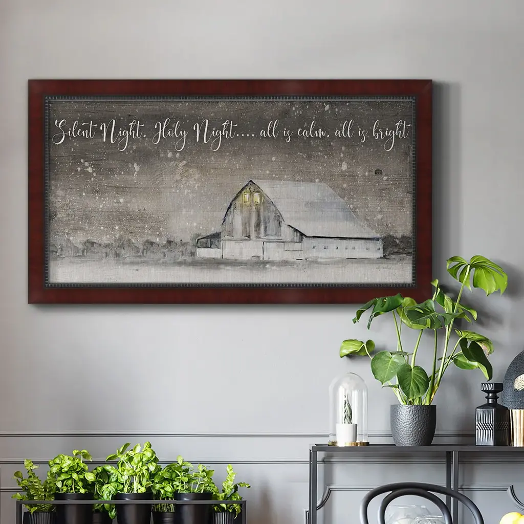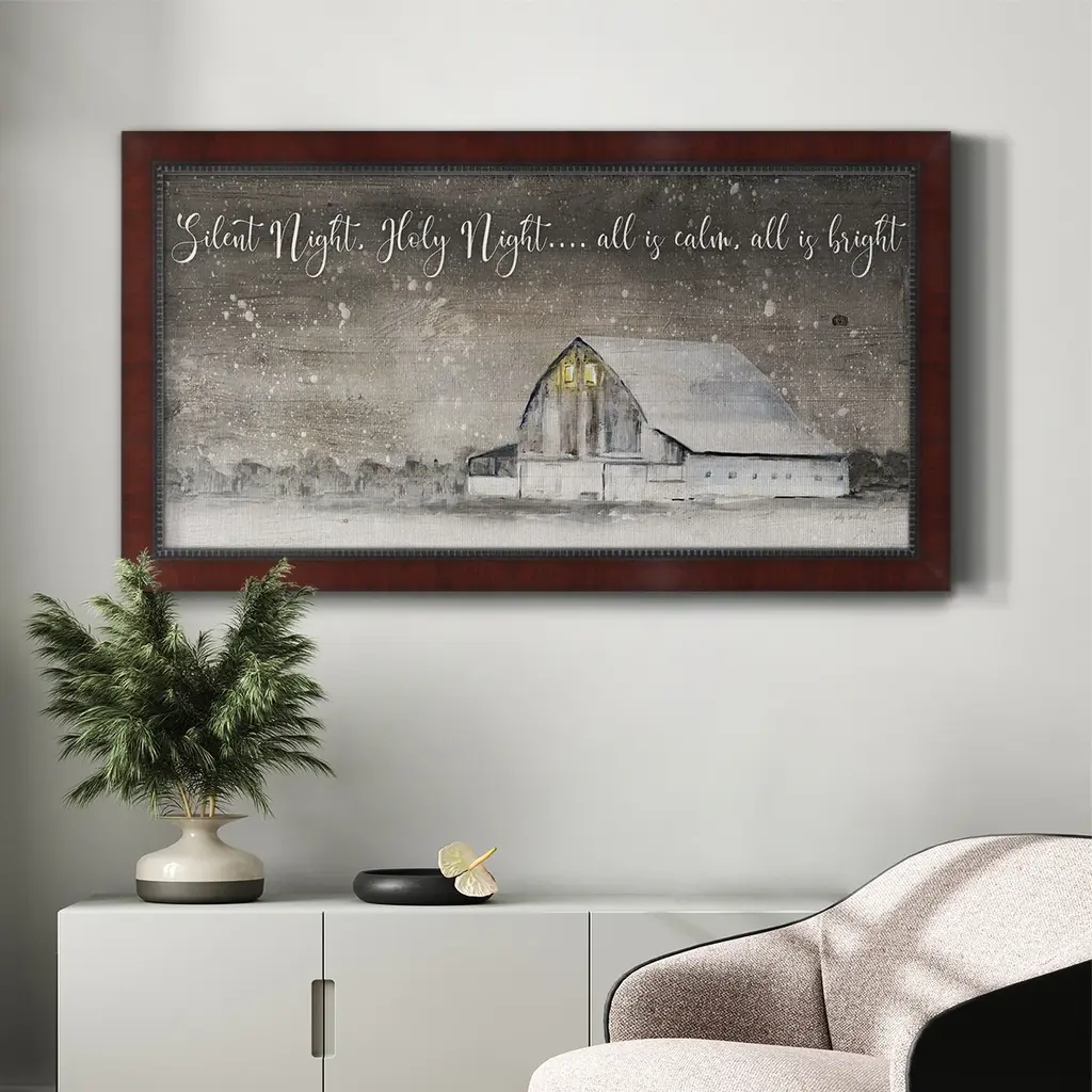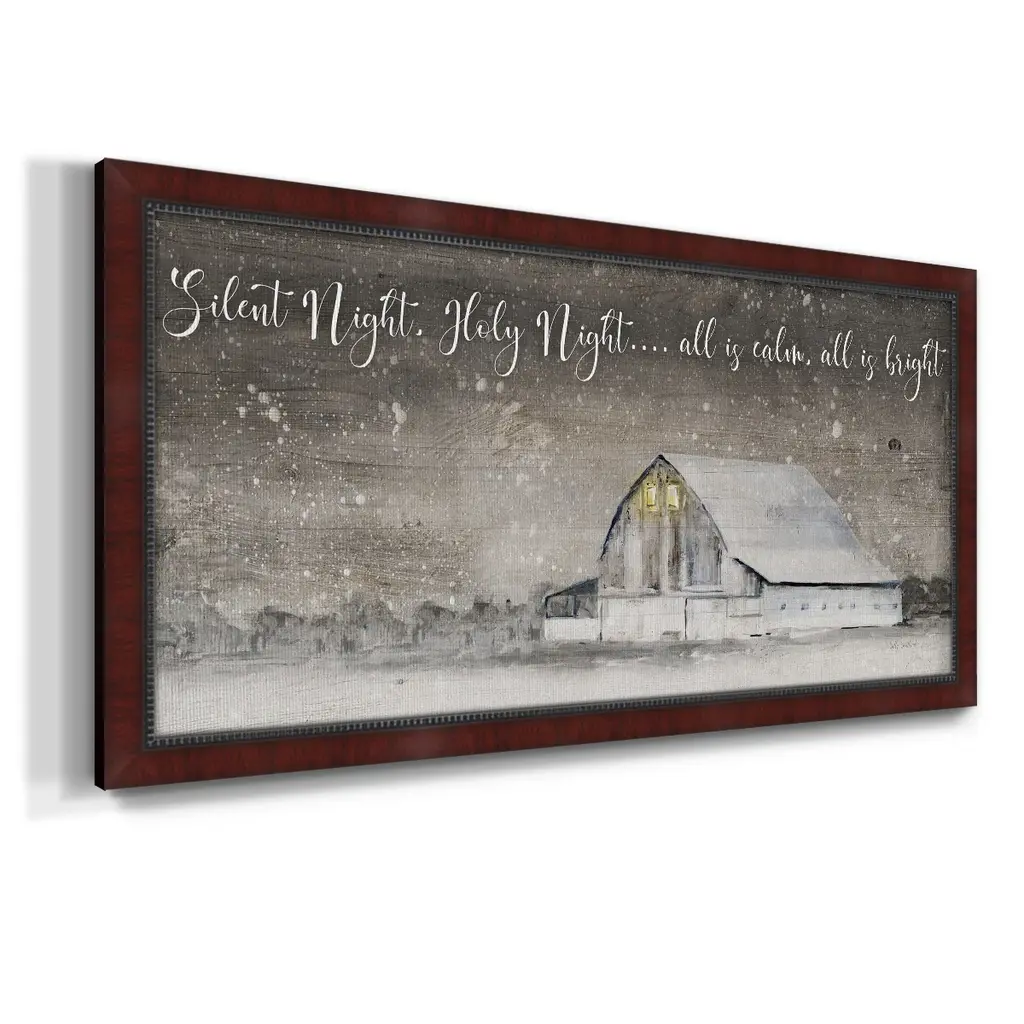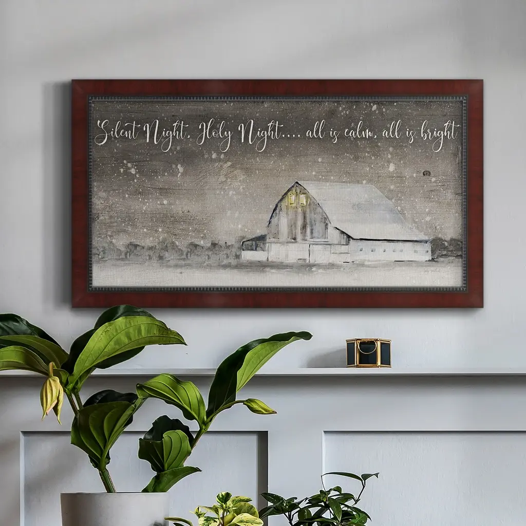 Silent Night Premium Framed Canvas- Ready to Hang A Premium Framed Canvas created to last. Framed in distressed wood and available in an array of sizes and colors Featuring a beveled a solid wood stretcher bar, each piece comes ready to hand 3 SIZES AVAILABLE 21''X37'' - Overall Size 25''X45'' - Overall Size 29''x53'' - Overall Size Each piece is made to order. Each piece comes with hanging hardware. Made in the USA Ready to Hang Giclee Paper Print Acrylic Glass Beveled Matt Board