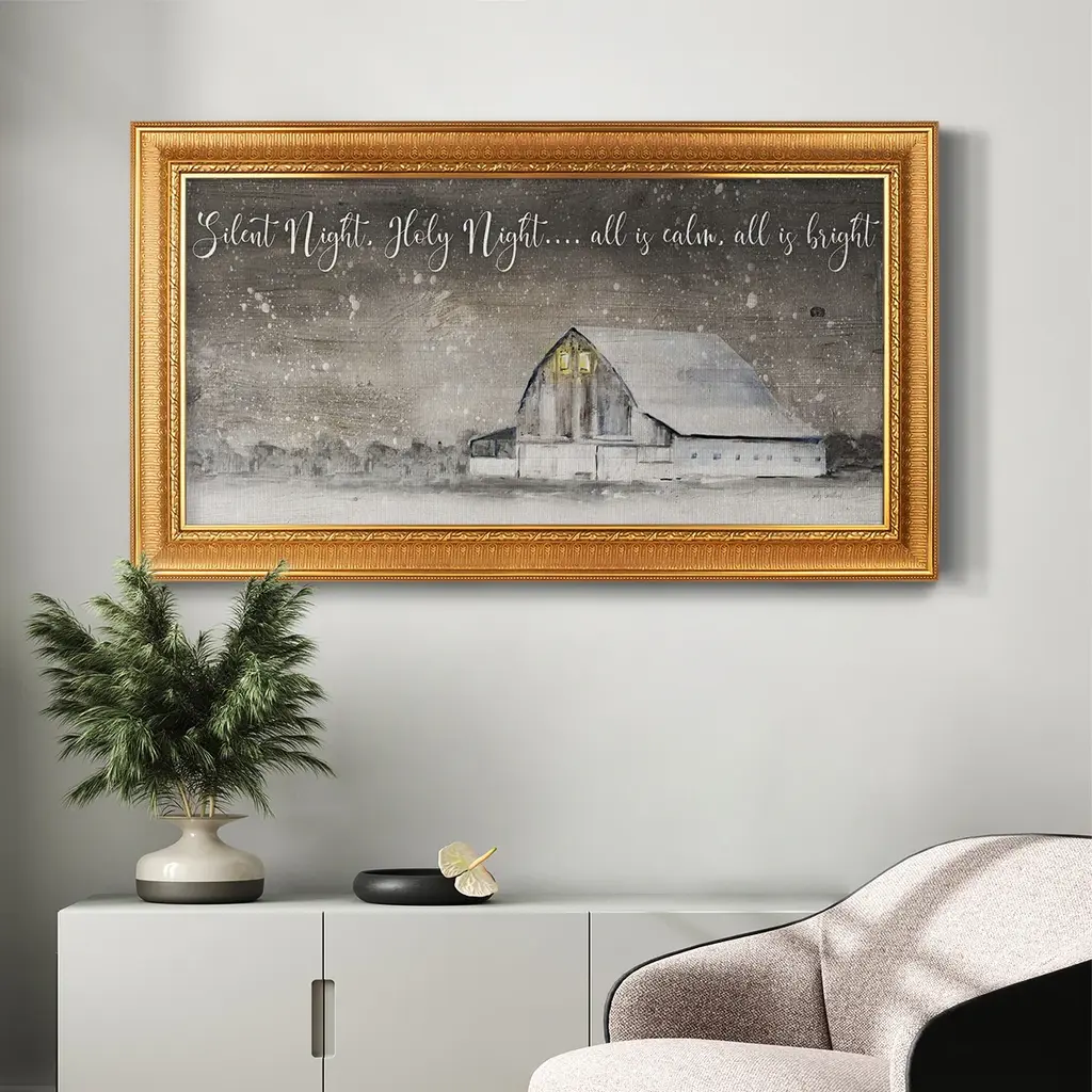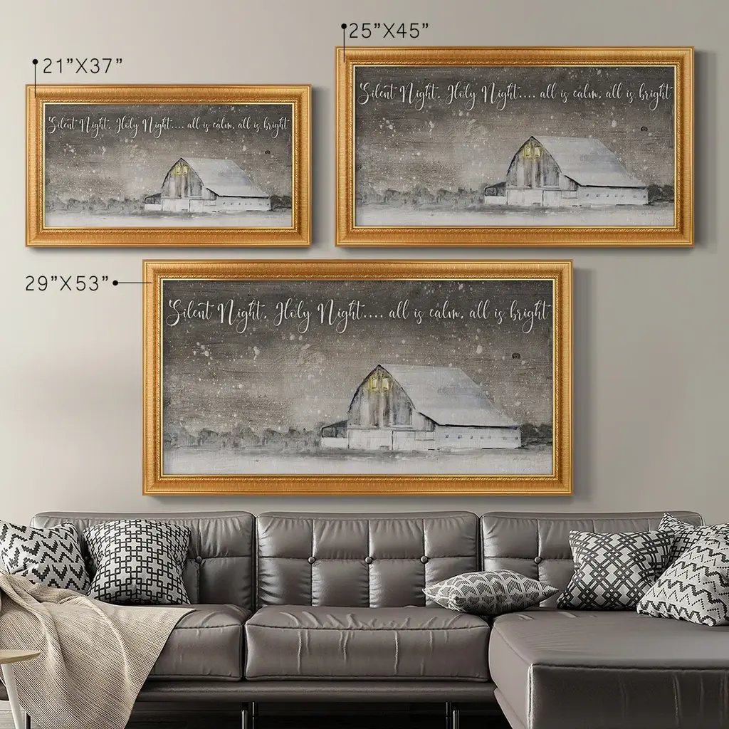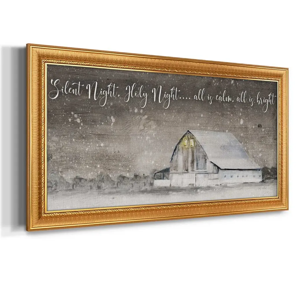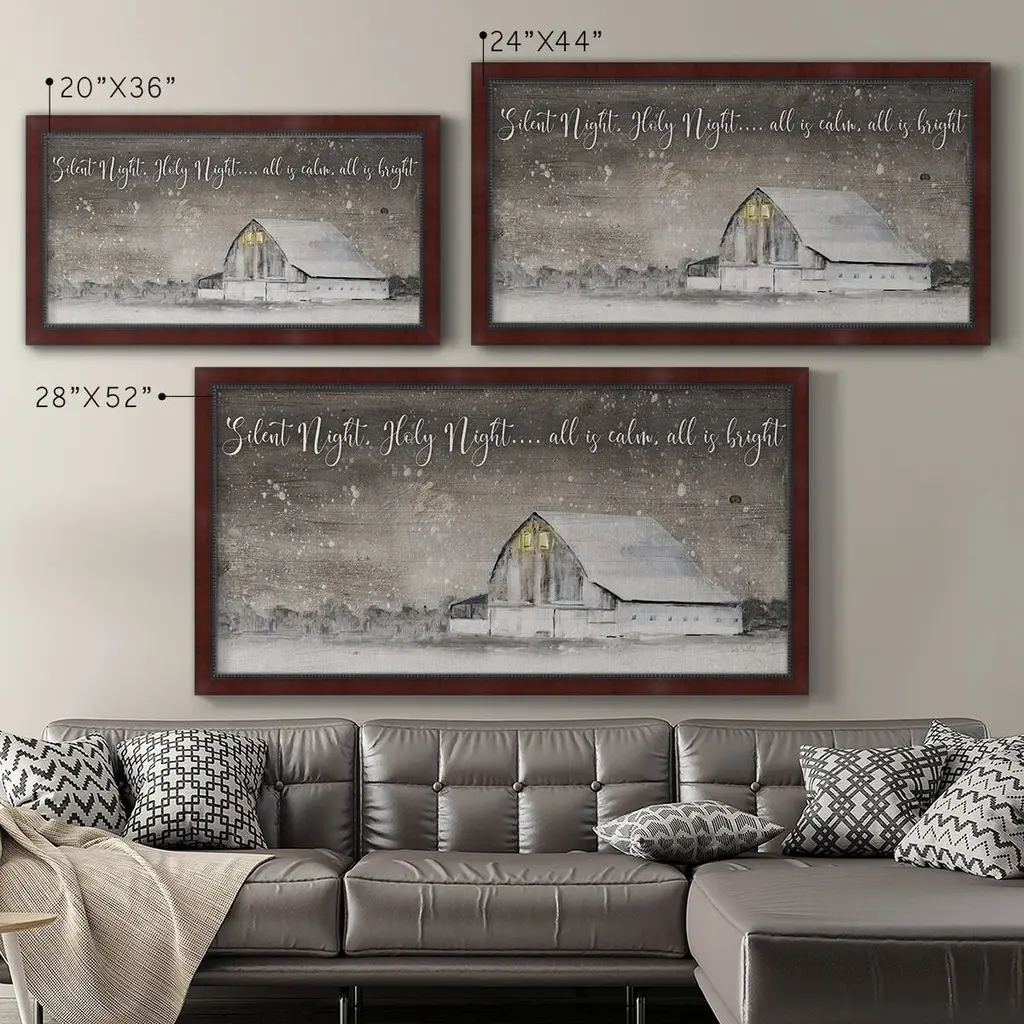 Silent Night Premium Framed Canvas- Ready to Hang A Premium Framed Canvas created to last. Framed in distressed wood and available in an array of sizes and colors Featuring a beveled a solid wood stretcher bar, each piece comes ready to hand 3 SIZES AVAILABLE 21''X37'' - Overall Size 25''X45'' - Overall Size 29''x53'' - Overall Size Each piece is made to order. Each piece comes with hanging hardware. Made in the USA Ready to Hang Giclee Paper Print Acrylic Glass Beveled Matt Board