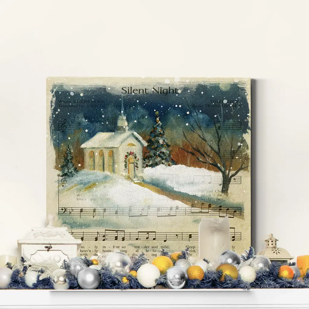 Silent Night-Premium Gallery Wrapped Canvas - Ready to Hang A premium hand stretched gallery wrapped canvas print created to last. Featuring a beveled a solid wood stretcher bar, each piece comes ready to hand 5 SIZES AVAILABLE 10''X10'' - Overall Size 16''x16'' - Overall Size 24''x24'' - Overall Size 32''x32'' - Overall Size 40''x40'' - Overall Size Each piece is made to order. Built to Last Each piece comes ready to hang Solid wood stretcher Fade and Water resistant Made domestically