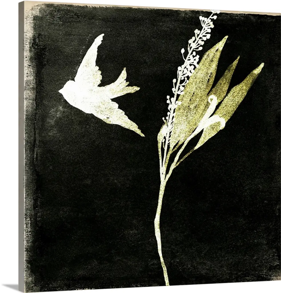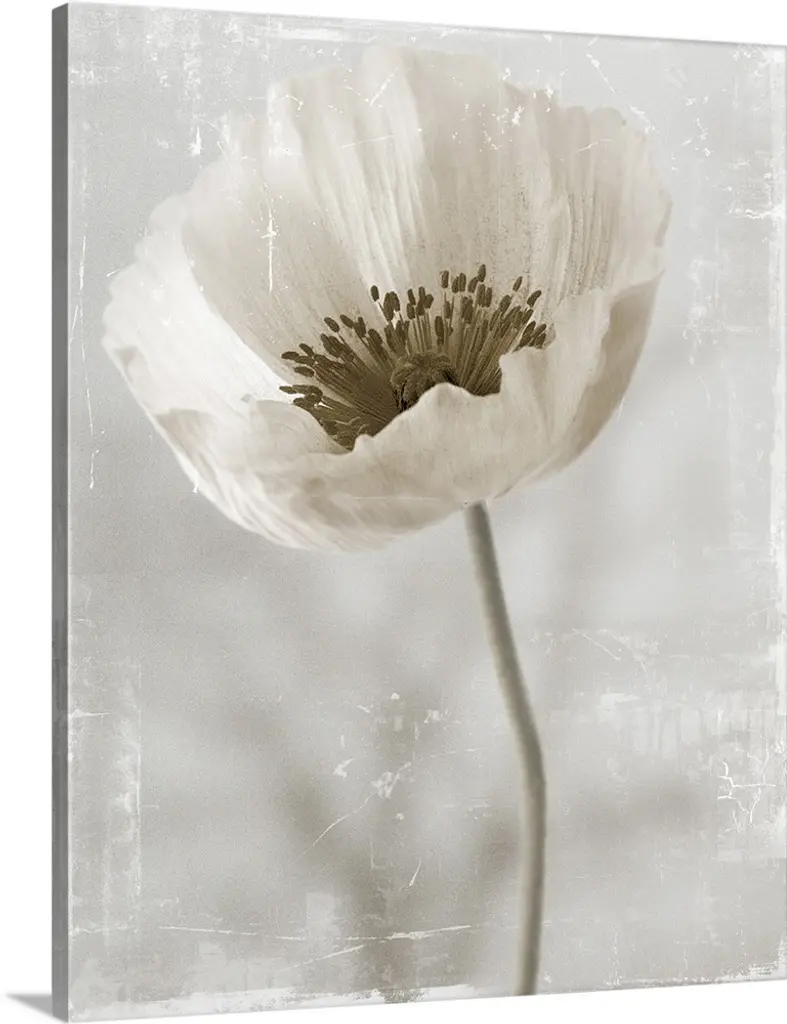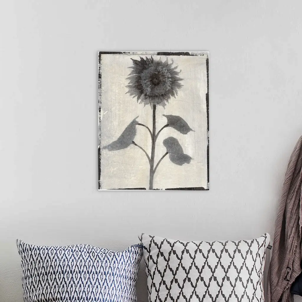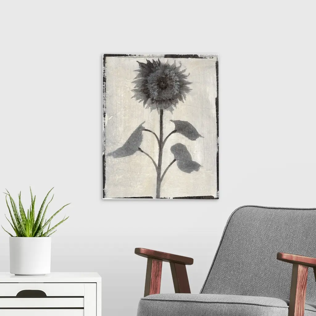 Vertical contemporary painting of flowers in faded shades of grey with a rough, simple black border.