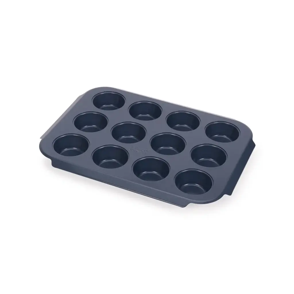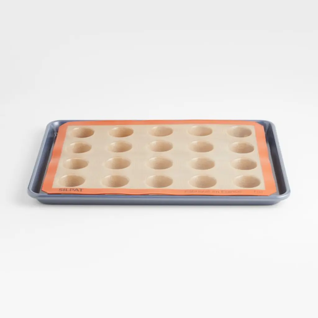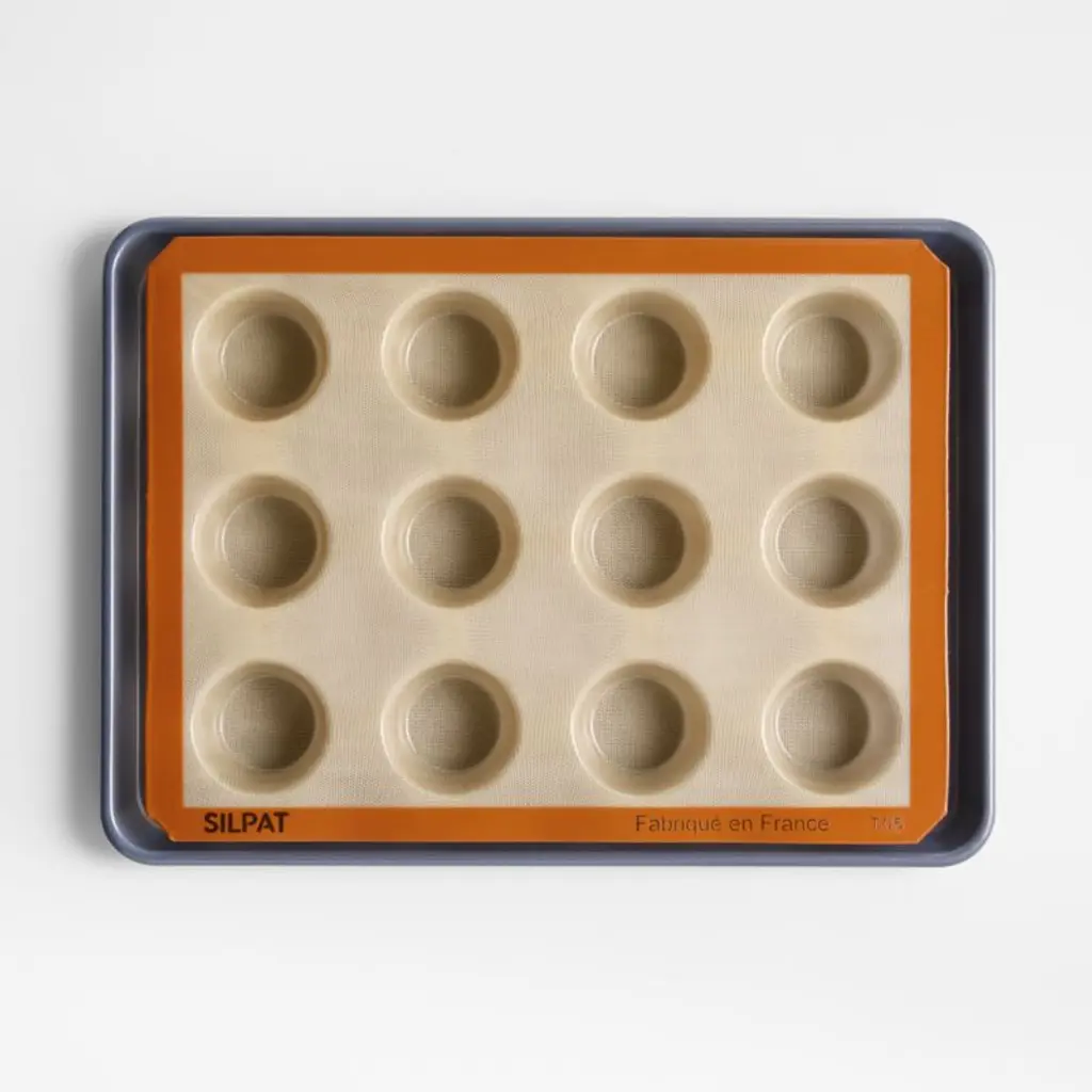 Bake muffins and cupcakes effortlessly with our exclusive set. Our cookie sheet in gorgeous slate blue is part of our bakeware collection that takes its cue from professional kitchens. Made of carbon steelan alloy of 99% iron and 1% carbon that's nearly indestructiblethe pan heats quickly and evenly for consistent baking and perfect browning. Silpat's ingenious muffin pan bakes cookies evenly and releases them easily, with no need for parchment, butter, oil or spray. Simply place the pan on a cookie sheet, fill the 12 divots with your favorite muffin batter and bake as usual. The muffins, cupcakes, mini quiches or egg cups will pop out perfectly, and the silicone muffin pan cleans up easily in the dishwasher.Direct from our design team to your kitchen, the sophisticated assortment in our signature The Kitchen by Crate line combines beautiful simplicity and peerless performance. From initial sketches to rigorous testing, every expertly designed product in this kitchen collection meets our standards, and yours.Silpat baking mats were invented by a French baker in 1965. Still made in France, the revolutionary line now includes a range of baking molds and mats.