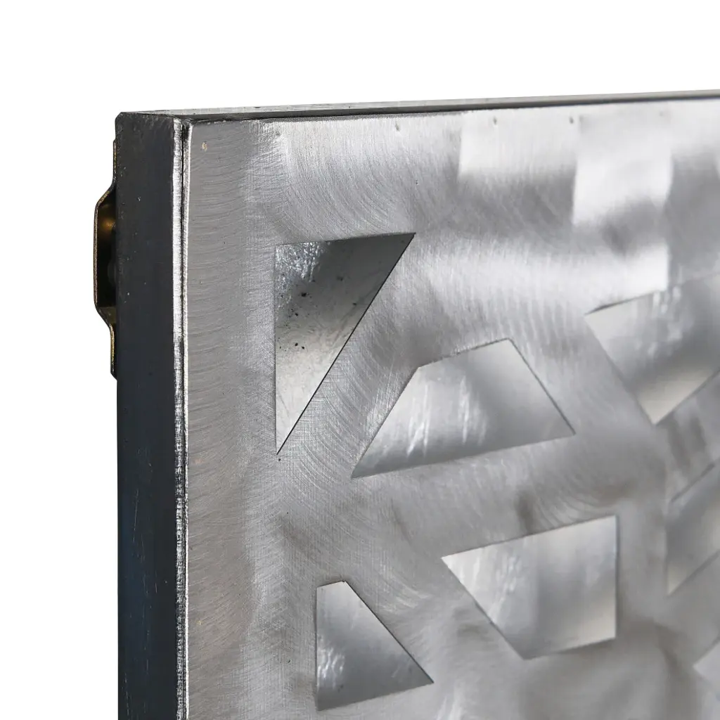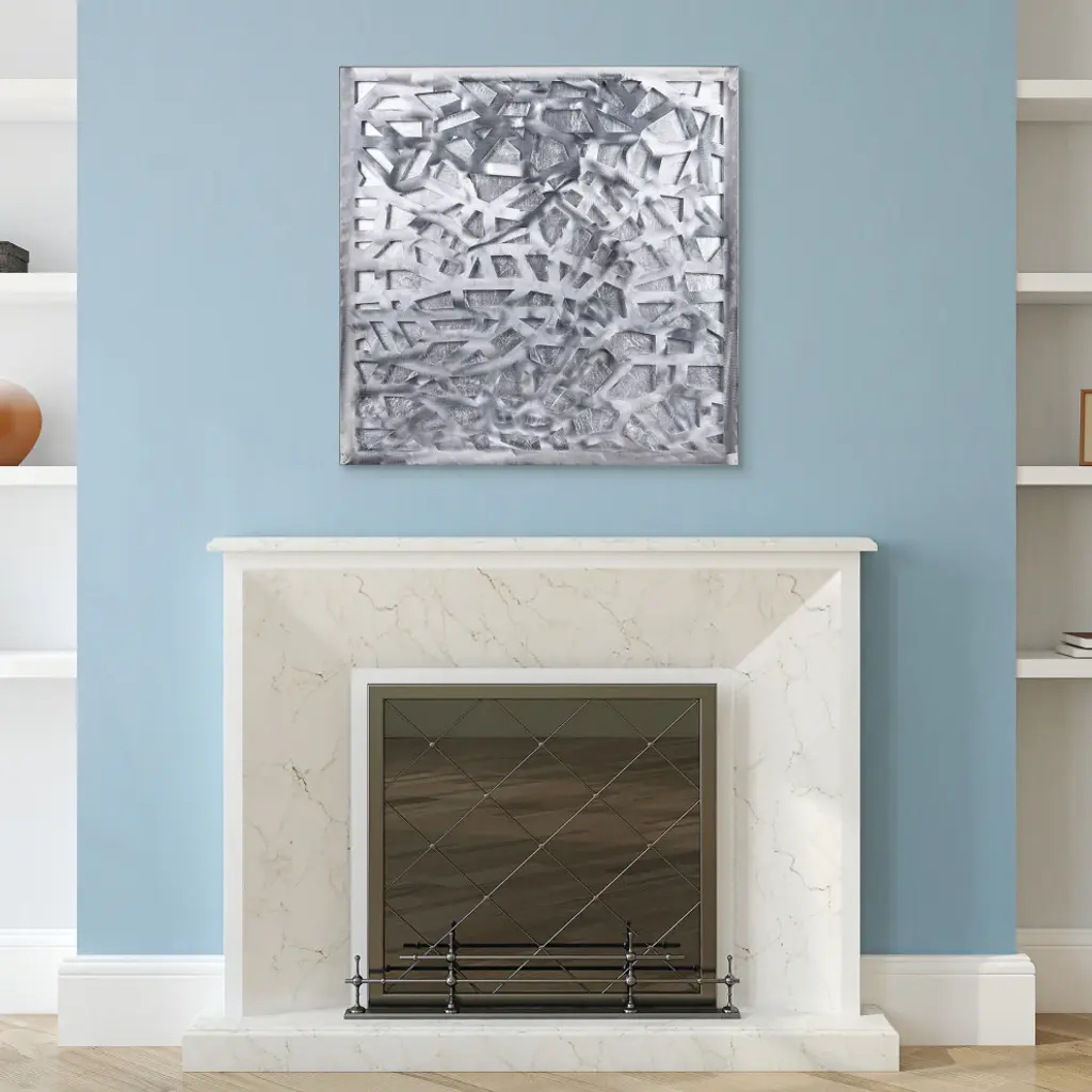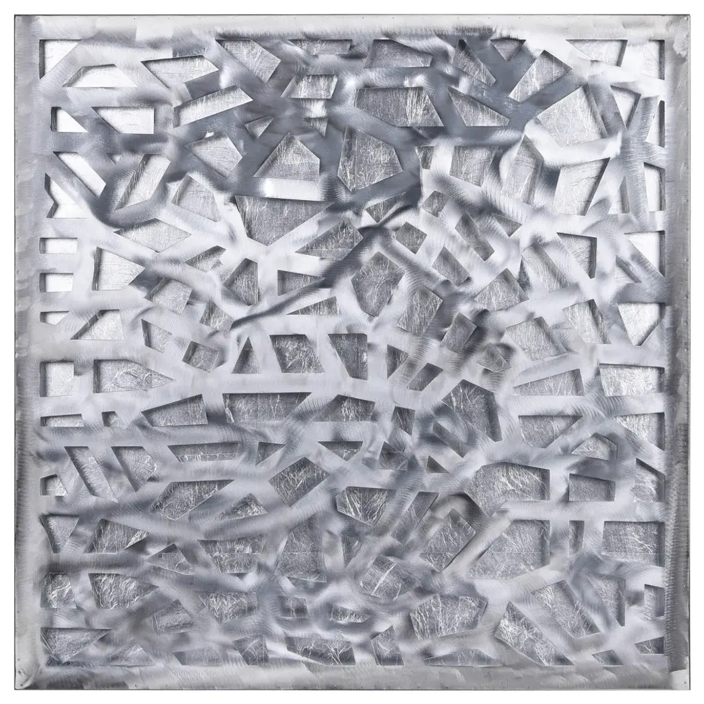 Made of brushed and polished steel, this high quality and unique piece displays an abstract pattern the viewer could get lost in. Positioned approximately 1"� behind the pattern are hand applied silver leaf squares to complement the silver polished steel of the abstract design. This piece is 32"� x 32"� making it desirable for any room wanting a unique and industrial feel. Comes with 2 pre-attached hooks on the back, ready to be mounted, providing for easy, stress free installation. Packaged well with 4 protective corners and bubble bag.