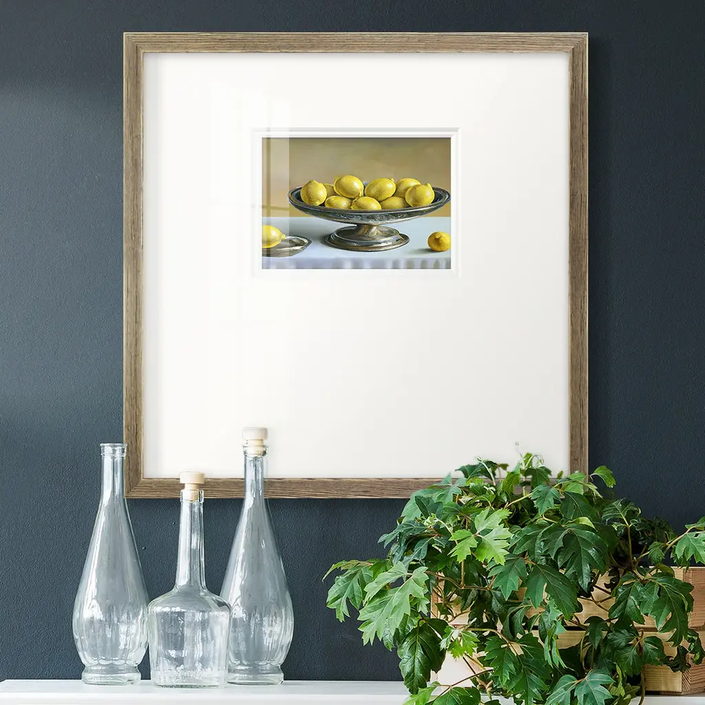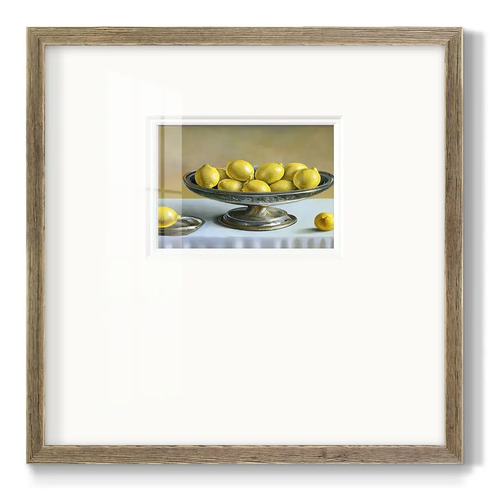 Silver LemonsPremium Framed Print A framed cold pressed paper print featuring superior double matting and quality frame. 2 SIZES AVAILABLE 16''X16''' - Overall Size 20''X20''' - Overall Size Each piece is made to order. Each piece comes with hanging hardware. Made in the USA Ready to Hang Giclee Paper Print Plexiglass Beveled Matt Board Double Matte Board