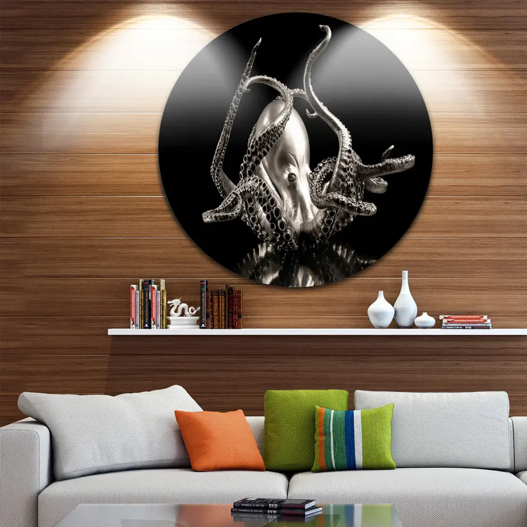 Bring Contemporary Abstraction to your home with this large Circle Metal wall art. This Silver Octopus Metal Artwork makes it the focal point of any room or office. - White Gloss Coating ensures colors are extra vibrant with light reflection.- Aluminum grade Sheet Metal with 1 inch mounting frame on the back giving the illusion that the artwork is floating on the wall..- Mounting Brackets are included along with instructions.- High Quality Digital images are created directly into a glossy aluminum panel producing a stunning and captivating print into the glossy finish of the metal.- Water, Fire and Scratch resistant HD Aluminum panels.- Looks better than any photo paper and guaranteed to last at least 20 years- Easy to clean with a microfiber cloth. Colors are far superior to regular Canvas Art. - Easy to Hang
