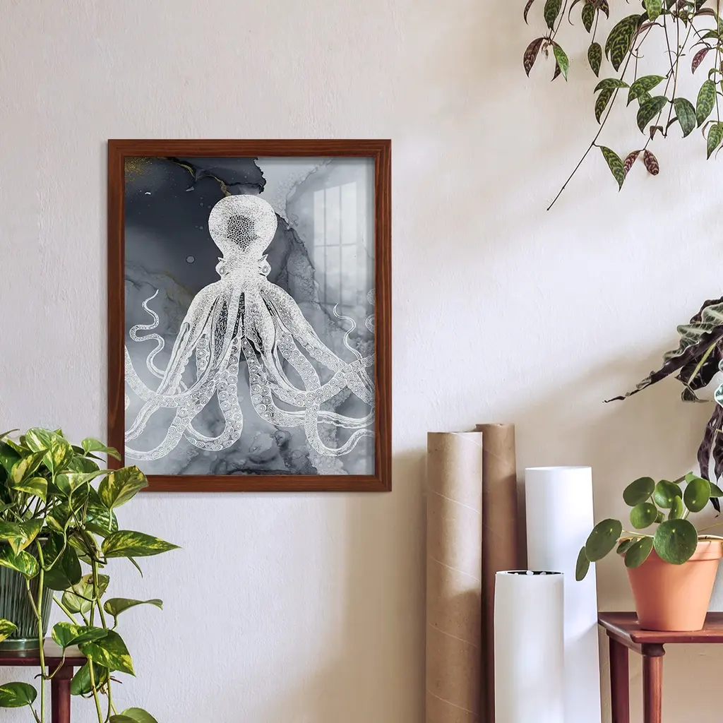 Bring contemporary abstraction to your home with this large 36W x 28H Metal Wall Art. This Silver Octopus Metal Artwork makes it the focal point of any room or office. - White gloss coating ensures colors are extra vibrant with light reflection.- Aluminum grade sheet metal with 1-inch mounting frame on the back giving the illusion that the artwork is floating on the wall.- Mounting brackets are included along with instructions.- High quality digital images are created directly into a glossy aluminum panel producing a stunning and captivating print into the glossy finish of the metal.- Water, fire and scratch resistant HD aluminum panels.- Looks better than any photo paper and guaranteed to last at least 20 years- Easy to clean with a microfiber cloth. Colors are far superior to regular canvas art. - Easy to hang