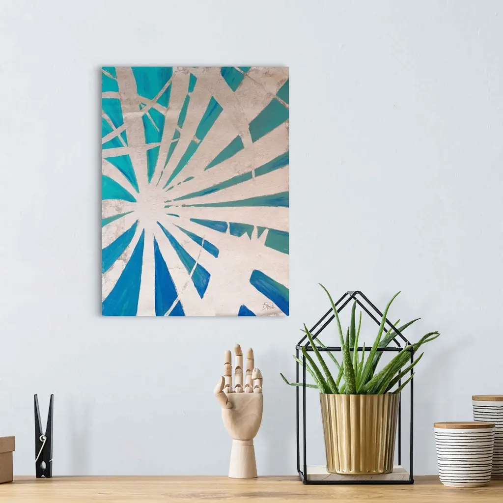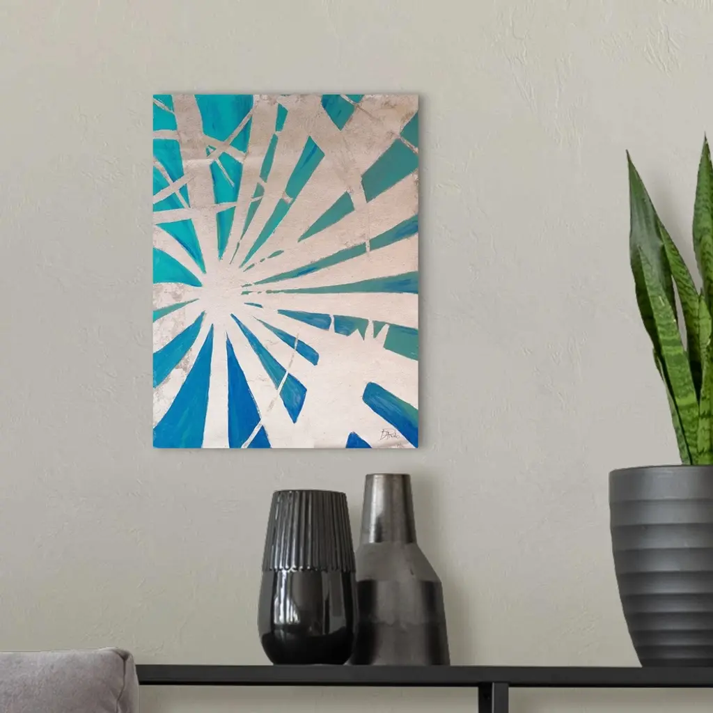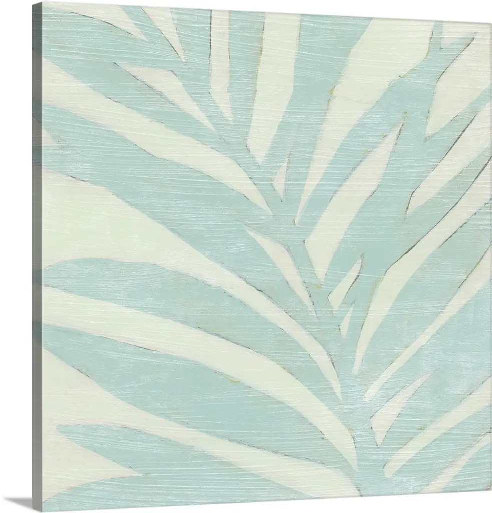 Contemporary abstract painting of a tropical looking palm fronds in light gray silhouette against a blue green background.