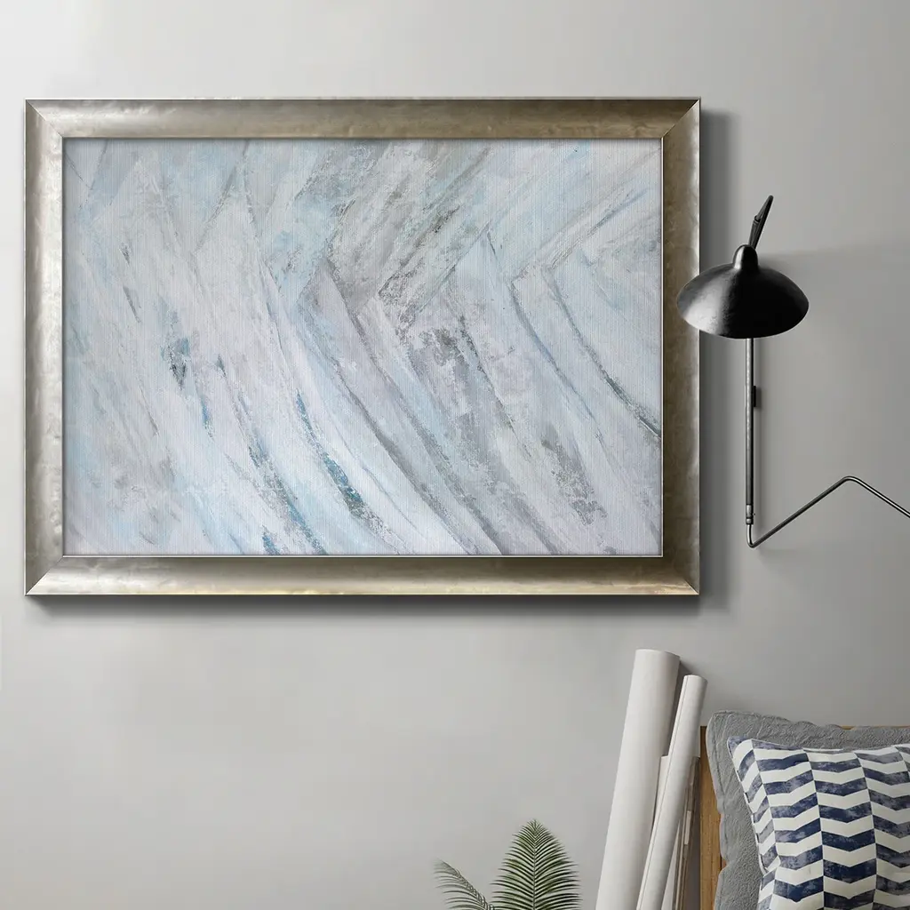 Artist Martin Edwards loves the texture and feel of paint and the sensuous beauty of color and tries to make the most of these two elements in his original works of art. This specific style shouts movement and mood as it moves across the canvas and the color only serves to intensify the emotion displayed. This piece uses subtle variations in technique and metallic color combinations to display a three-dimensional, hand painted, piece of art that displays an abstract of sliver and gold that has been embellished with glitter and encased in strong champagne frame.Comes pre-installed with 2 D-rings and rope which makes it simple to display on wall. 2 D-rings are affixed to the back of the artwork so it is ready to hang in a horizontal orientation!