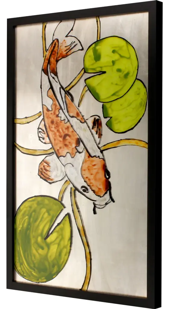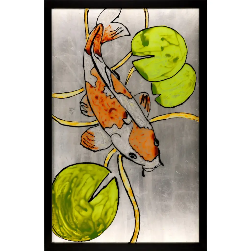 Exclusive reverse hand painted on acrylic. Framed in a black matte wood shadow box style moulding.