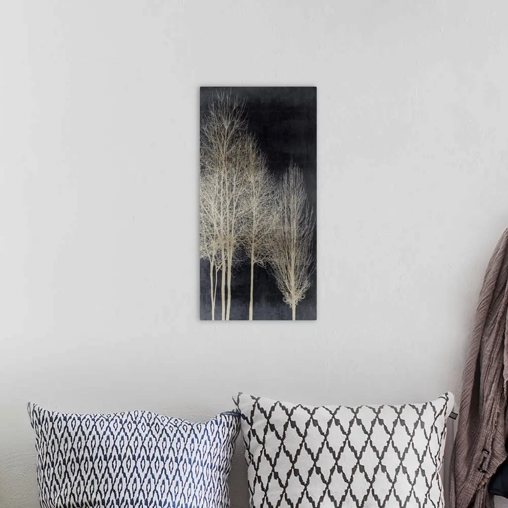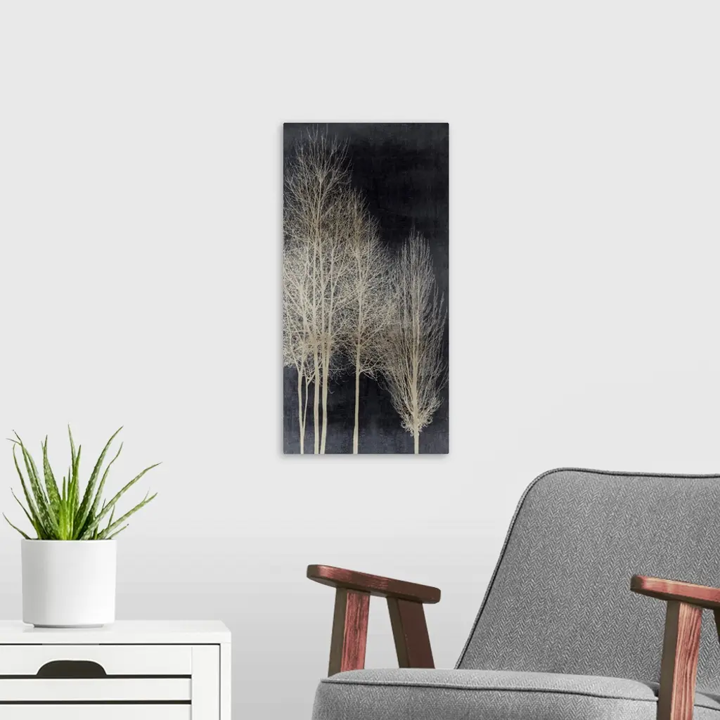 Decorative artwork featuring an aged silver silhouette of leafless trees over a distressed background.