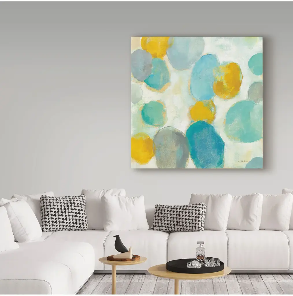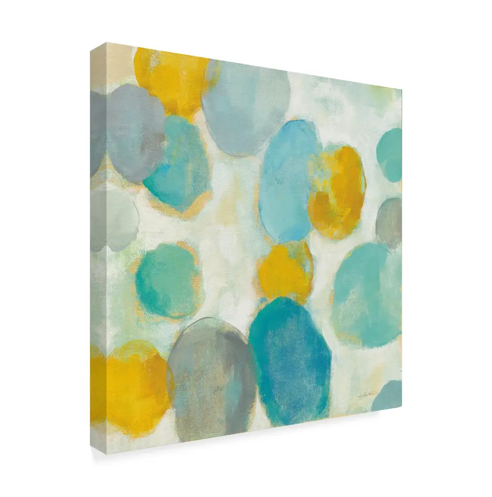 Artist: Silvia VassilevaSubject: AbstractStyle: Mid-Century ModernProduct Type: Gallery-Wrapped Canvas ArtMade in USAThis ready to hang, gallery-wrapped art piece features a patern of teal, grey, and yellow circles on a beige and white background.Silvia Vassileva pursued her love of art at the Academy of Fine Art in Bulgaria, where she earned both her bachelor's and master's degrees. She spent six years painting and exhibiting her work in Japan before moving to the U.S. Silvia describes her style as very free and bold. She makes her paintings come alive by using contrast and unusual color palettes. Silvia's home studio, which she designed herself, is bright, contemporary and minimalist.Giclee (jee-clay) is an advanced printmaking process for creating high quality fine art reproductions. The attainable excellence that Giclee printmaking affords makes the reproduction virtually indistinguishable from the original piece. The result is wide acceptance of Giclee by galleries, museums, and private collectors. Gallery wrap is a method of stretching an artist's canvas so that the canvas wraps around the sides and is secured a hidden, wooden frame. This method of stretching and preparing a canvas allows for a frameless presentation of the finished painting.