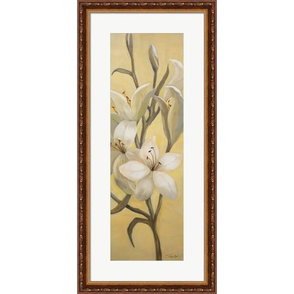 Subtle Lily I by Silvia Vassileva is a high quality piece of framed artwork. The finished size of this piece is 14.75" X 31". It has a Slim Gold with Ornate Detail frame, is single matted and finished with high quality Acrylic Plexiglass. 100% Satisfaction Guaranteed.