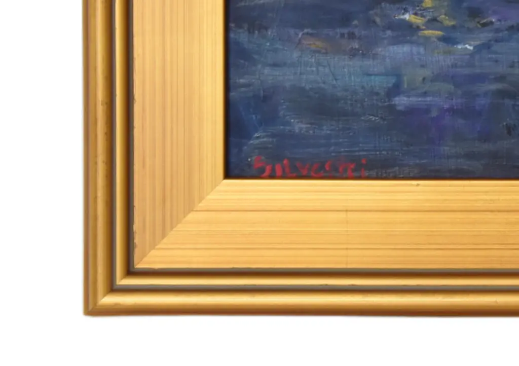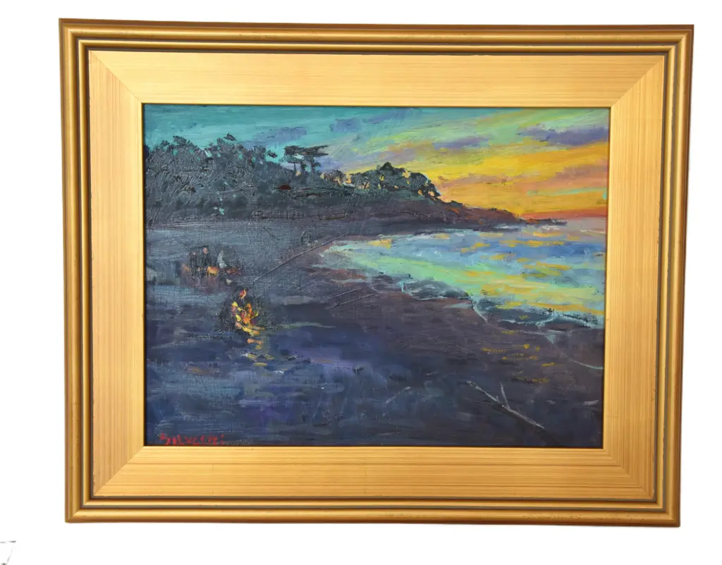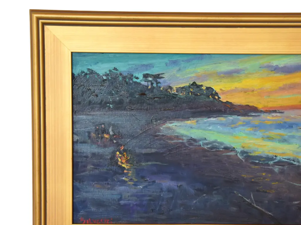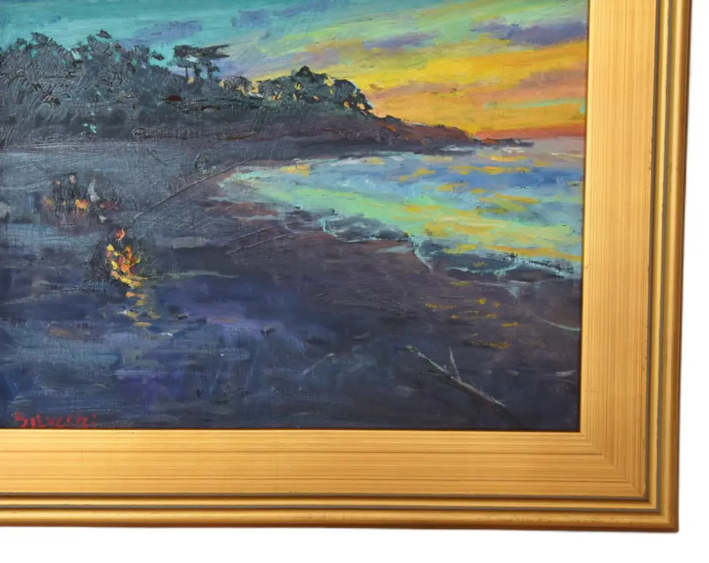 Campfire on beach seascape landscape oil painting on artist board by listed artist Silvio Silvestri (1948-2018.) Silvestri was a plein-air artist who painted in California, The Western United States, and Europe and was influenced by French, American, Spanish, and Russian Impressionists. Signed by the artist lower left corner. Included are the new antiqued gold wood frame and hardware/wire. Dimensions: Artwork, 16����L x 12”H; including the frame, 21��L x 17����H. Excellent condition!