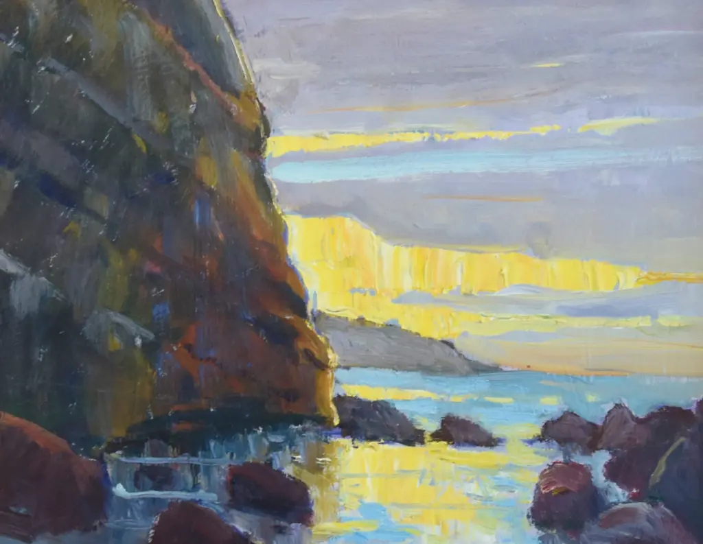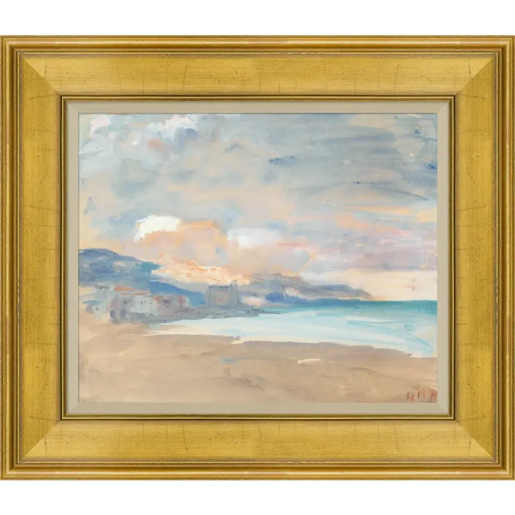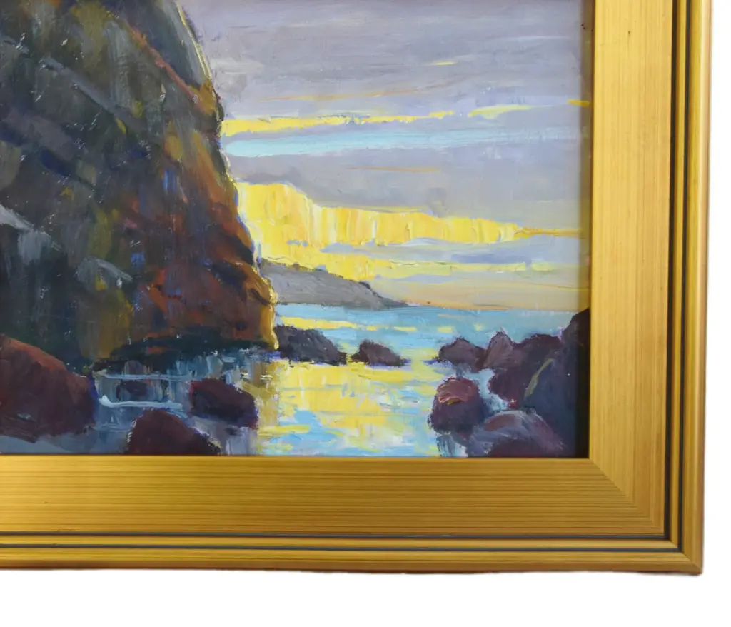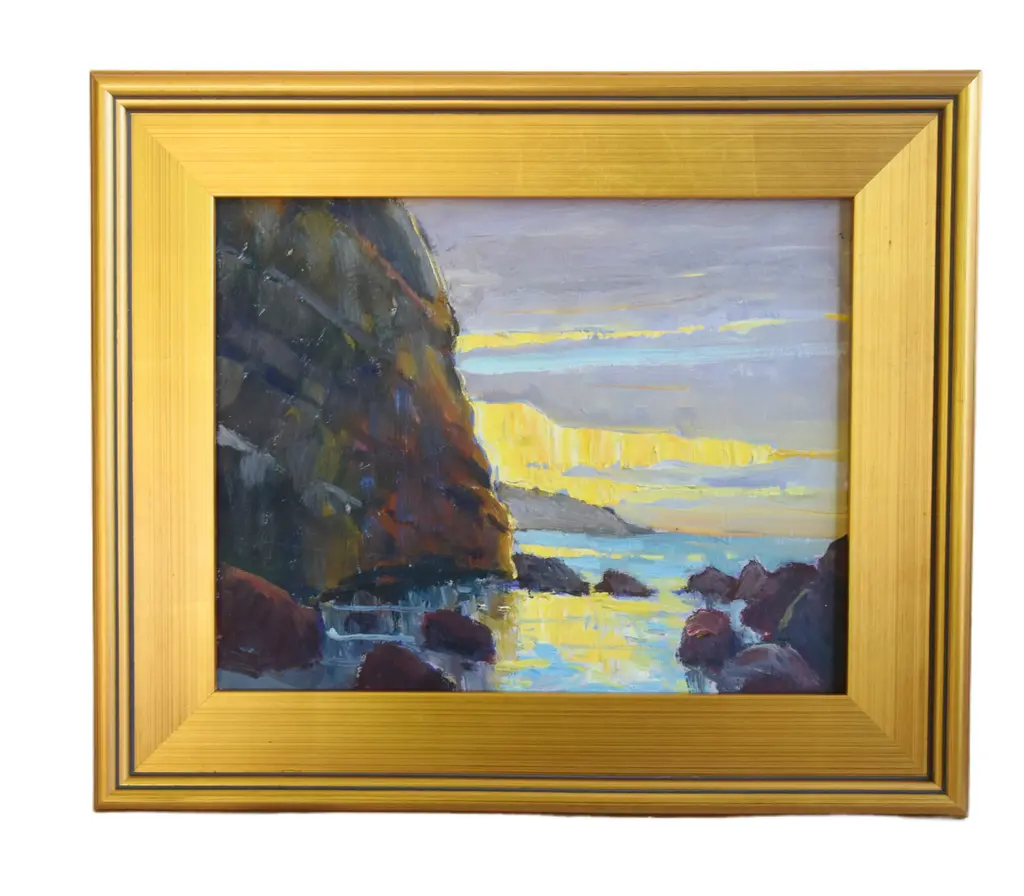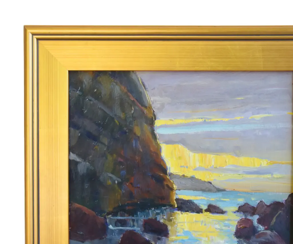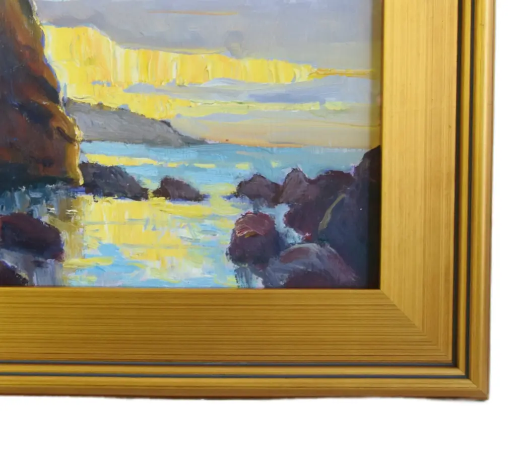 Seascape oil painting on artist board by listed artist Silvio Silvestri (1948-2018.) Silvestri was a plein-air artist who painted in California, The Western United States, and Europe and was influenced by French, American, Spanish, and Russian Impressionists. Marked “Estate of Silvi Silvestri��� on verso. Included are the new antiqued gold wood frame and hardware/wire. Dimensions: Artwork, 14”L x 11��������H; including the frame, 19��L x 16””H. Excellent condition!