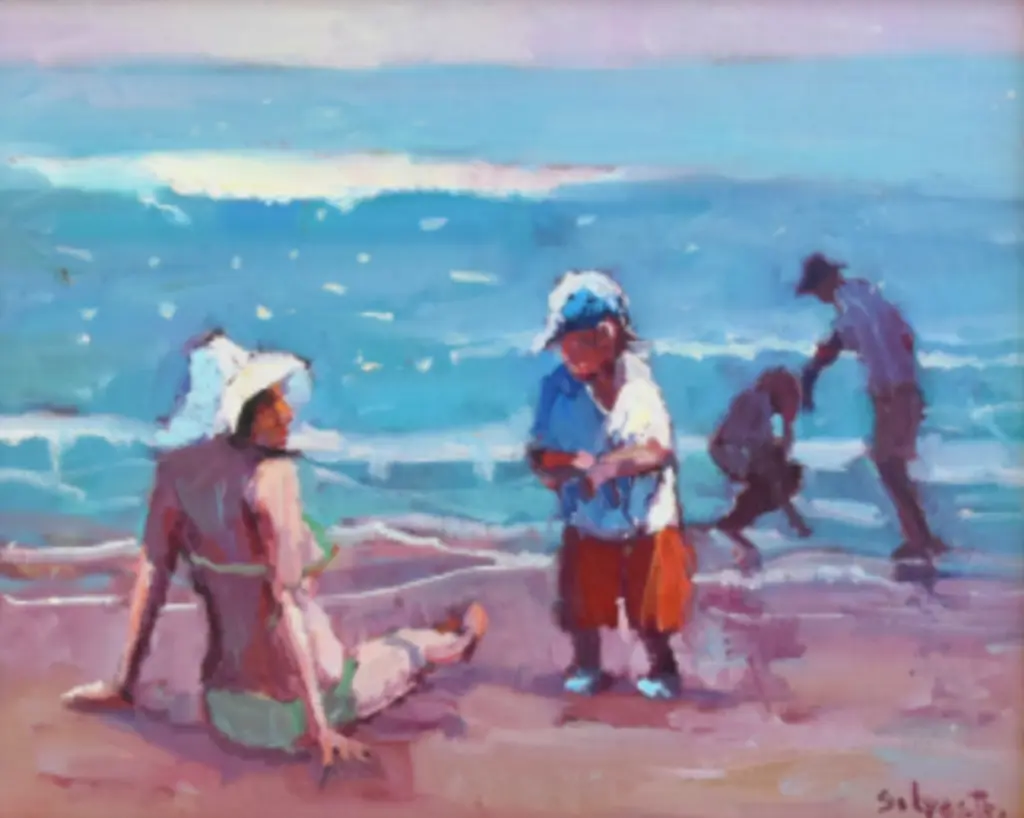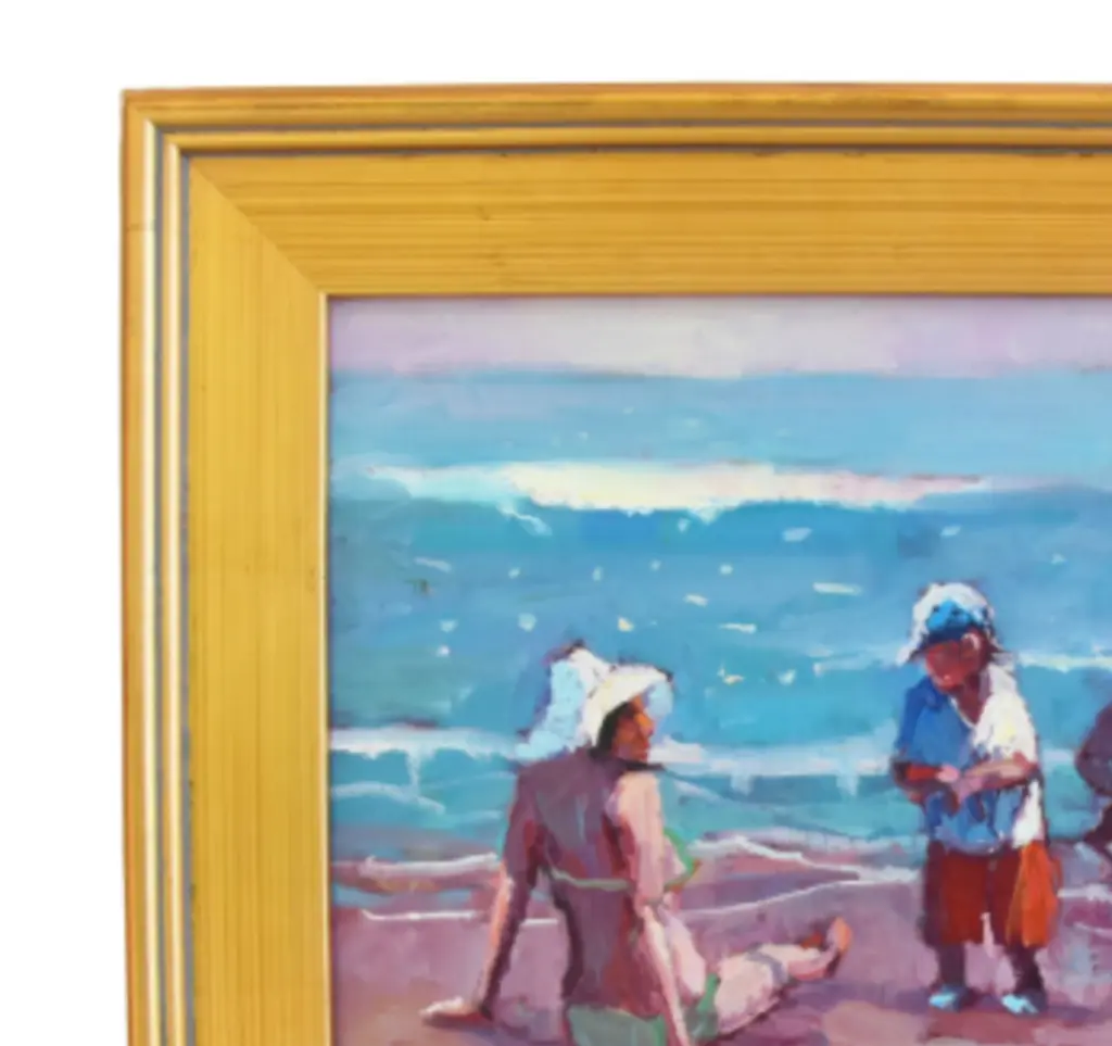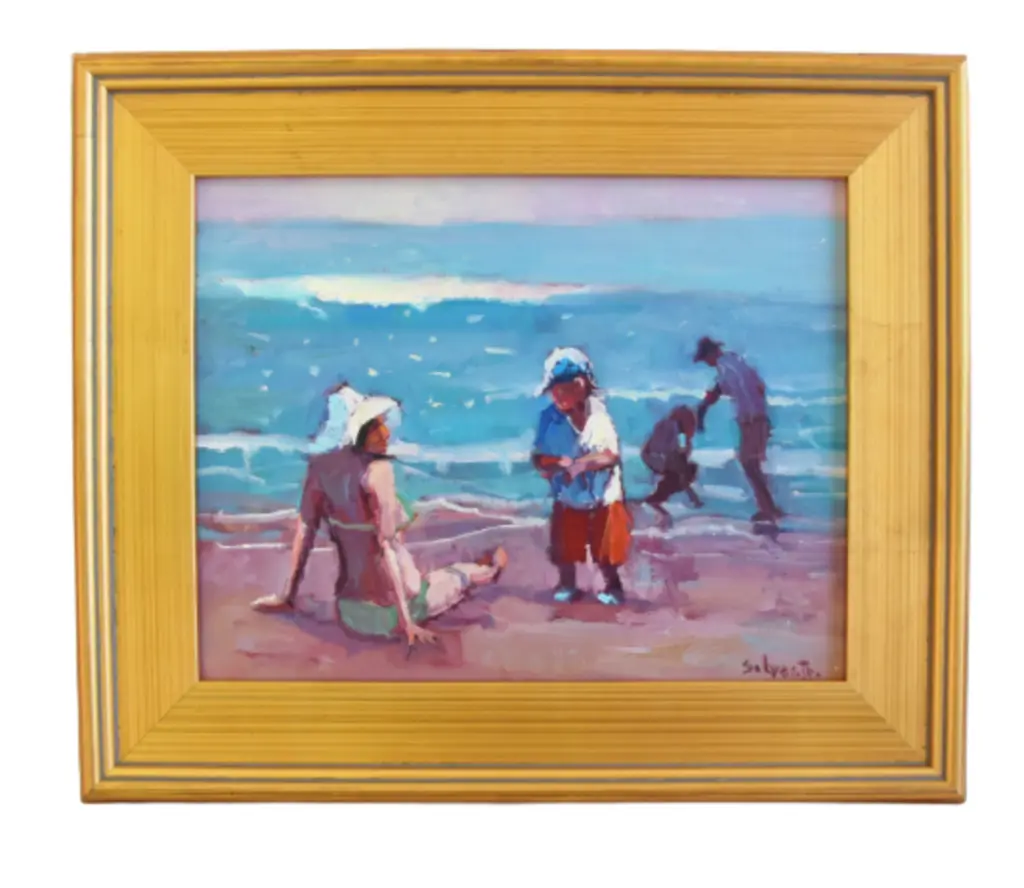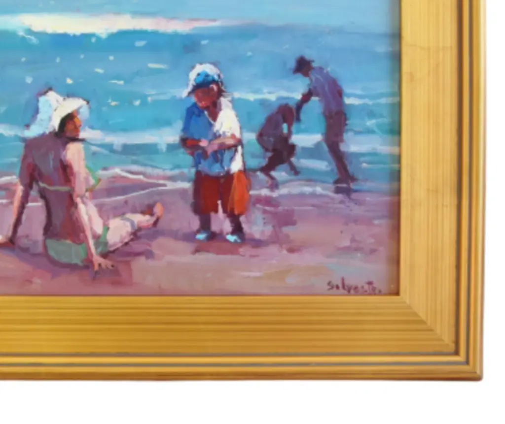 Coastal beach seascape painting on artist board by listed artist Silvio Silvestri (1948-2018.) Silvestri was a plein-air artist who painted throughout California, The Western United States, and Europe and was influenced by French, American, Spanish, and Russian Impressionists. Signed by the artist lower right. Included are the new antiqued gold wood frame and hardware/wire. Dimensions: Artwork, 14”L x 11���H; including the frame, 19”L x 16��H. Excellent condition!