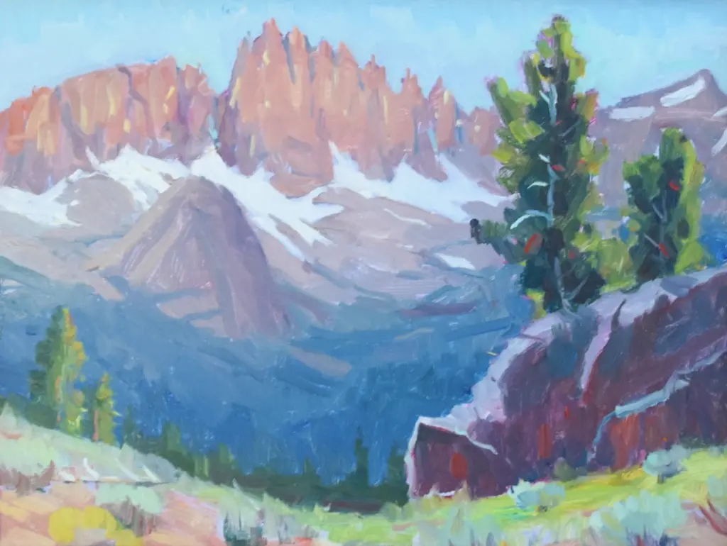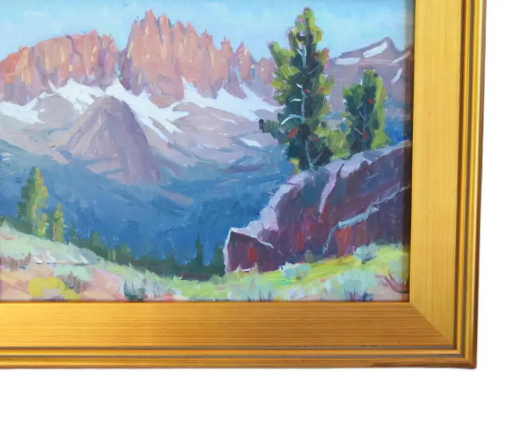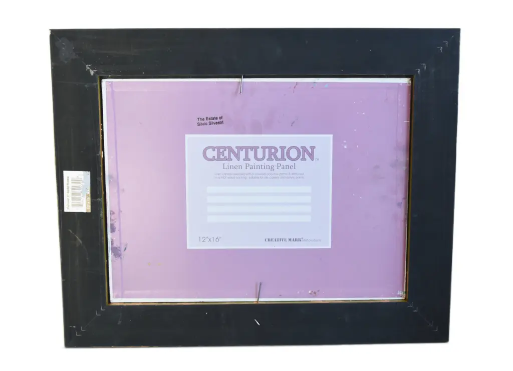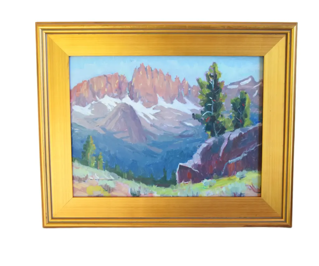 Mountain forest landscape oil painting on artist canvas panel by listed artist Silvio Silvestri (1948-2018.) Silvestri was a plein-air artist who painted throughout California, The Western United States, and Europe and was influenced by French, American, Spanish, and Russian Impressionists. Marked on reverse "Estate of Silvio Silvestri." Included are the new antiqued gold wood frame and hardware/wire. Dimensions: Artwork, 16�����L x 12"H; including the frame, 21����L x 17����H. Excellent condition!