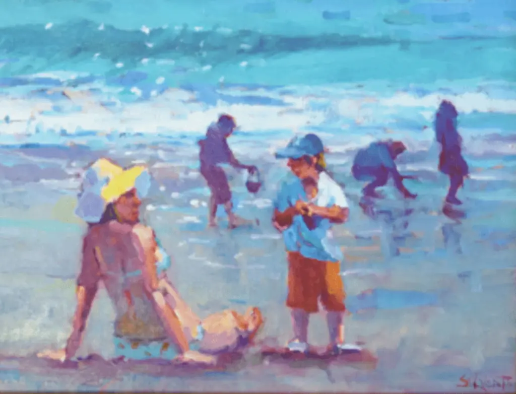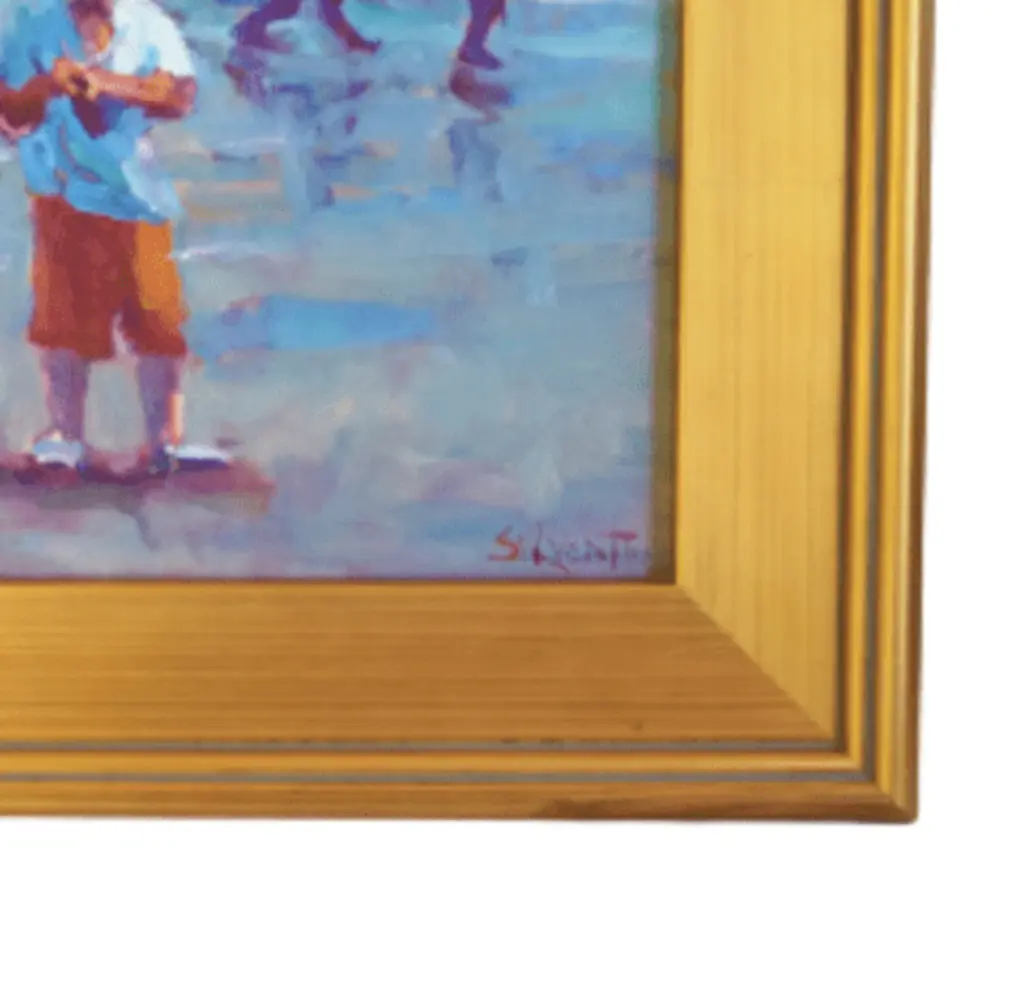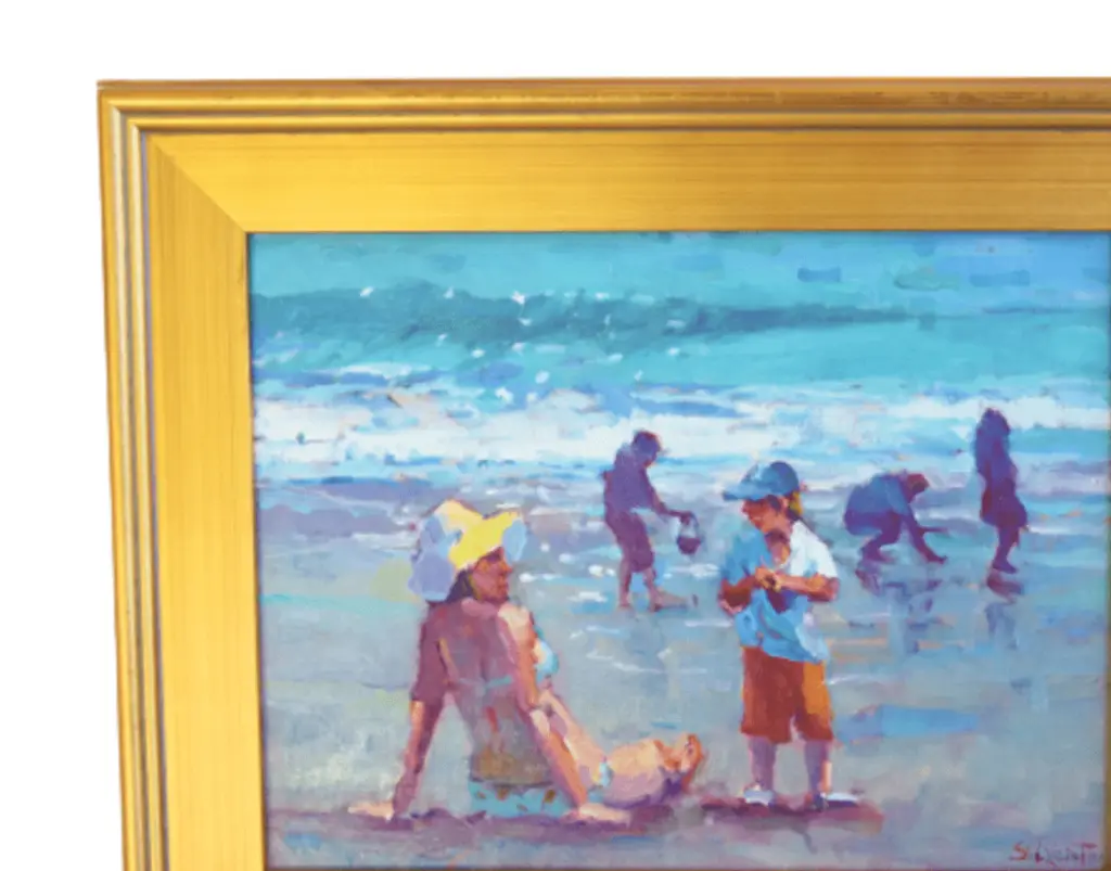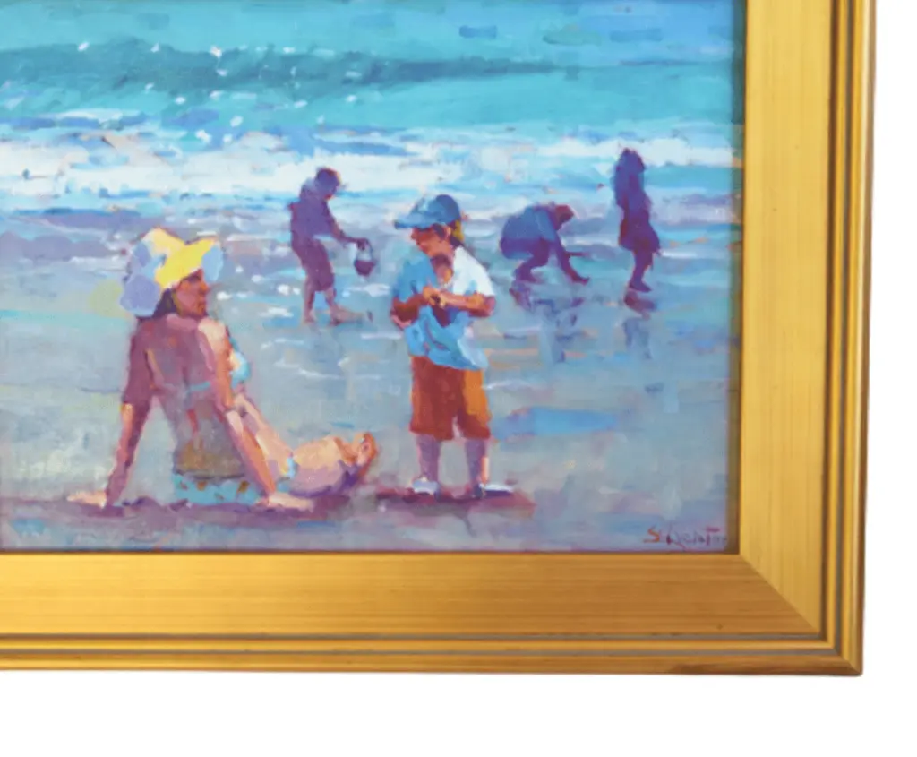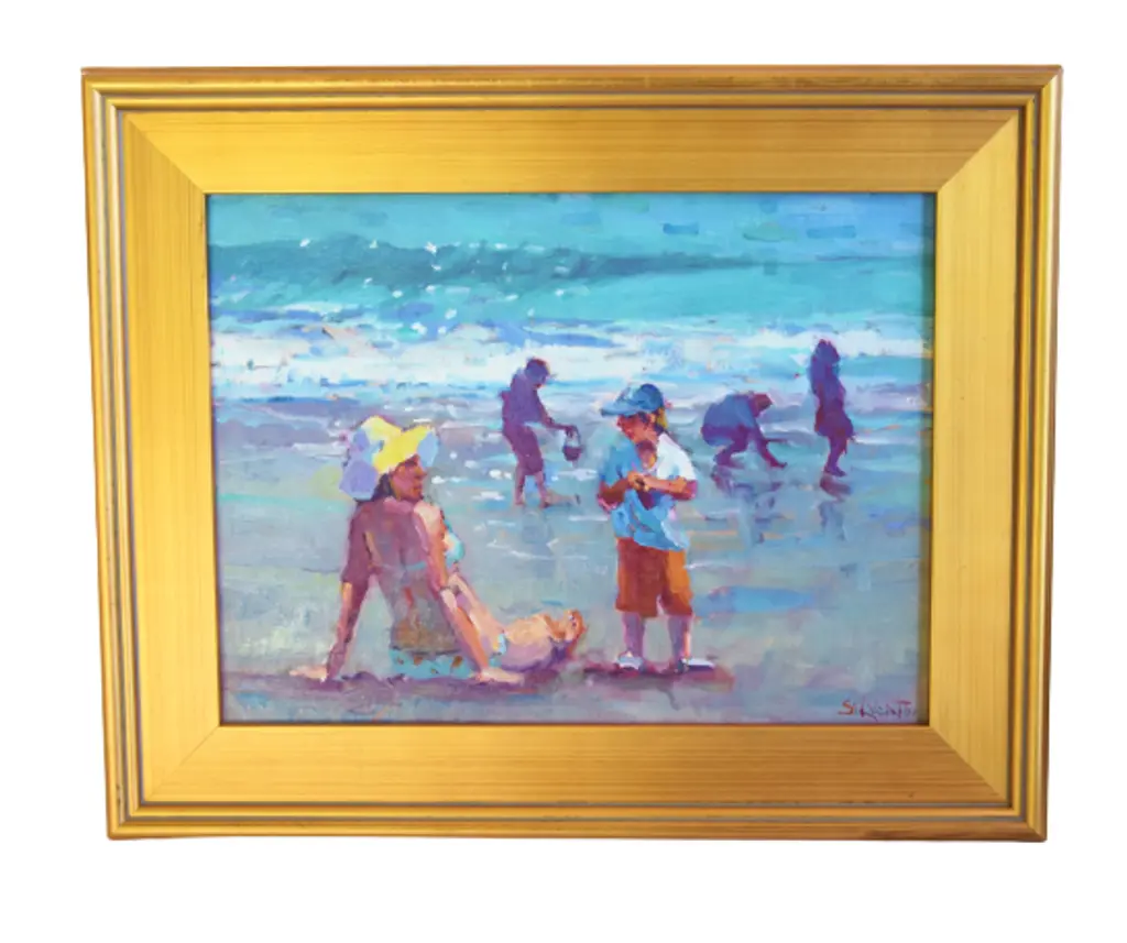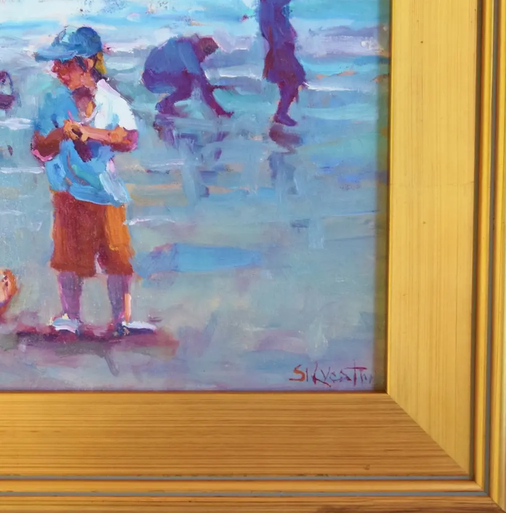 Beach fun time seascape oil painting on artist canvas board by listed artist Silvio Silvestri (1948-2018.) Silvestri was a plein-air artist who painted throughout California, The Western United States, and Europe and was influenced by French, American, Spanish, and Russian Impressionists. Signed lower right. Included are the new antiqued gold wood frame and hardware/wire. Dimensions: Artwork, 16”L x 12"H; including the frame, 21”L x 17”H. Excellent condition!