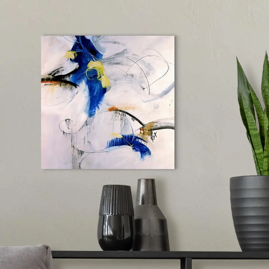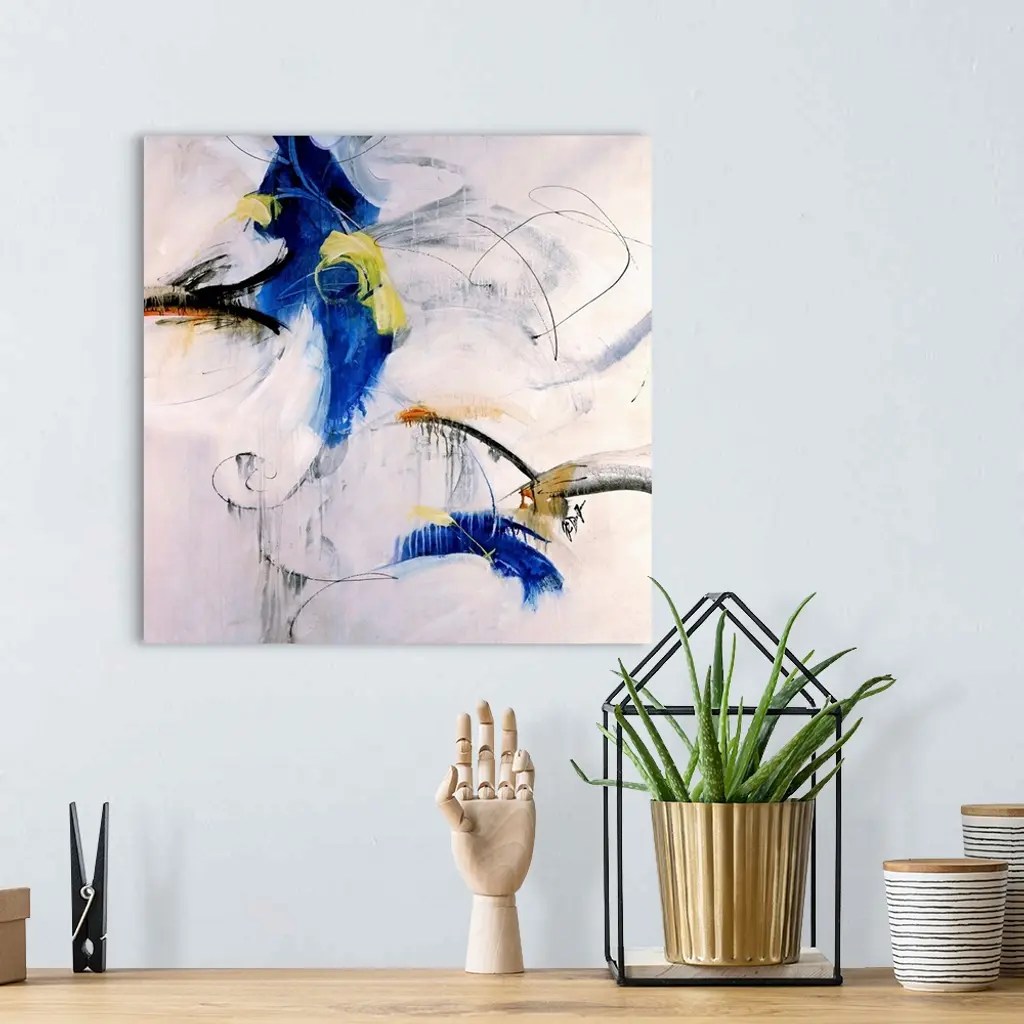 A square, abstract painting of swirls and shapes of color on a neutral backdrop.