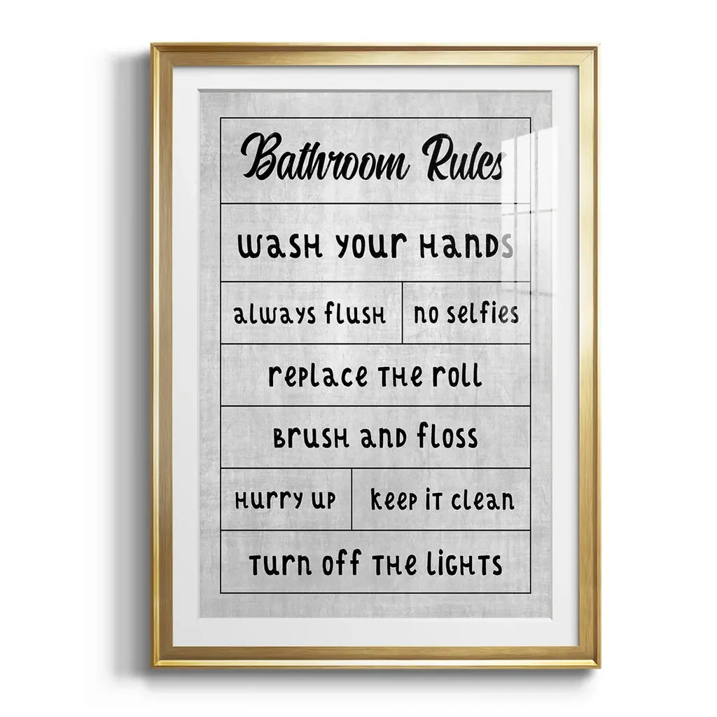 Simple Bathroom Rules Premium Framed Print - Ready to Hang A Premium Framed Print created to last. Framed in distressed wood and available in an array of sizes and colors Featuring a beveled a solid wood stretcher bar, each piece comes ready to hand 4 SIZES AVAILABLE 30.5''X42.5'' - Overall Size 26.5'X36.5'' - Overall Size 22.5''x30.5'' - Overall Size 18.5''x24.5'' - Overall Size Each piece is made to order. Each piece comes with hanging hardware. Made in the USA Ready to Hang Giclee Paper Print Acrylic Glass Beveled Matt Board