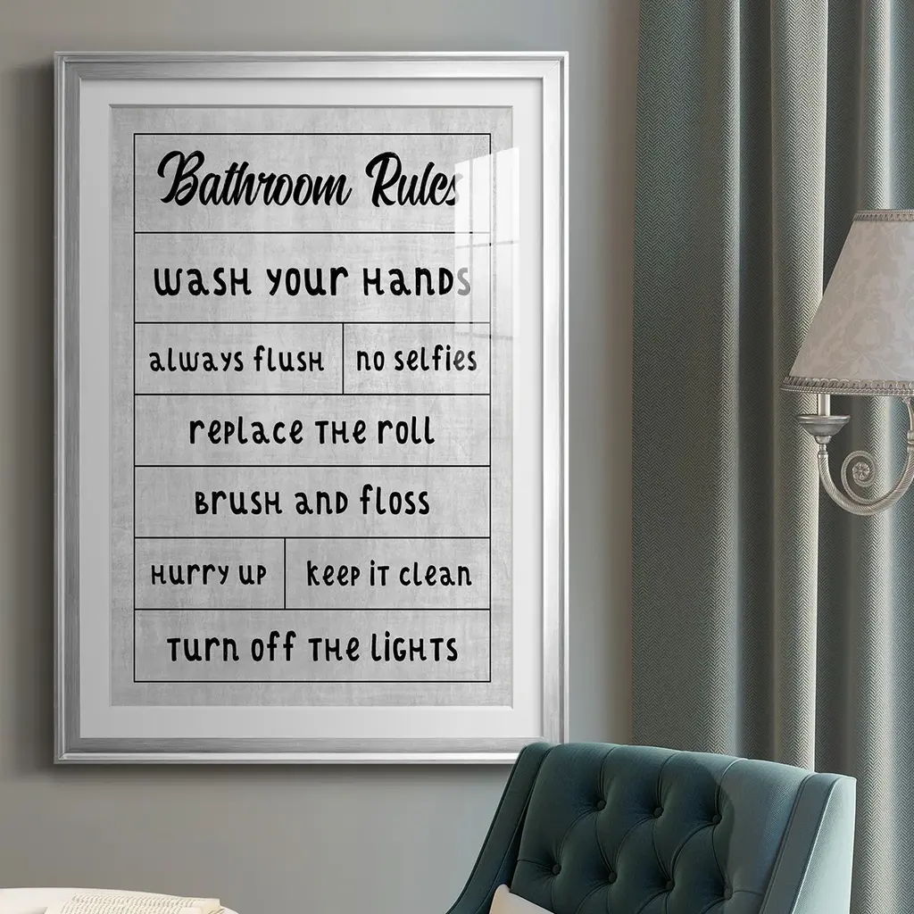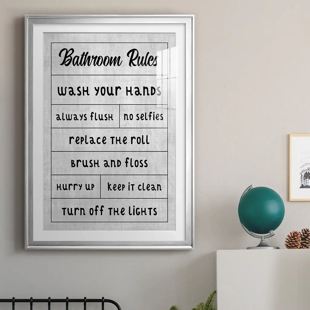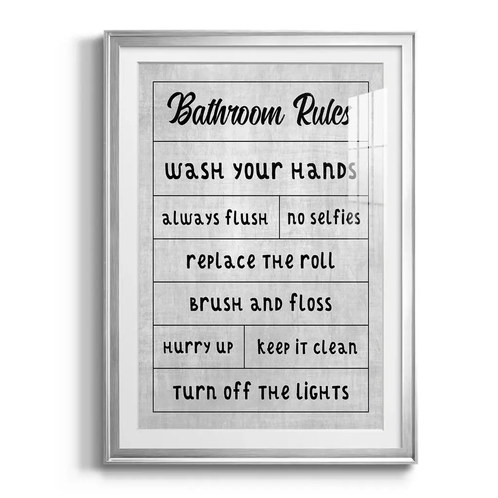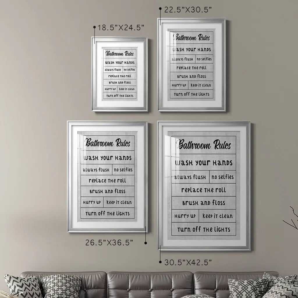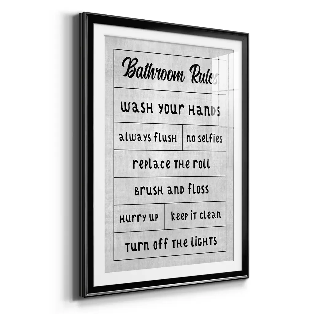 Simple Bathroom Rules Premium Framed Print - Ready to Hang A Premium Framed Print created to last. Framed in distressed wood and available in an array of sizes and colors Featuring a beveled a solid wood stretcher bar, each piece comes ready to hand 4 SIZES AVAILABLE 30.5''X42.5'' - Overall Size 26.5'X36.5'' - Overall Size 22.5''x30.5'' - Overall Size 18.5''x24.5'' - Overall Size Each piece is made to order. Each piece comes with hanging hardware. Made in the USA Ready to Hang Giclee Paper Print Acrylic Glass Beveled Matt Board