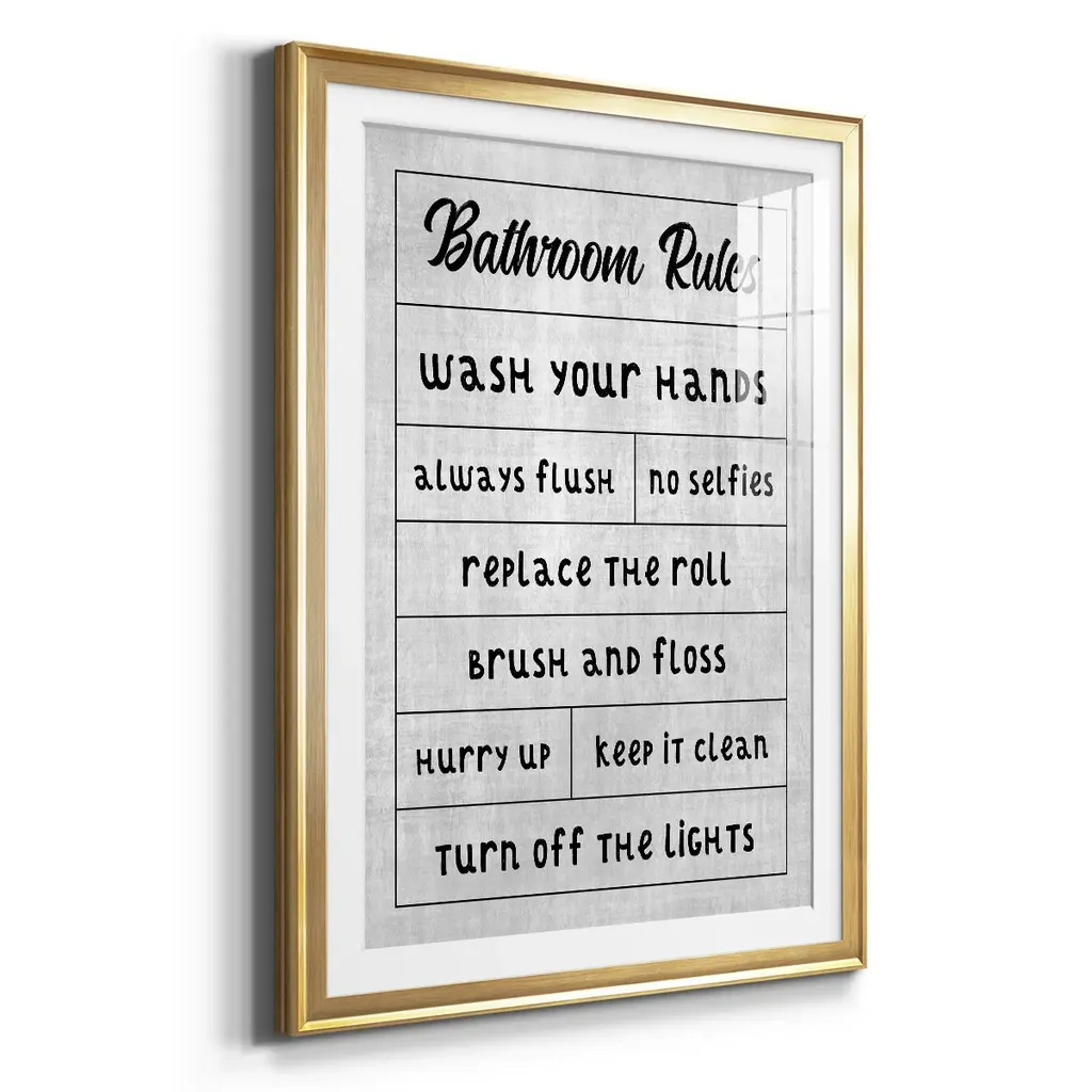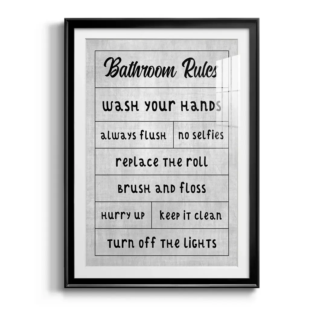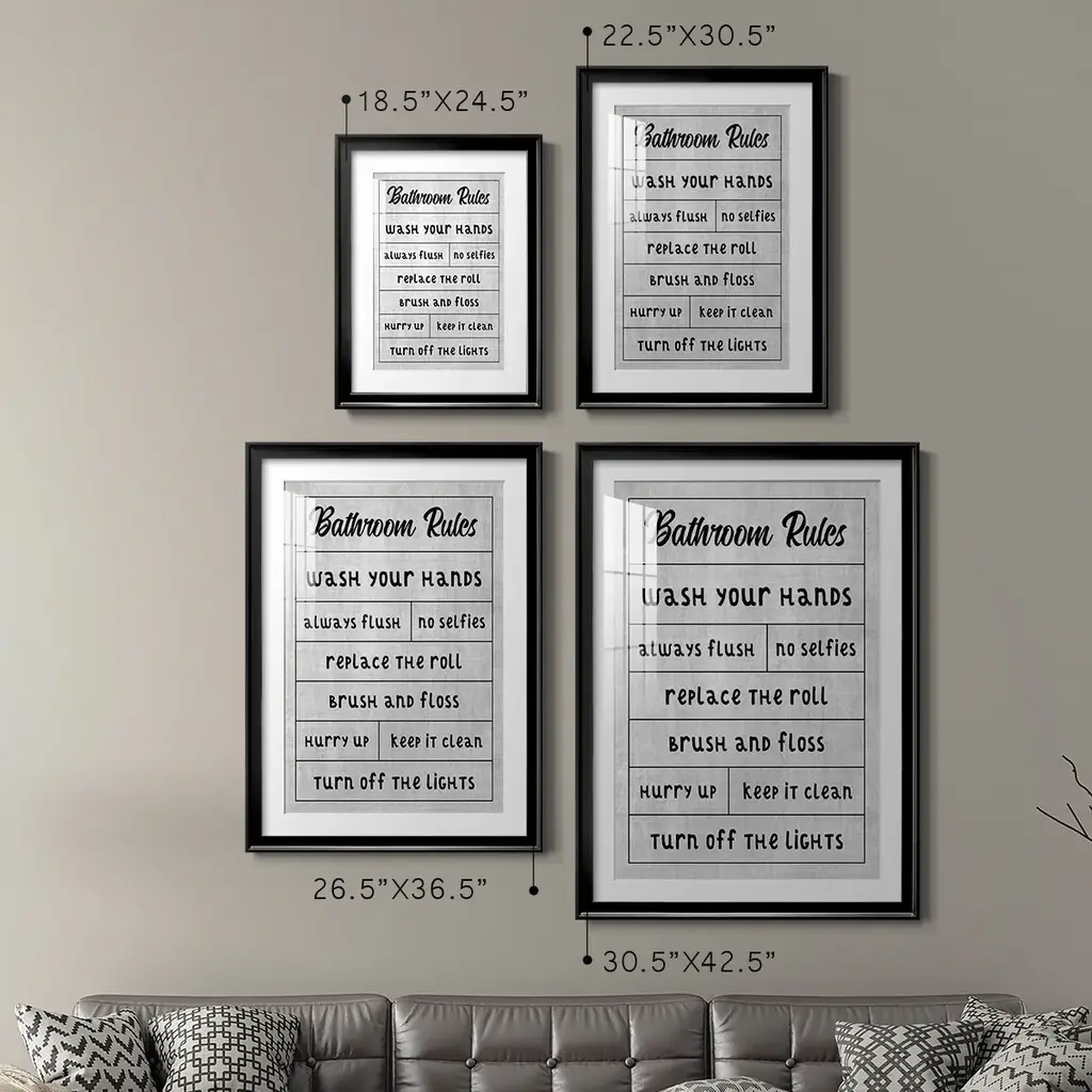 Simple Bathroom Rules Premium Framed Print - Ready to Hang A Premium Framed Print created to last. Framed in distressed wood and available in an array of sizes and colors Featuring a beveled a solid wood stretcher bar, each piece comes ready to hand 4 SIZES AVAILABLE 30.5''X42.5'' - Overall Size 26.5'X36.5'' - Overall Size 22.5''x30.5'' - Overall Size 18.5''x24.5'' - Overall Size Each piece is made to order. Each piece comes with hanging hardware. Made in the USA Ready to Hang Giclee Paper Print Acrylic Glass Beveled Matt Board