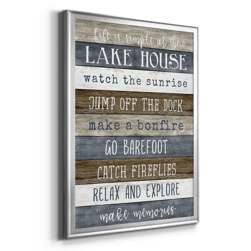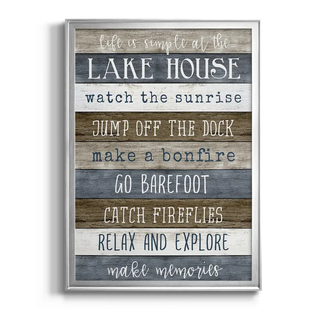 Simple Lake Rules Premium Framed Print - Ready to Hang A Premium Framed Print created to last. Framed in distressed wood and available in an array of sizes and colors Featuring a beveled a solid wood stretcher bar, each piece comes ready to hand 4 SIZES AVAILABLE 30.5''X42.5'' - Overall Size 26.5'X36.5'' - Overall Size 22.5''x30.5'' - Overall Size 18.5''x24.5'' - Overall Size Each piece is made to order. Each piece comes with hanging hardware. Made in the USA Ready to Hang