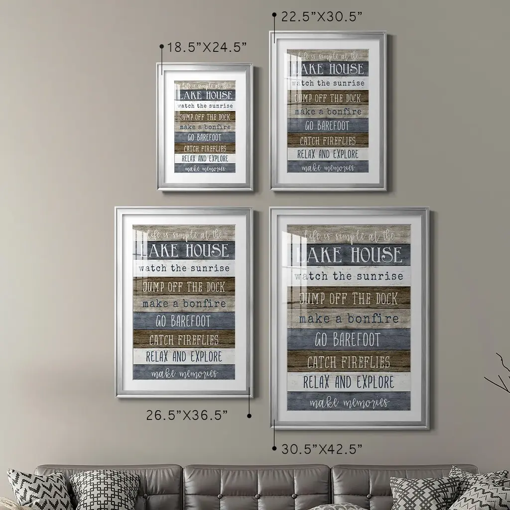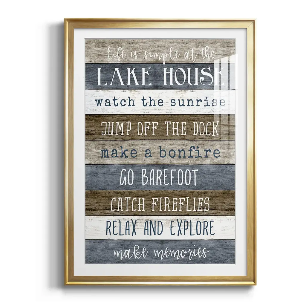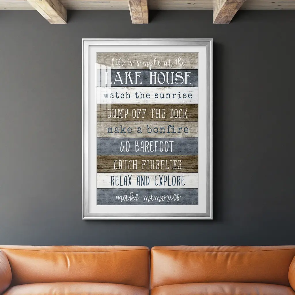 Simple Lake Rules Premium Framed Print - Ready to Hang A Premium Framed Print created to last. Framed in distressed wood and available in an array of sizes and colors Featuring a beveled a solid wood stretcher bar, each piece comes ready to hand 4 SIZES AVAILABLE 30.5''X42.5'' - Overall Size 26.5'X36.5'' - Overall Size 22.5''x30.5'' - Overall Size 18.5''x24.5'' - Overall Size Each piece is made to order. Each piece comes with hanging hardware. Made in the USA Ready to Hang Giclee Paper Print Acrylic Glass Beveled Matt Board