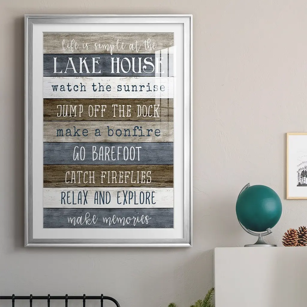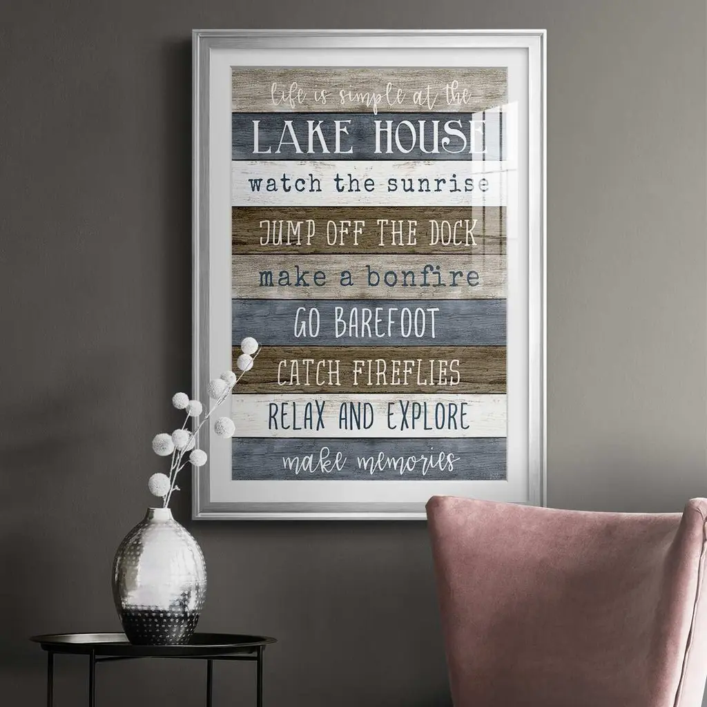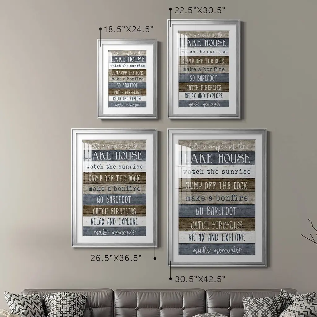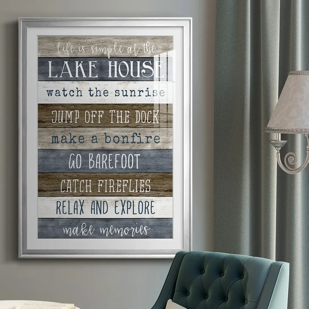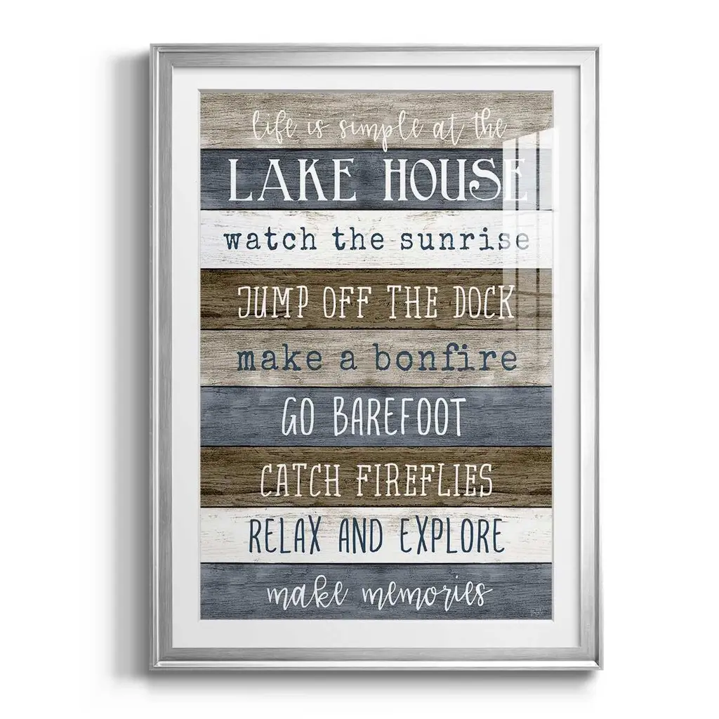 Simple Lake Rules Premium Framed Print - Ready to Hang A Premium Framed Print created to last. Framed in distressed wood and available in an array of sizes and colors Featuring a beveled a solid wood stretcher bar, each piece comes ready to hand 4 SIZES AVAILABLE 30.5''X42.5'' - Overall Size 26.5'X36.5'' - Overall Size 22.5''x30.5'' - Overall Size 18.5''x24.5'' - Overall Size Each piece is made to order. Each piece comes with hanging hardware. Made in the USA Ready to Hang Giclee Paper Print Acrylic Glass Beveled Matt Board