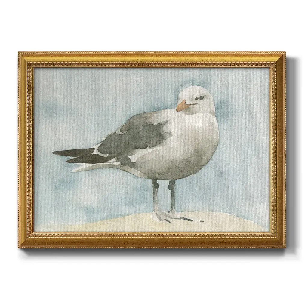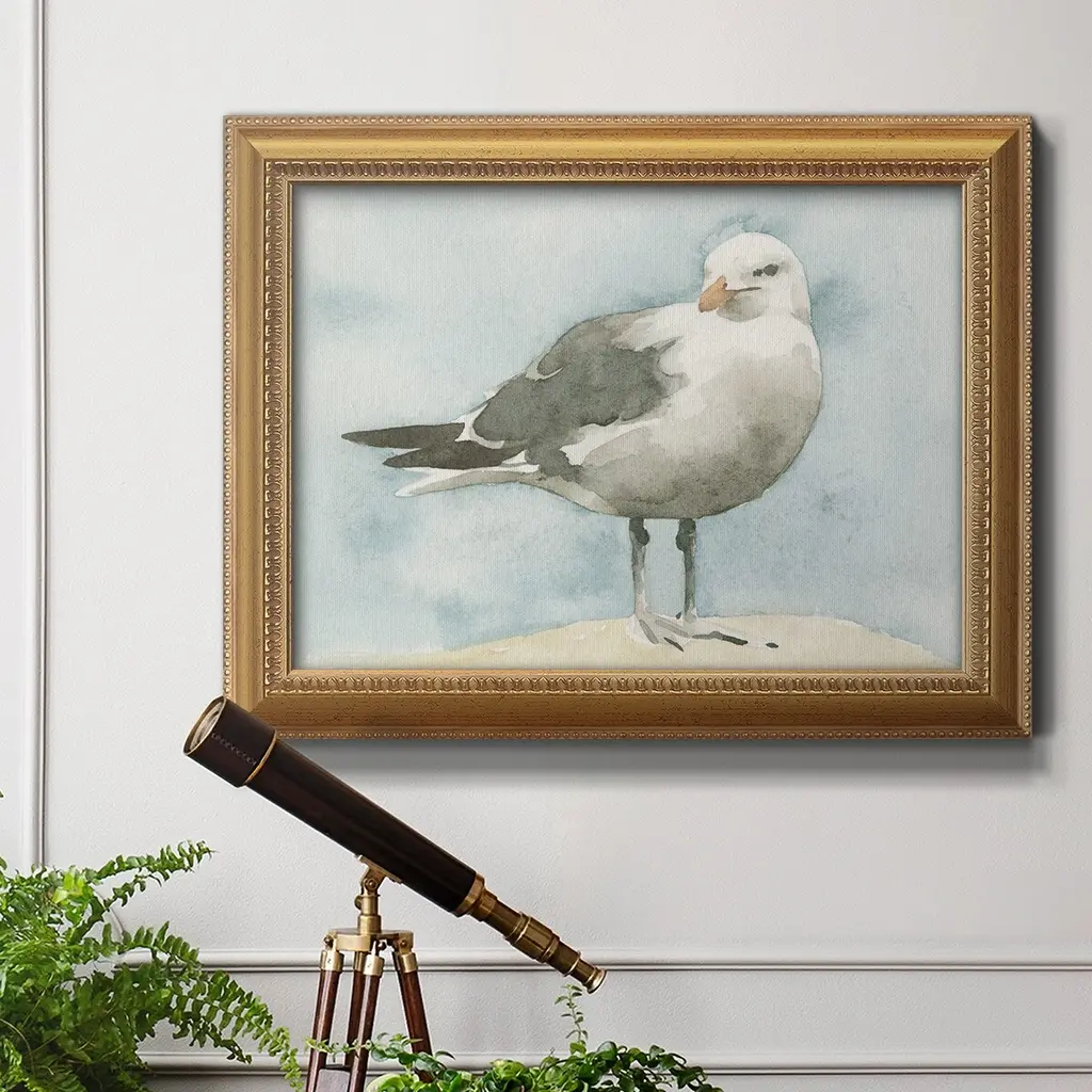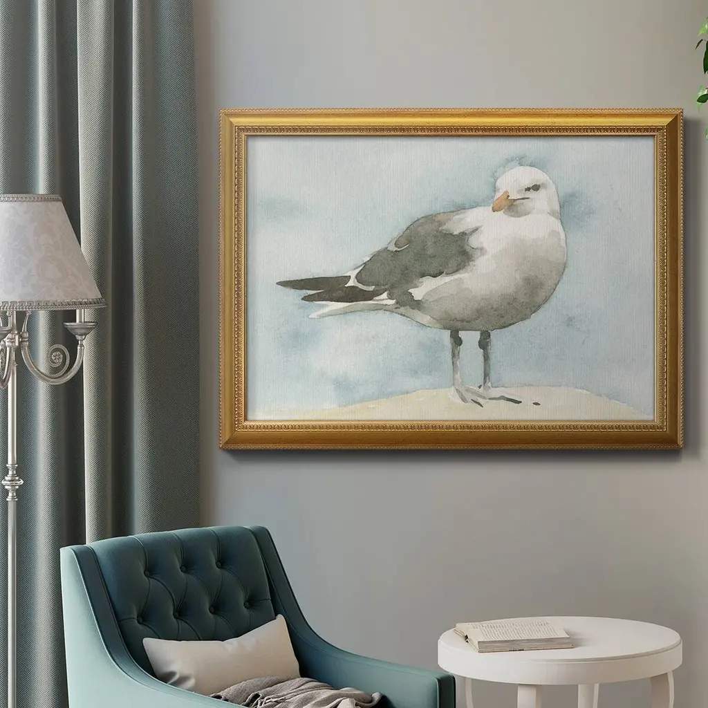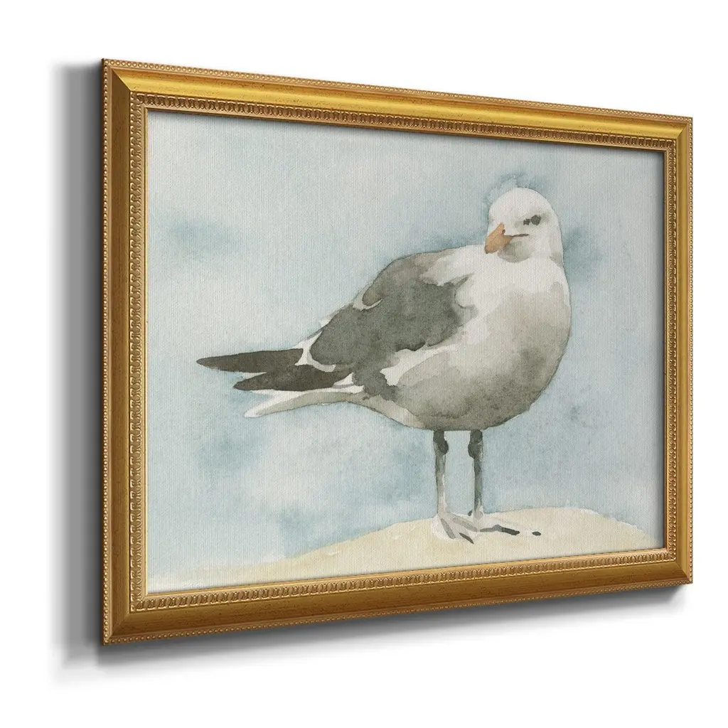 Simple Seagull I Premium Framed Canvas- Ready to Hang A Premium Framed Canvas created to last. Framed in distressed wood and available in an array of sizes and colors Featuring a beveled a solid wood stretcher bar, each piece comes ready to hand 3 SIZES AVAILABLE 16''X20'' - Overall Size 18'X27'' - Overall Size 24''x36'' - Overall Size Each piece is made to order. Each piece comes with hanging hardware. Made in the USA Ready to Hang Giclee Paper Print Acrylic Glass Beveled Matt Board