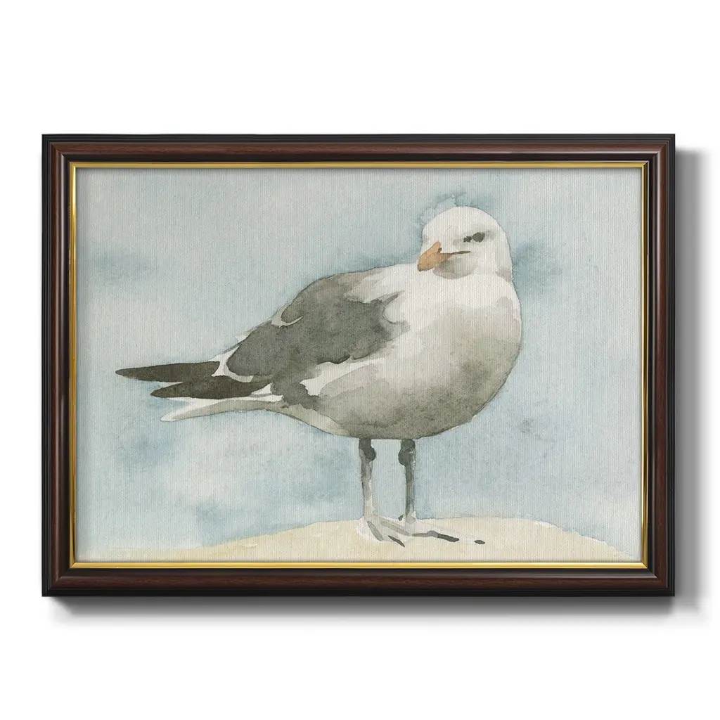 Simple Seagull I Premium Framed Canvas- Ready to Hang A Premium Framed Canvas created to last. Framed in distressed wood and available in an array of sizes and colors Featuring a beveled a solid wood stretcher bar, each piece comes ready to hand 3 SIZES AVAILABLE 16''X20'' - Overall Size 18'X27'' - Overall Size 24''x36'' - Overall Size Each piece is made to order. Each piece comes with hanging hardware. Made in the USA Ready to Hang Giclee Paper Print Acrylic Glass Beveled Matt Board