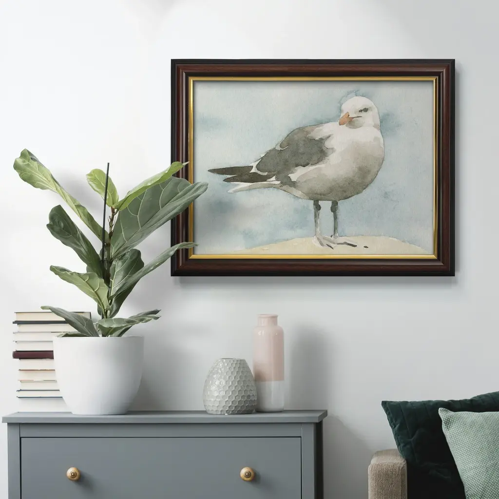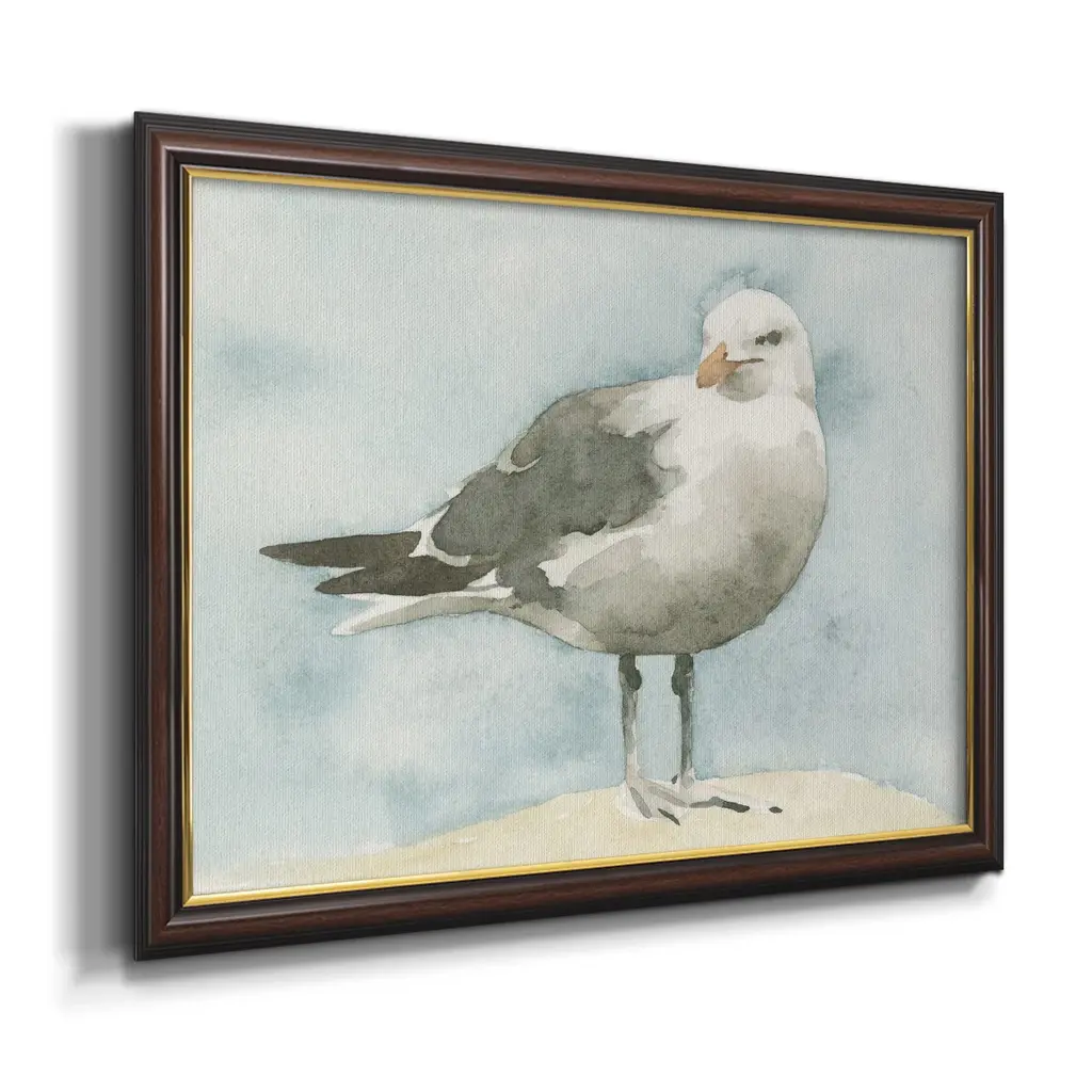 Simple Seagull I Premium Framed Canvas- Ready to Hang A Premium Framed Canvas created to last. Framed in distressed wood and available in an array of sizes and colors Featuring a beveled a solid wood stretcher bar, each piece comes ready to hand 3 SIZES AVAILABLE 16''X20'' - Overall Size 18'X27'' - Overall Size 24''x36'' - Overall Size Each piece is made to order. Each piece comes with hanging hardware. Made in the USA Ready to Hang Giclee Paper Print Acrylic Glass Beveled Matt Board