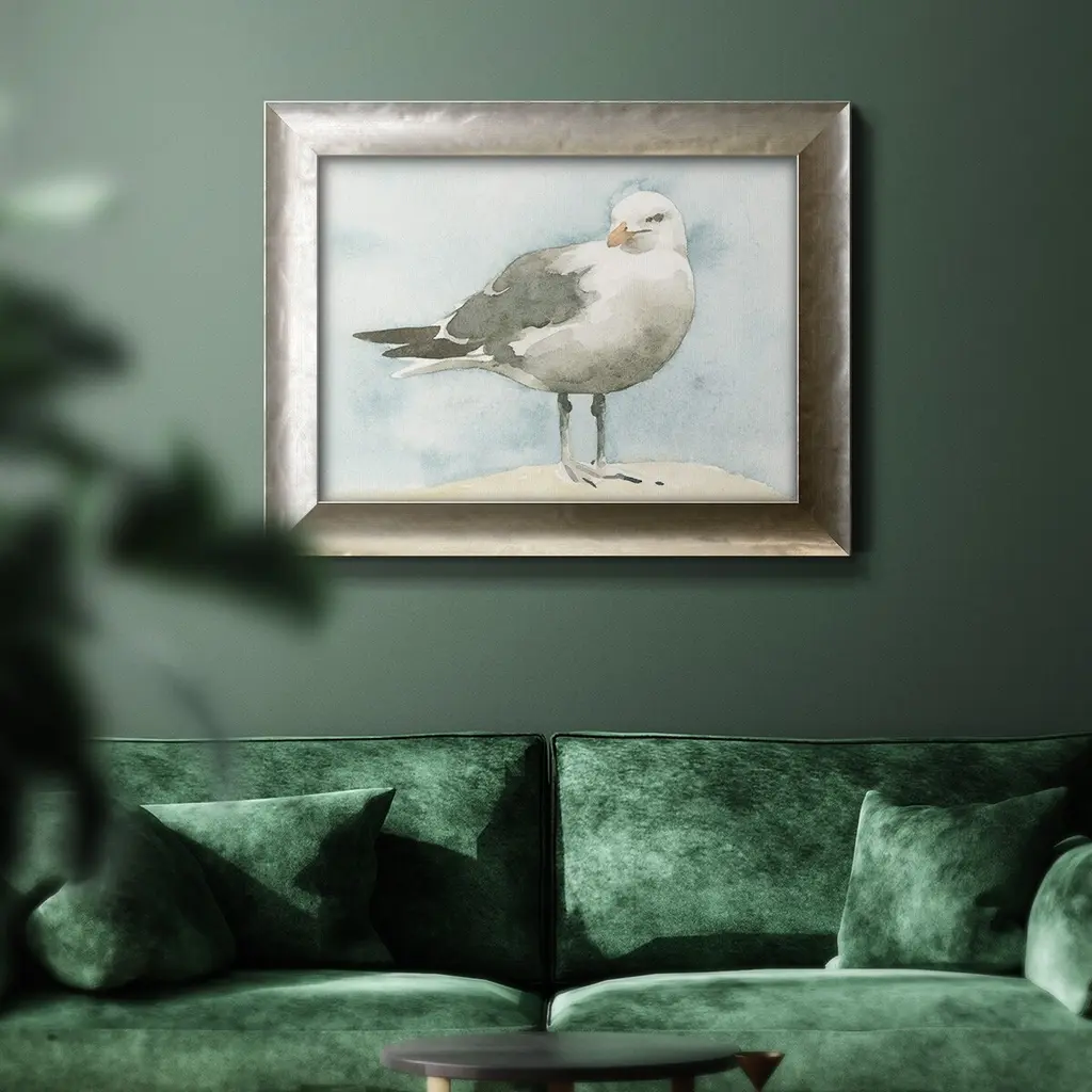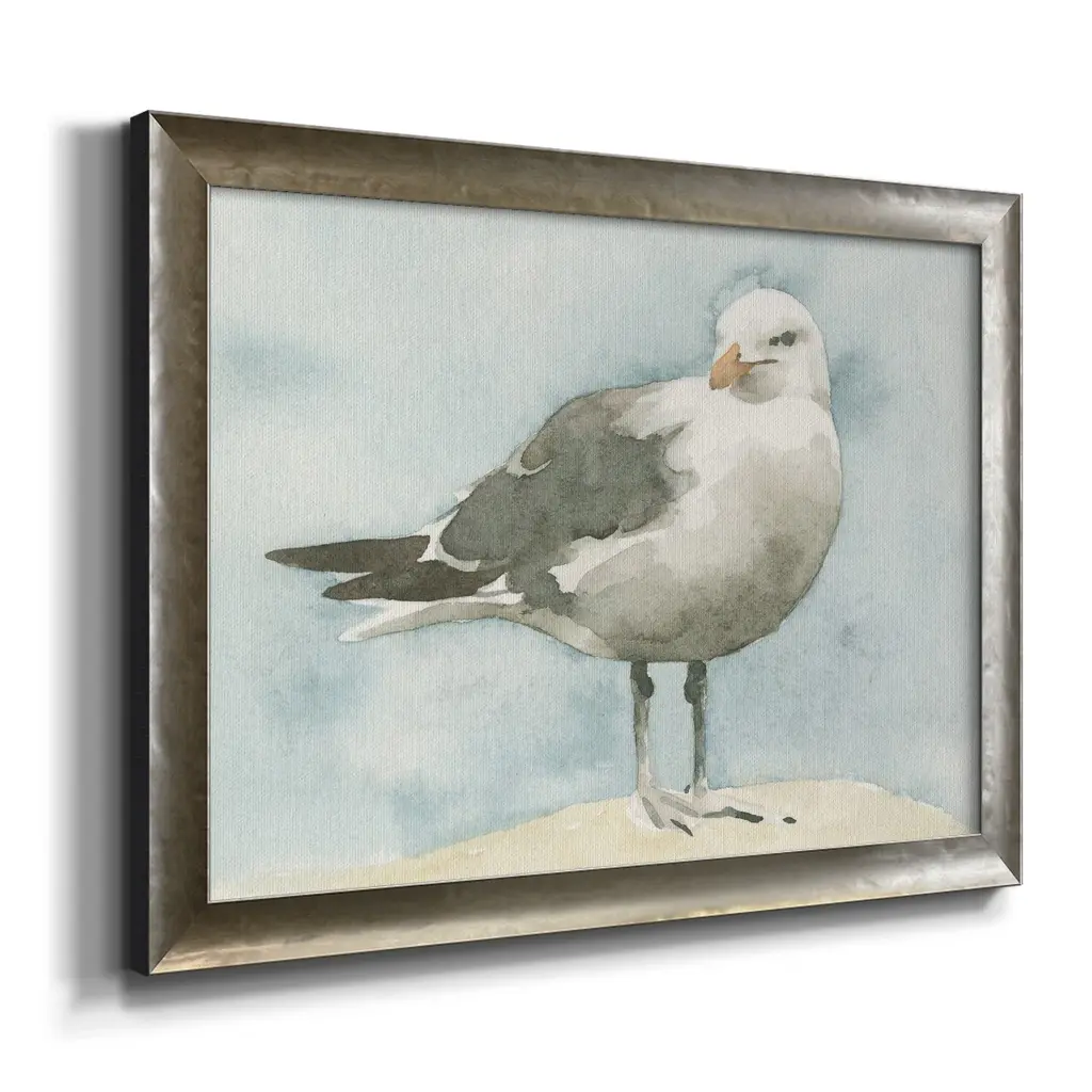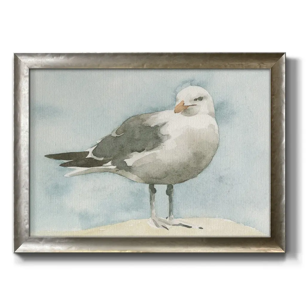 Simple Seagull I Premium Framed Canvas- Ready to Hang A Premium Framed Canvas created to last. Framed in distressed wood and available in an array of sizes and colors Featuring a beveled a solid wood stretcher bar, each piece comes ready to hand 3 SIZES AVAILABLE 16''X20'' - Overall Size 18'X27'' - Overall Size 24''x36'' - Overall Size Each piece is made to order. Each piece comes with hanging hardware. Made in the USA Ready to Hang Giclee Paper Print Acrylic Glass Beveled Matt Board